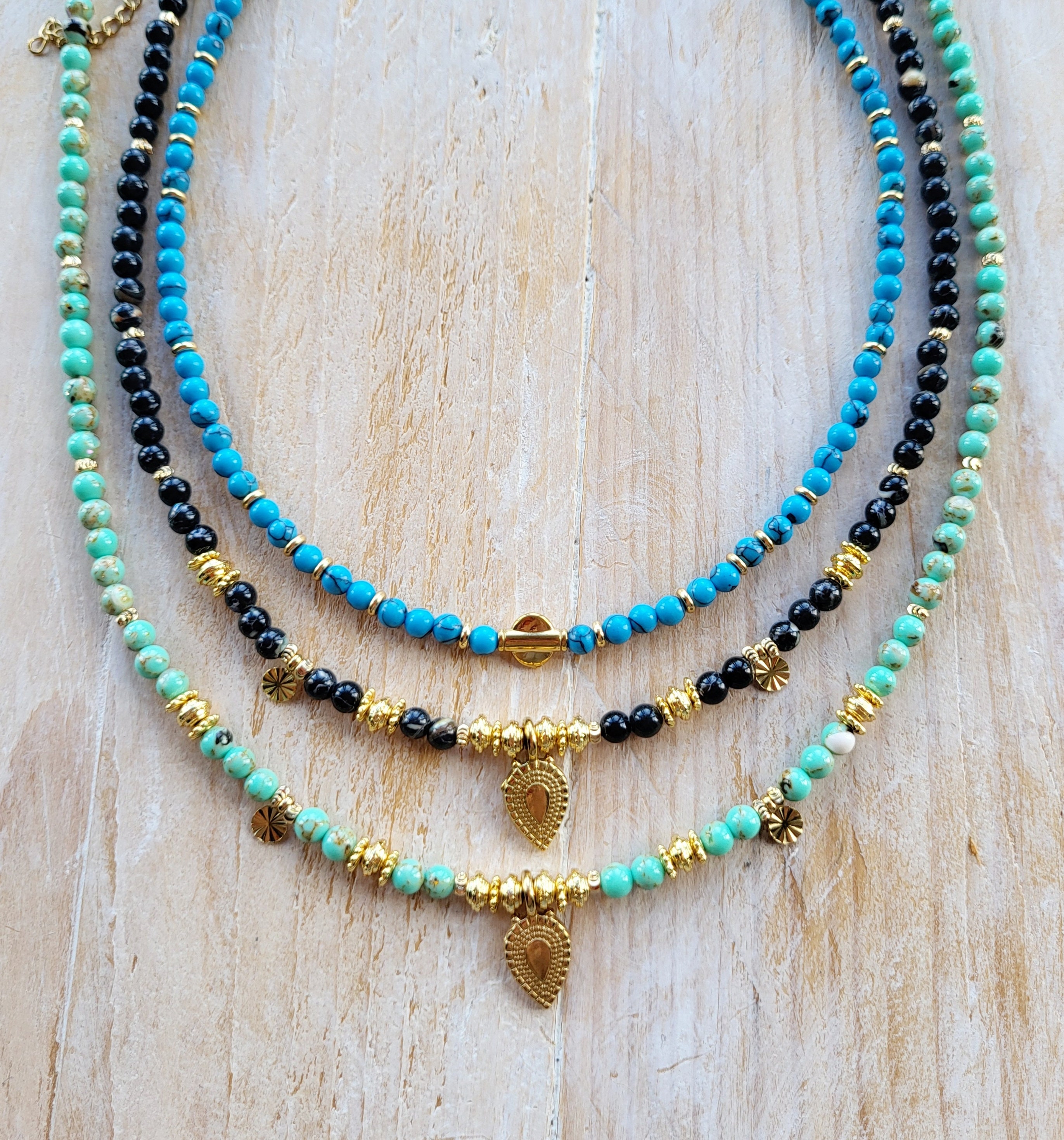 2. Sea shell and synthetic black turquoise gemstone beads with 18k gold plated beads, pendants, charms and fastenings.