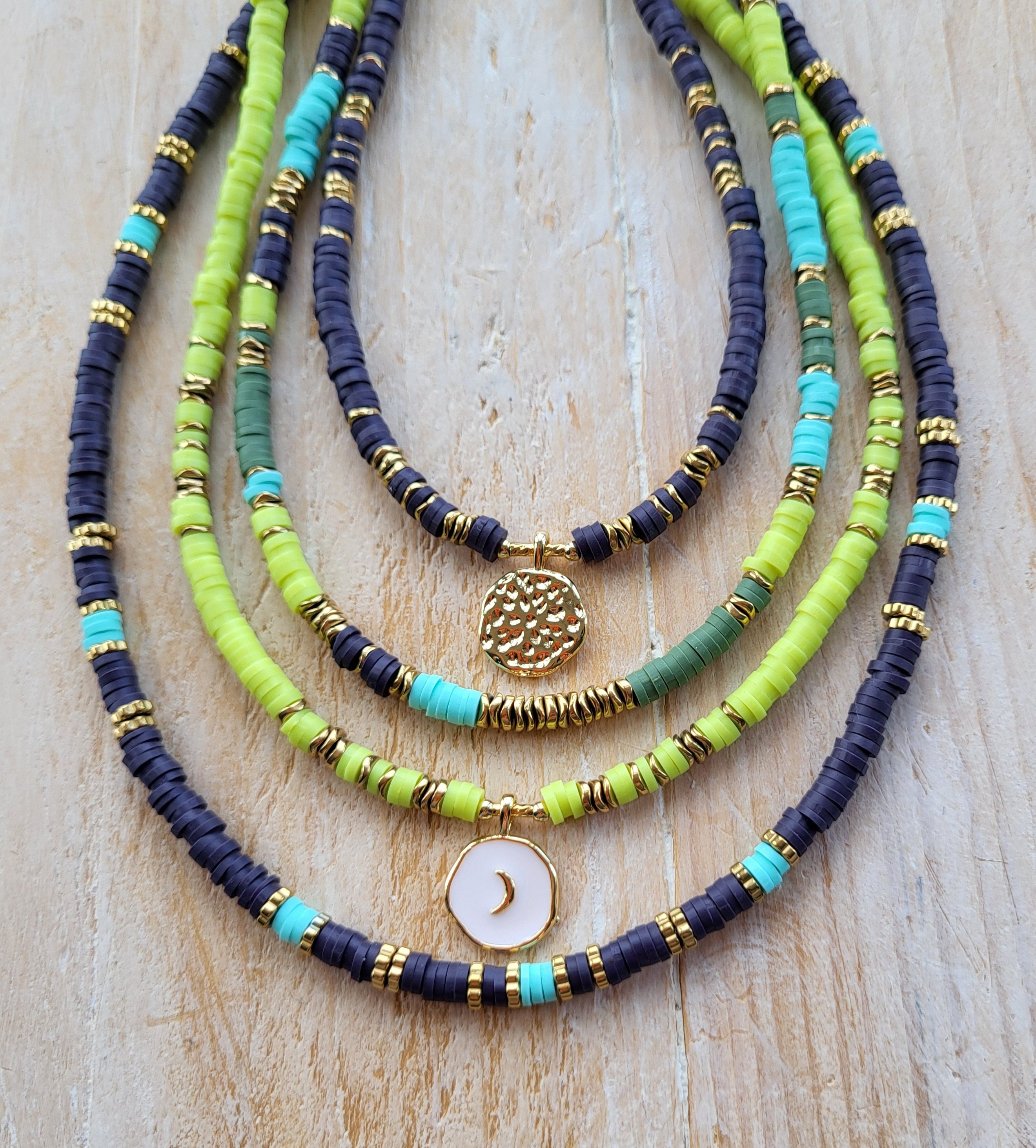 Heishi bead necklaces in polymer clay beads, all with 18k gold plated hematite beads and 18k gold plated fastenings and findings.