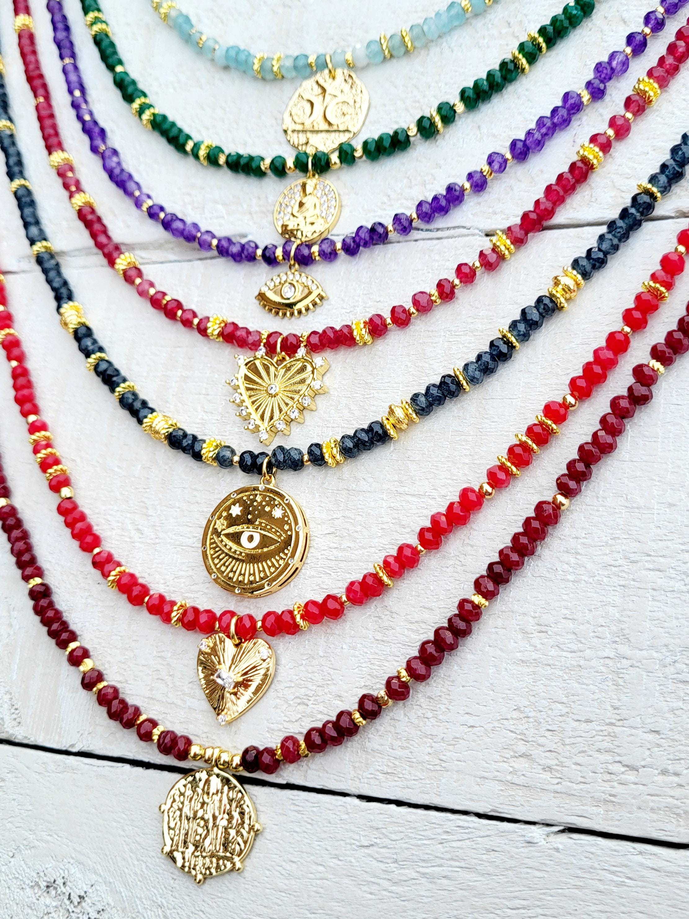 Choose from 7 gemstone necklaces...All 4mm dyed malaysian jade beads with 18k gold plated beads and pendants