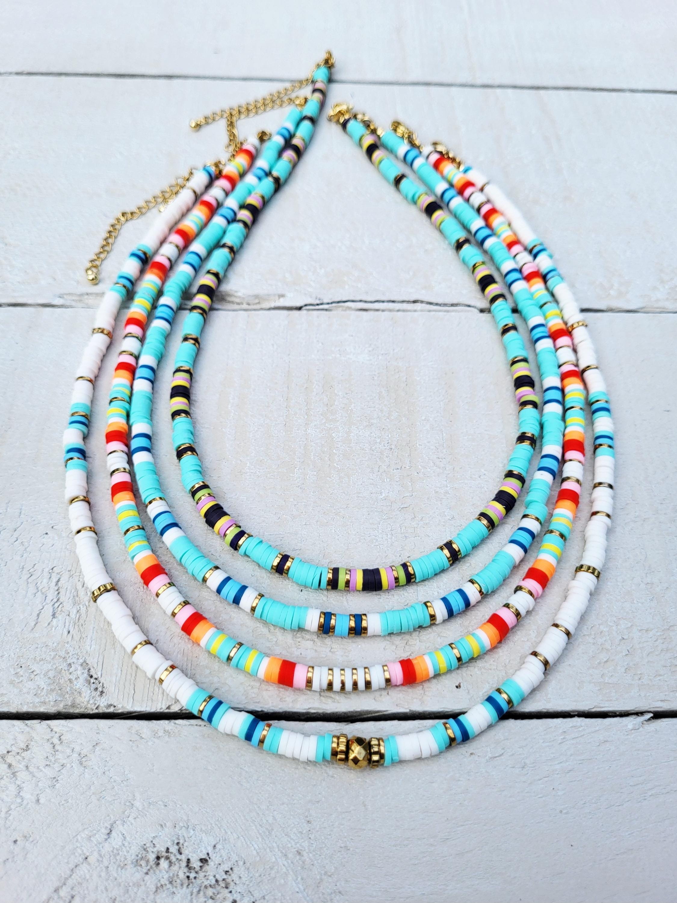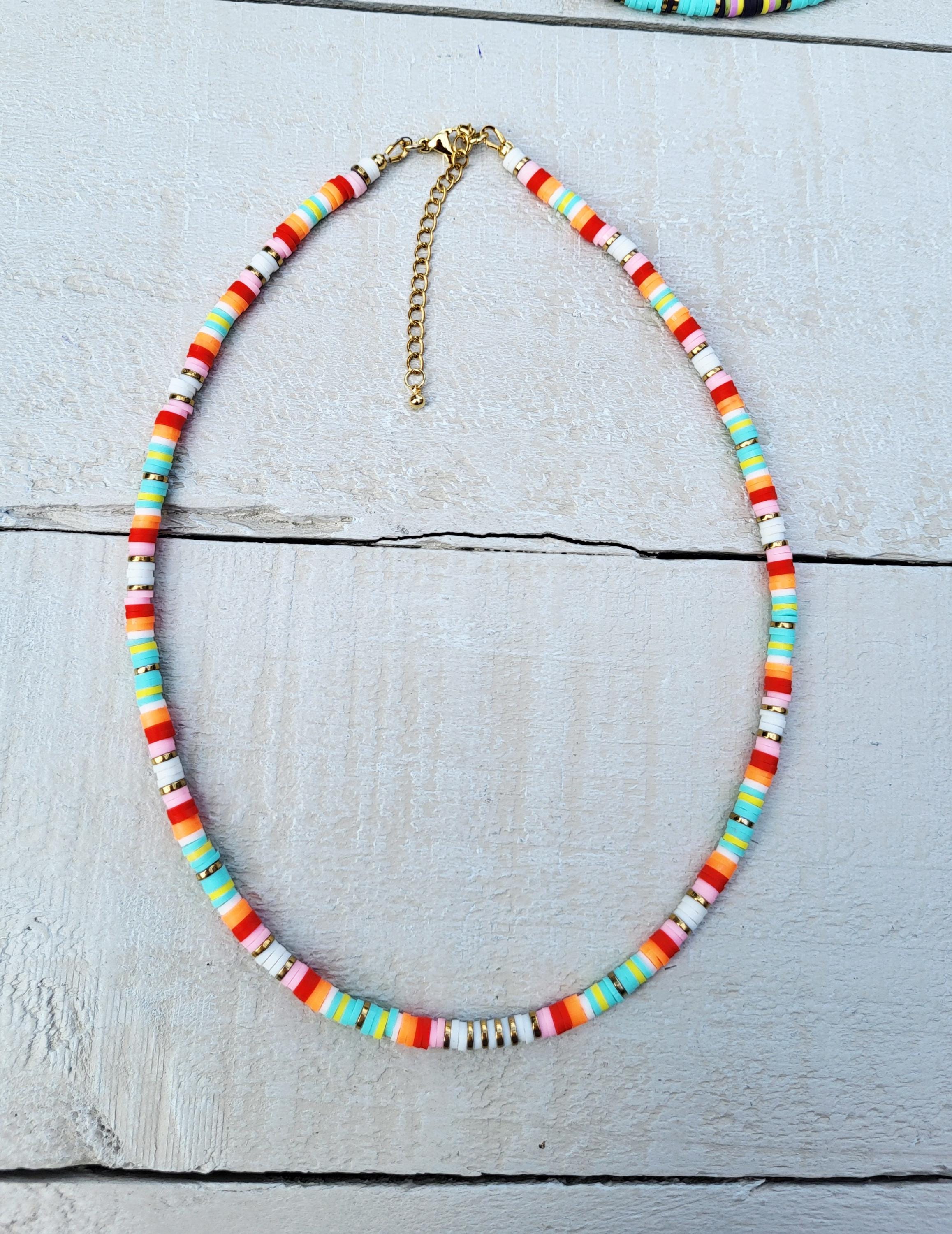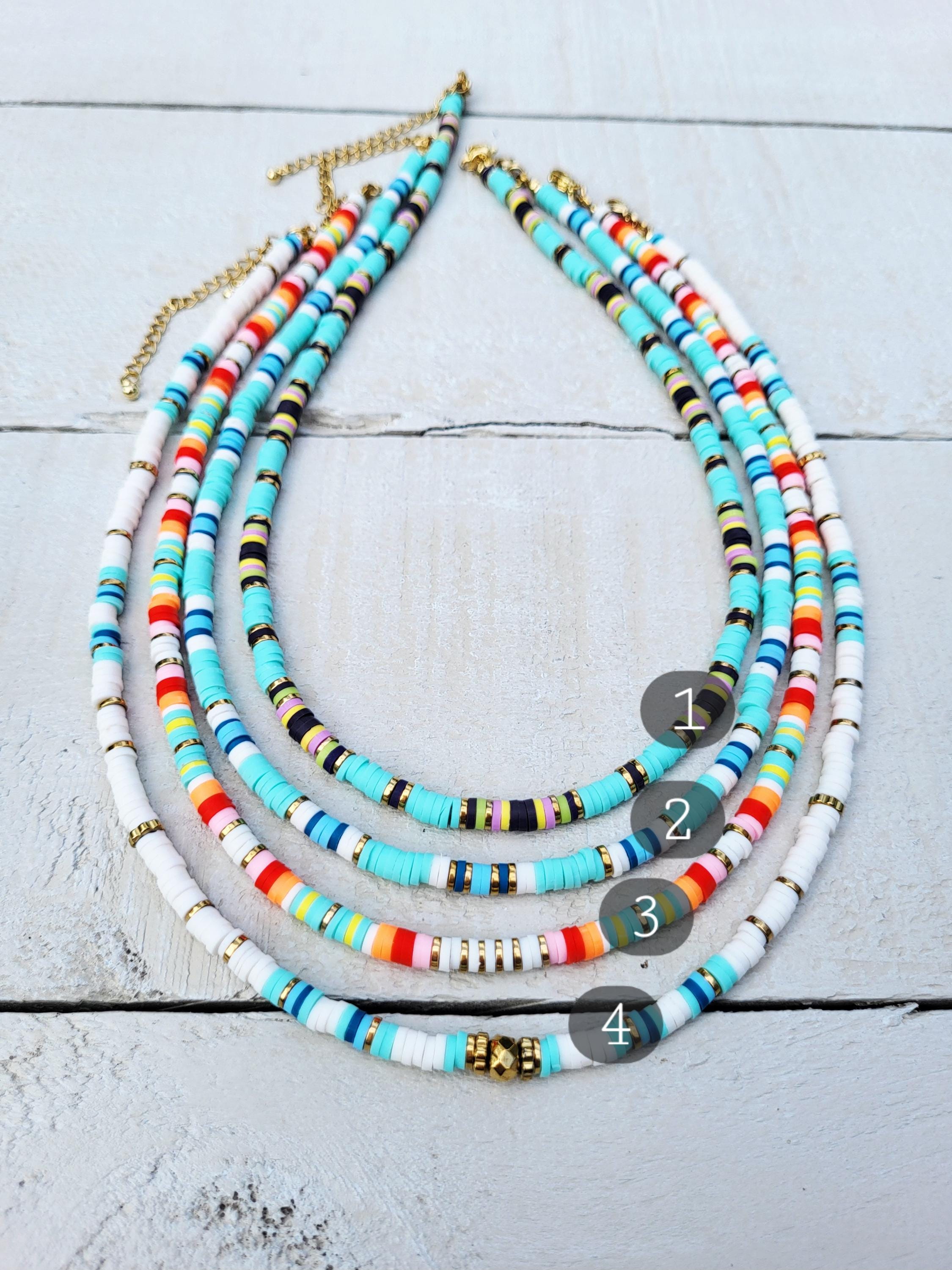 Heishi bead necklaces in polymer clay with 18k gold plated hematite beads and