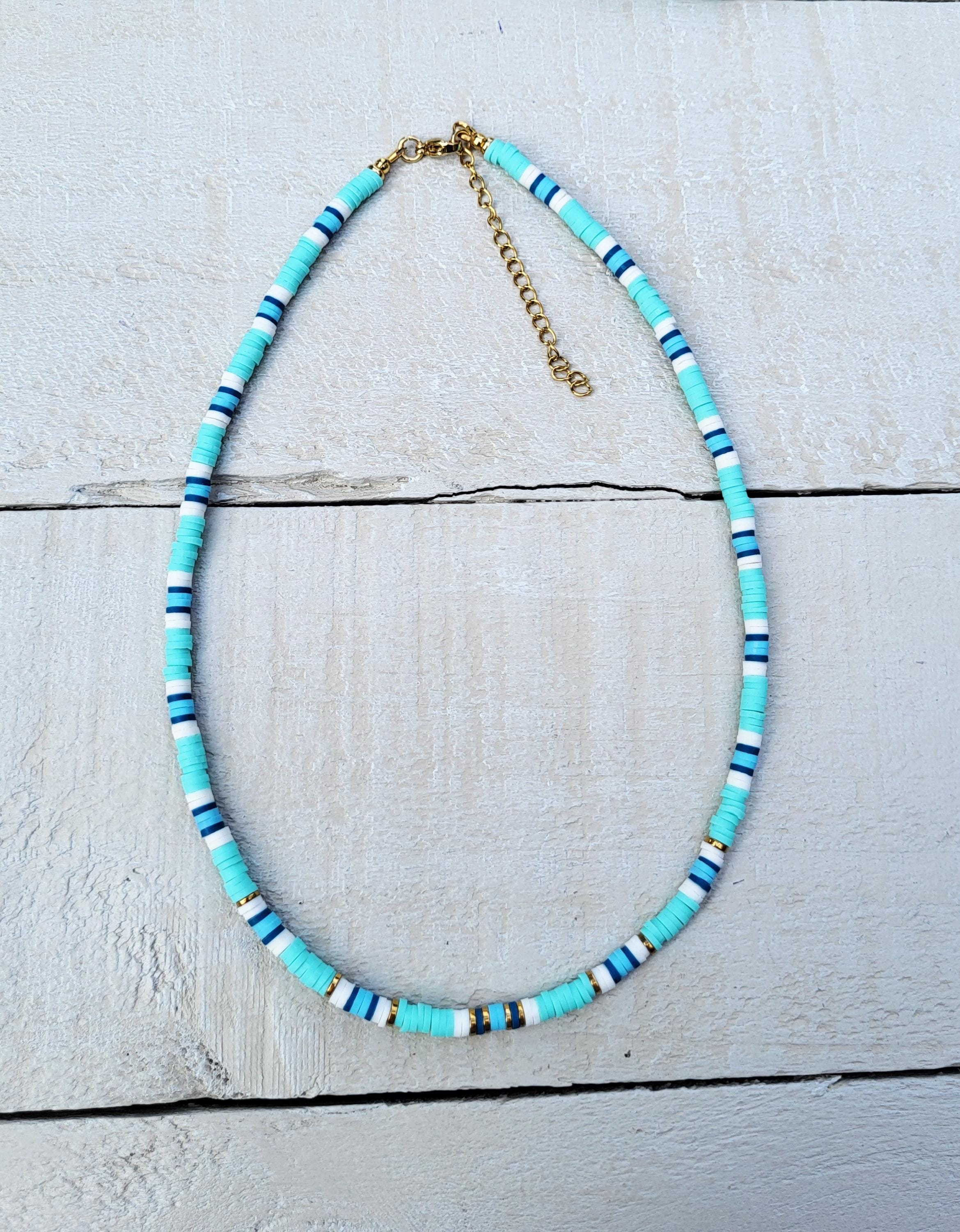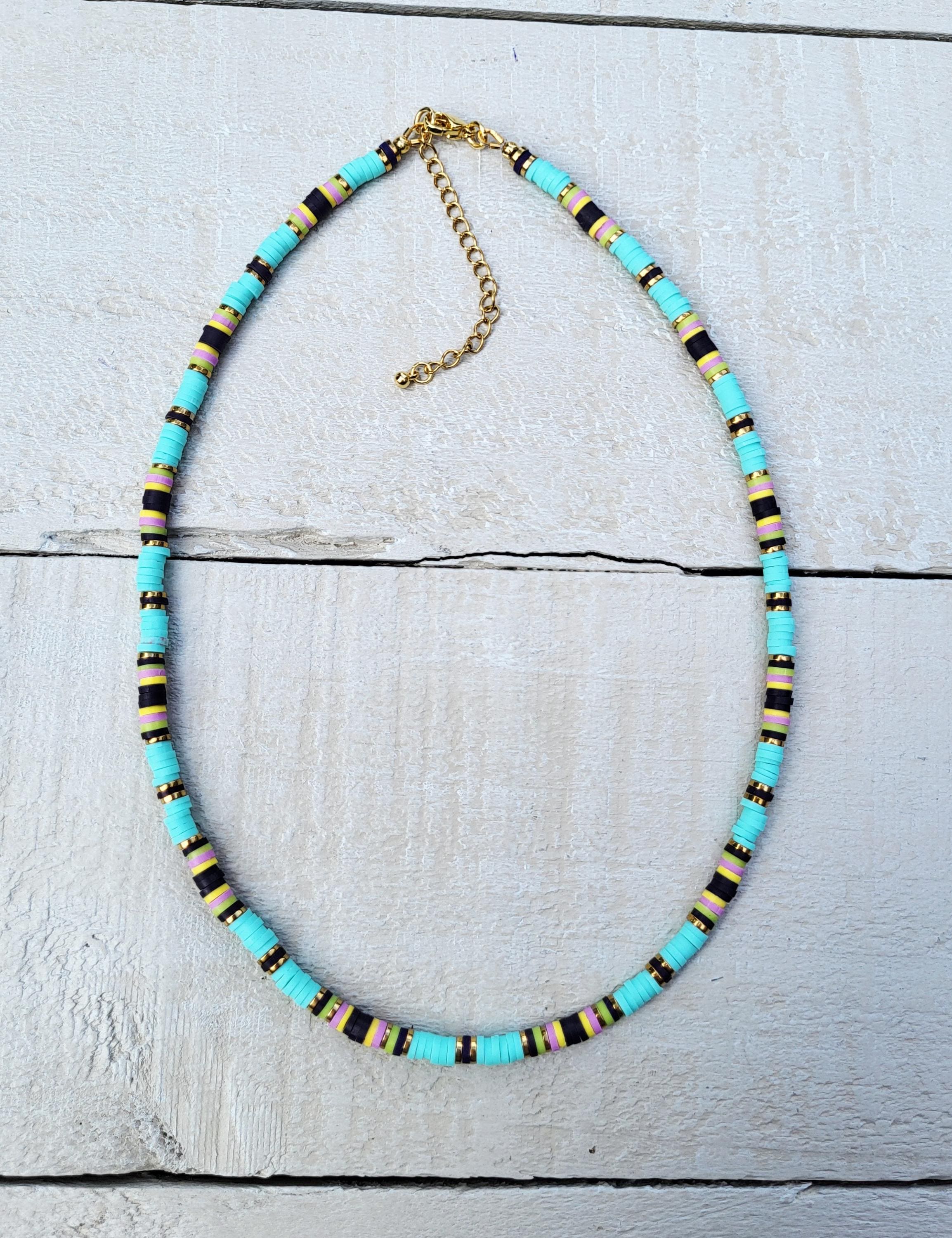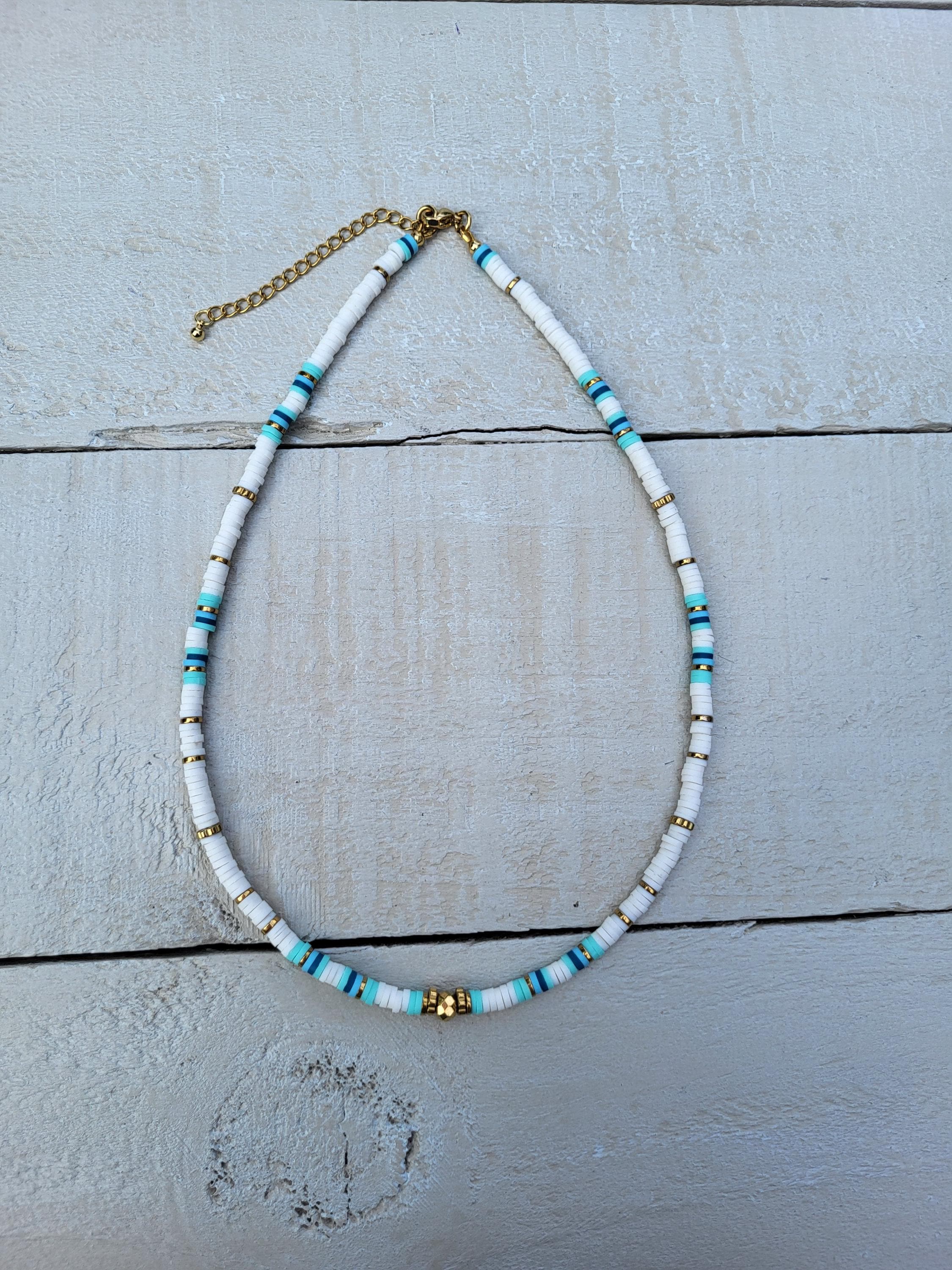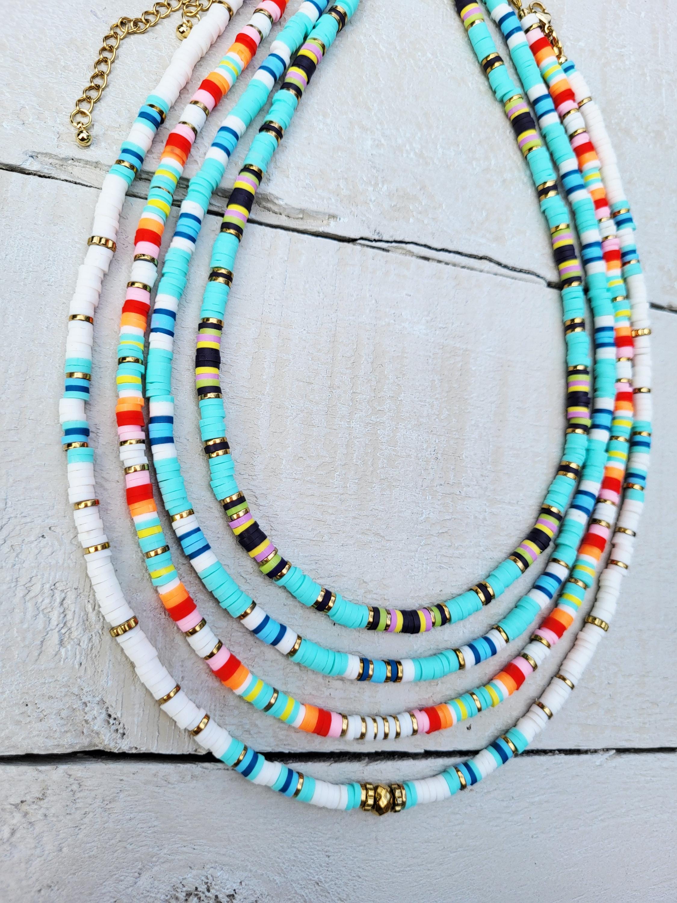 Heishi bead necklaces in polymer clay with 18k gold plated hematite beads and