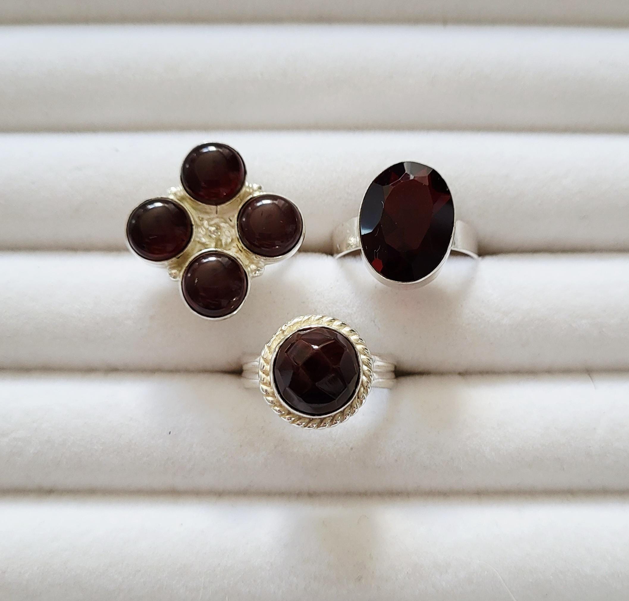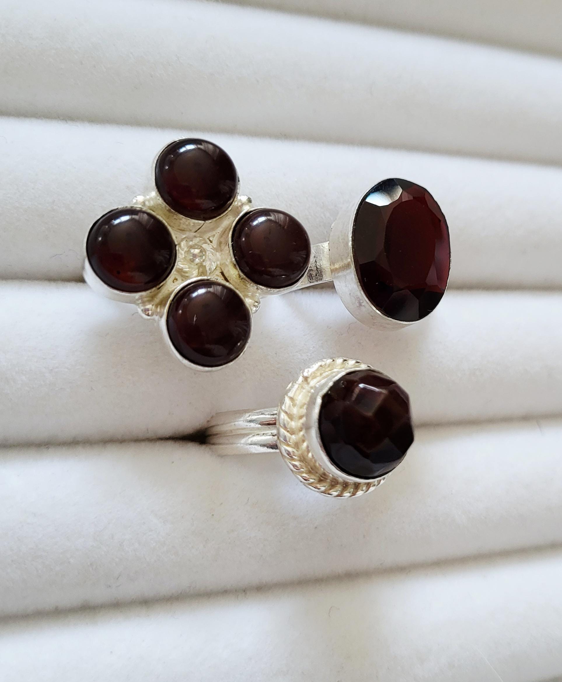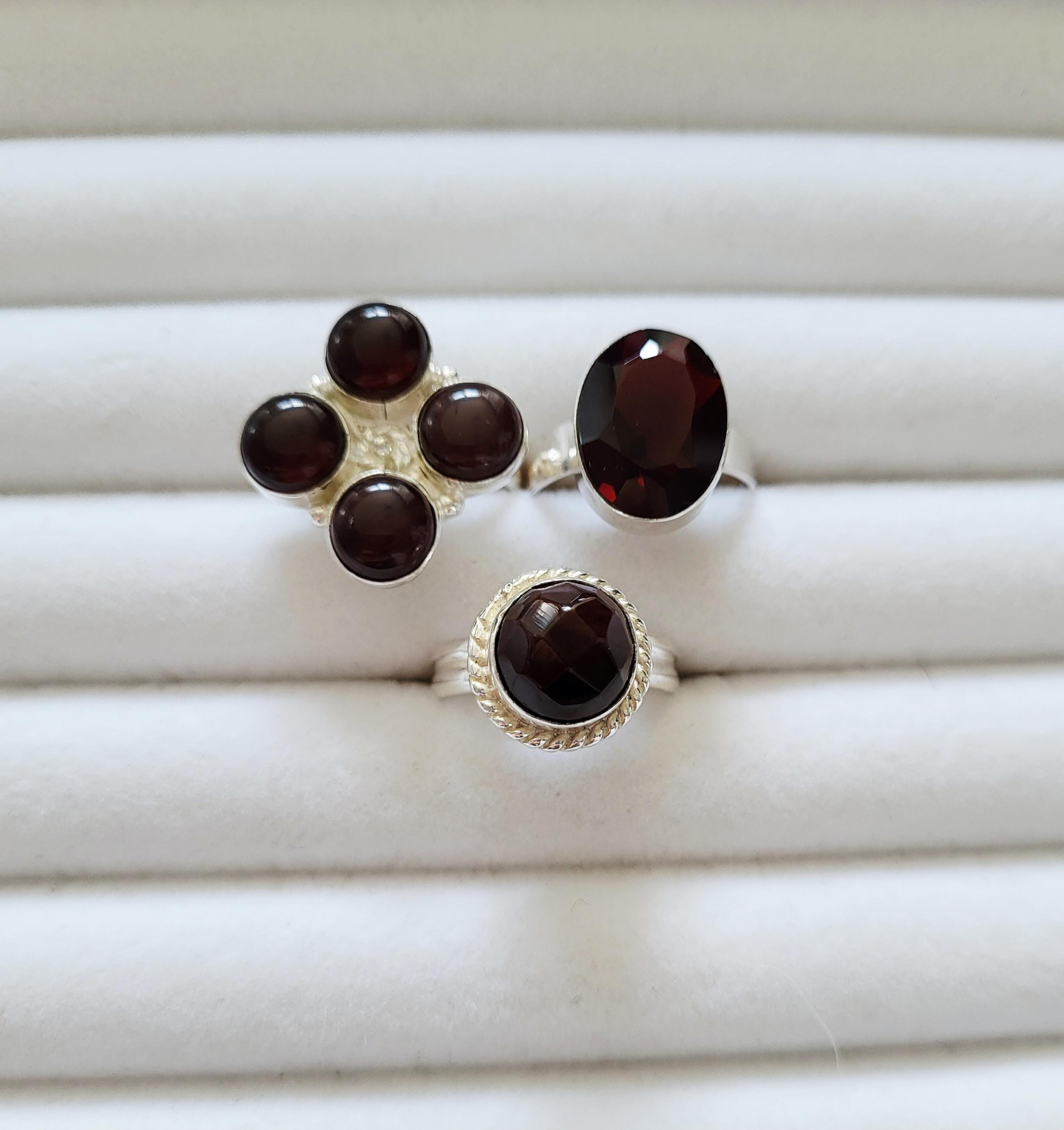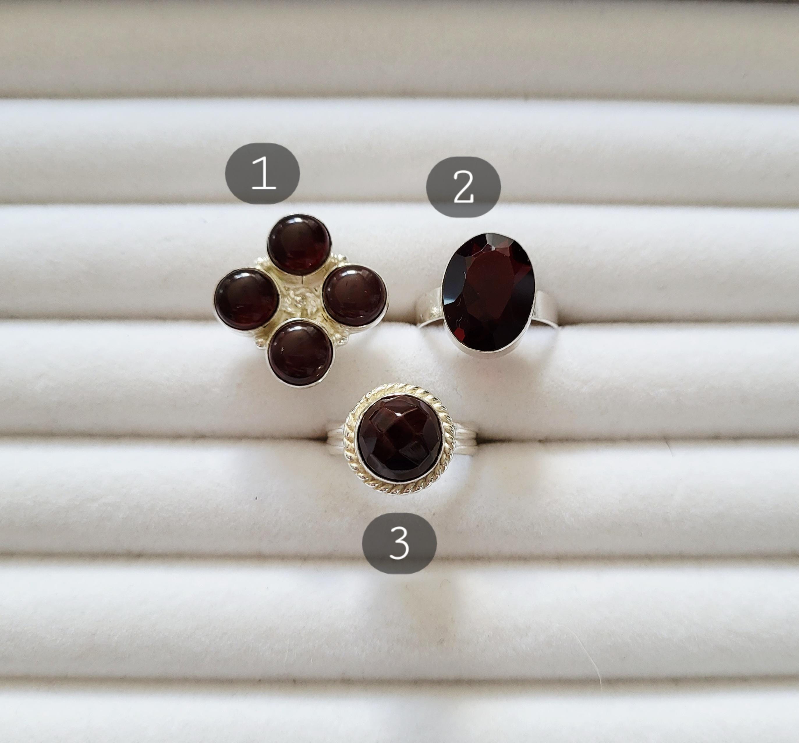 Choose from 3 different deep red garnet rings, all 925 silver plated