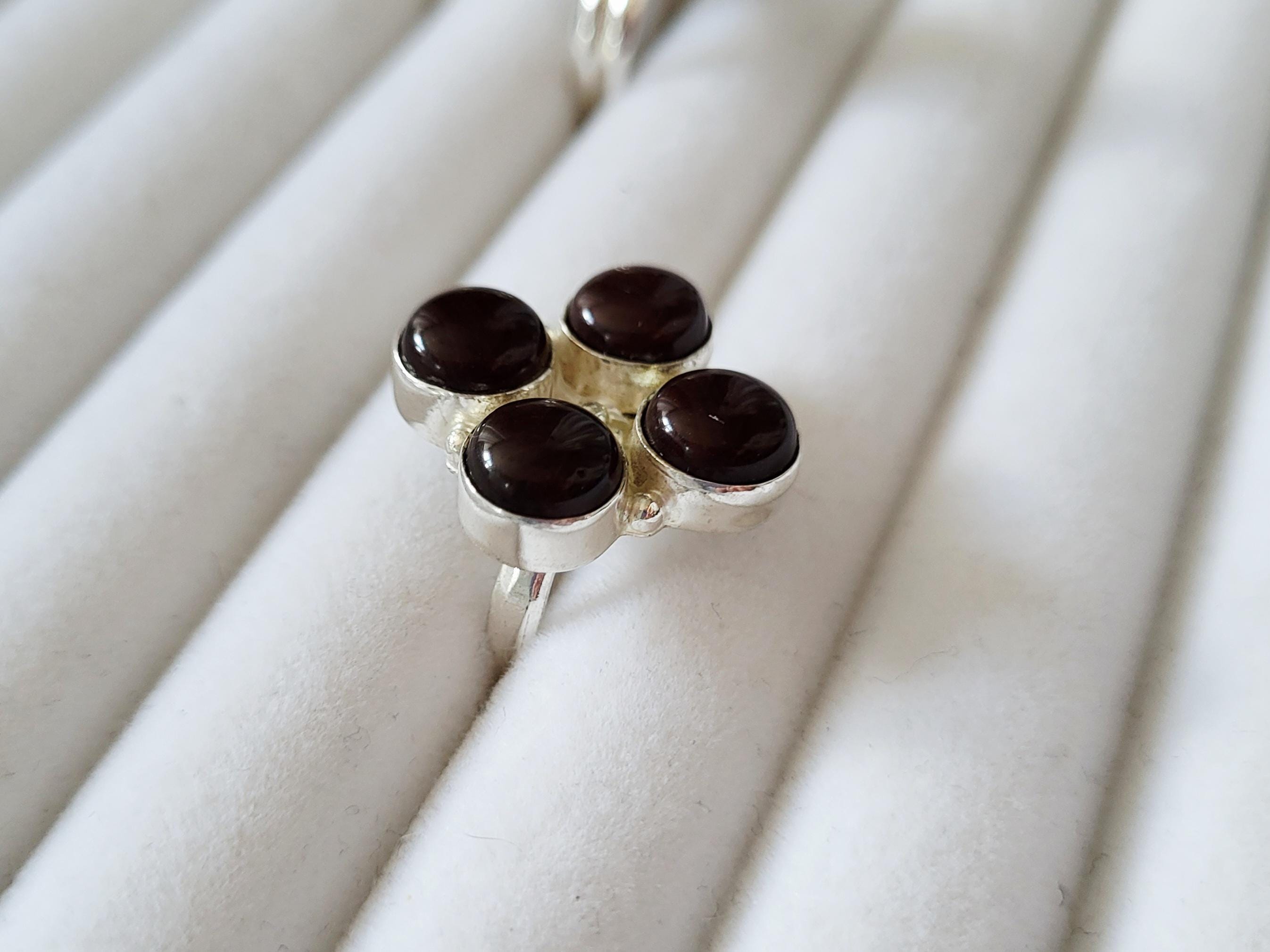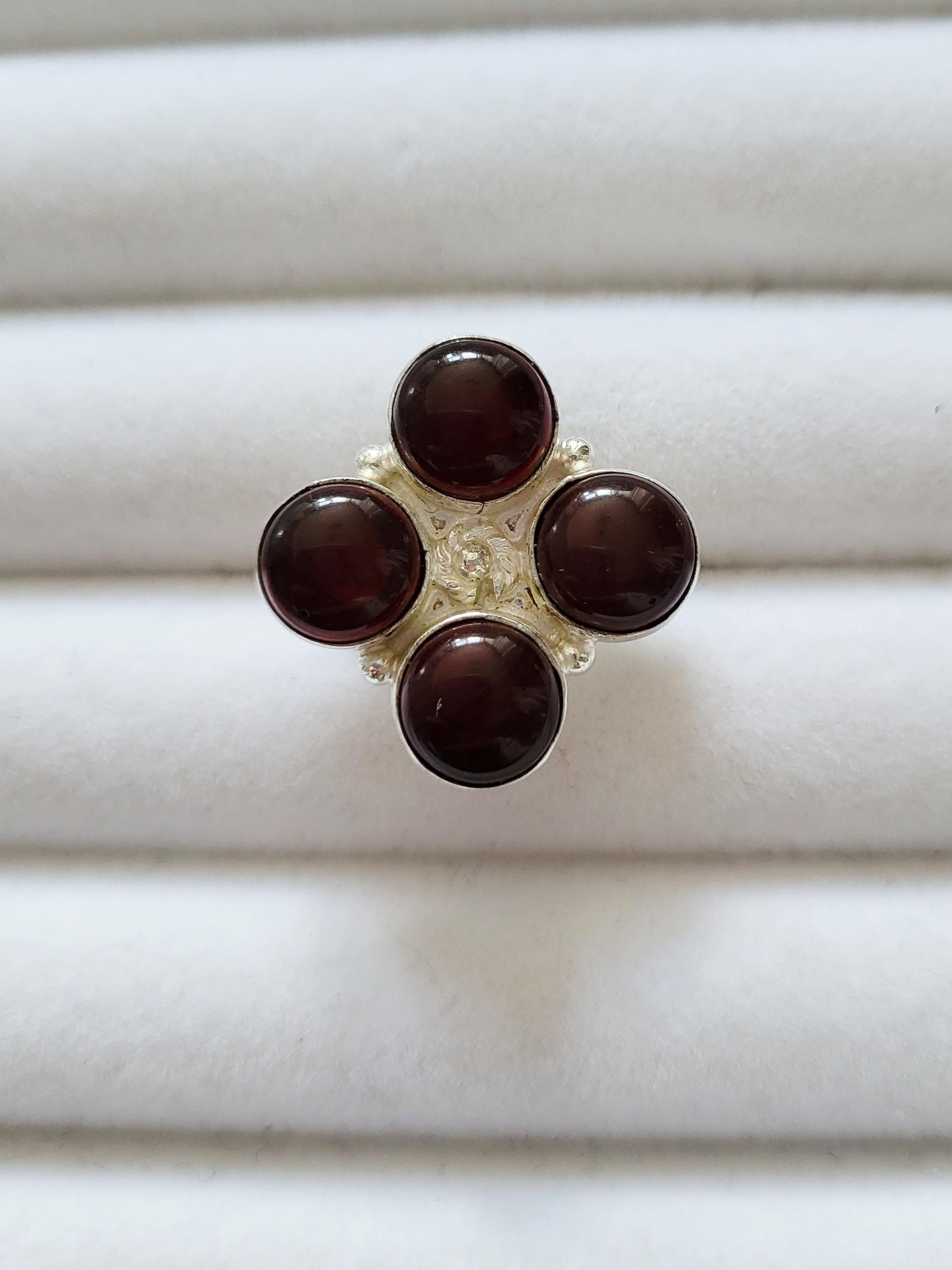 4 round smooth garnet gemstones make up this lovely ring.