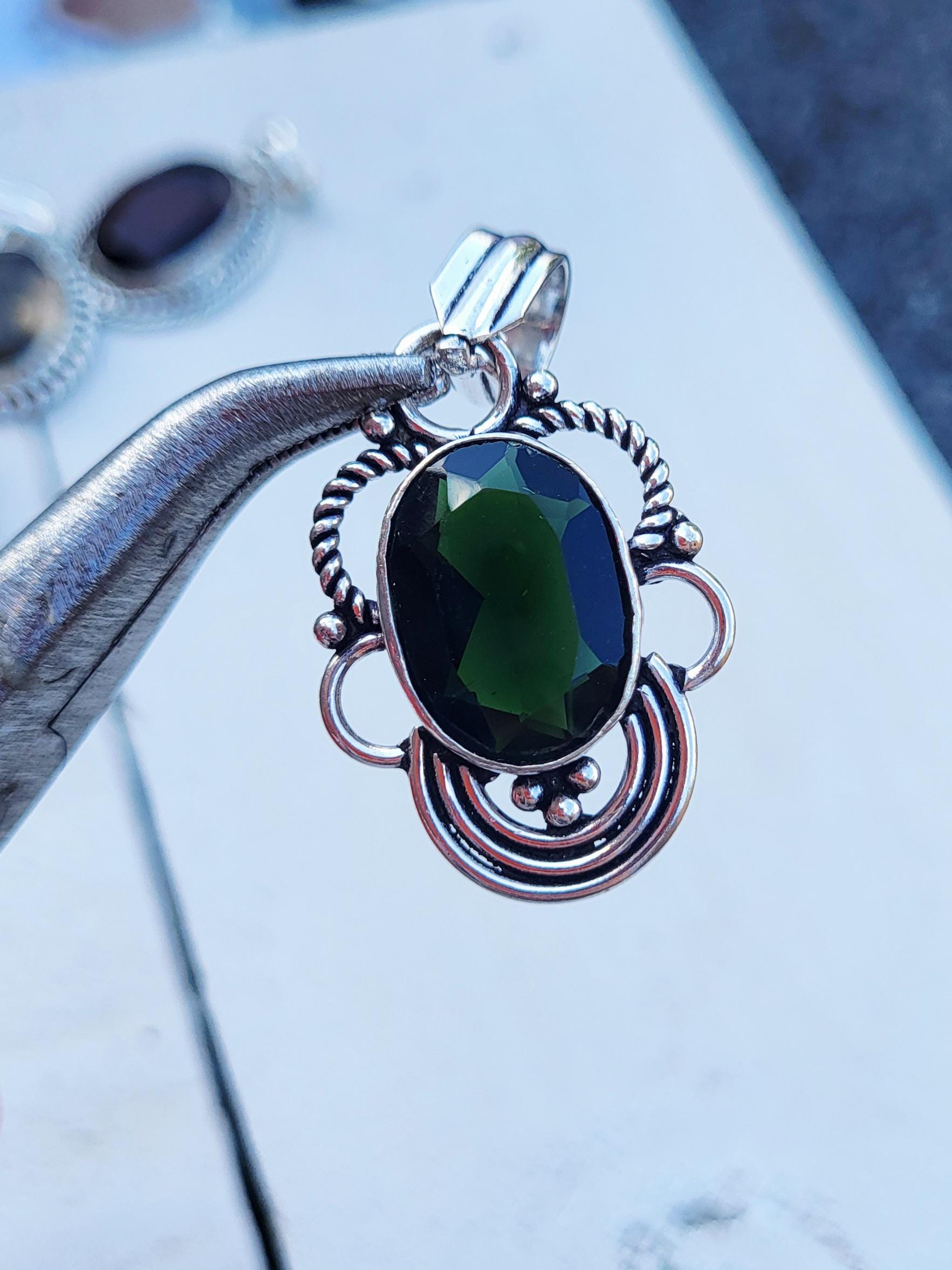 DIOPSIDE deep green oval faceted stone in a decorative setting.