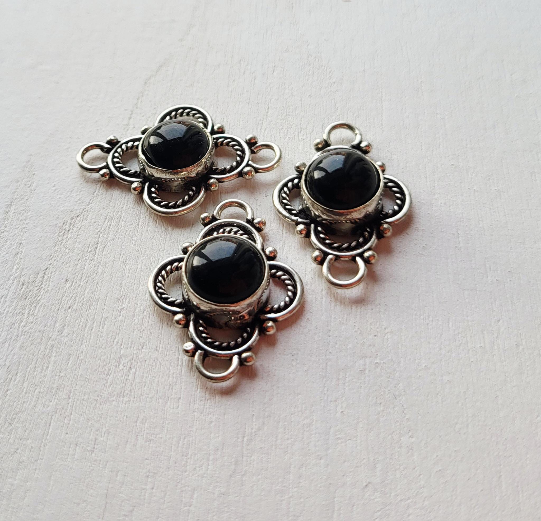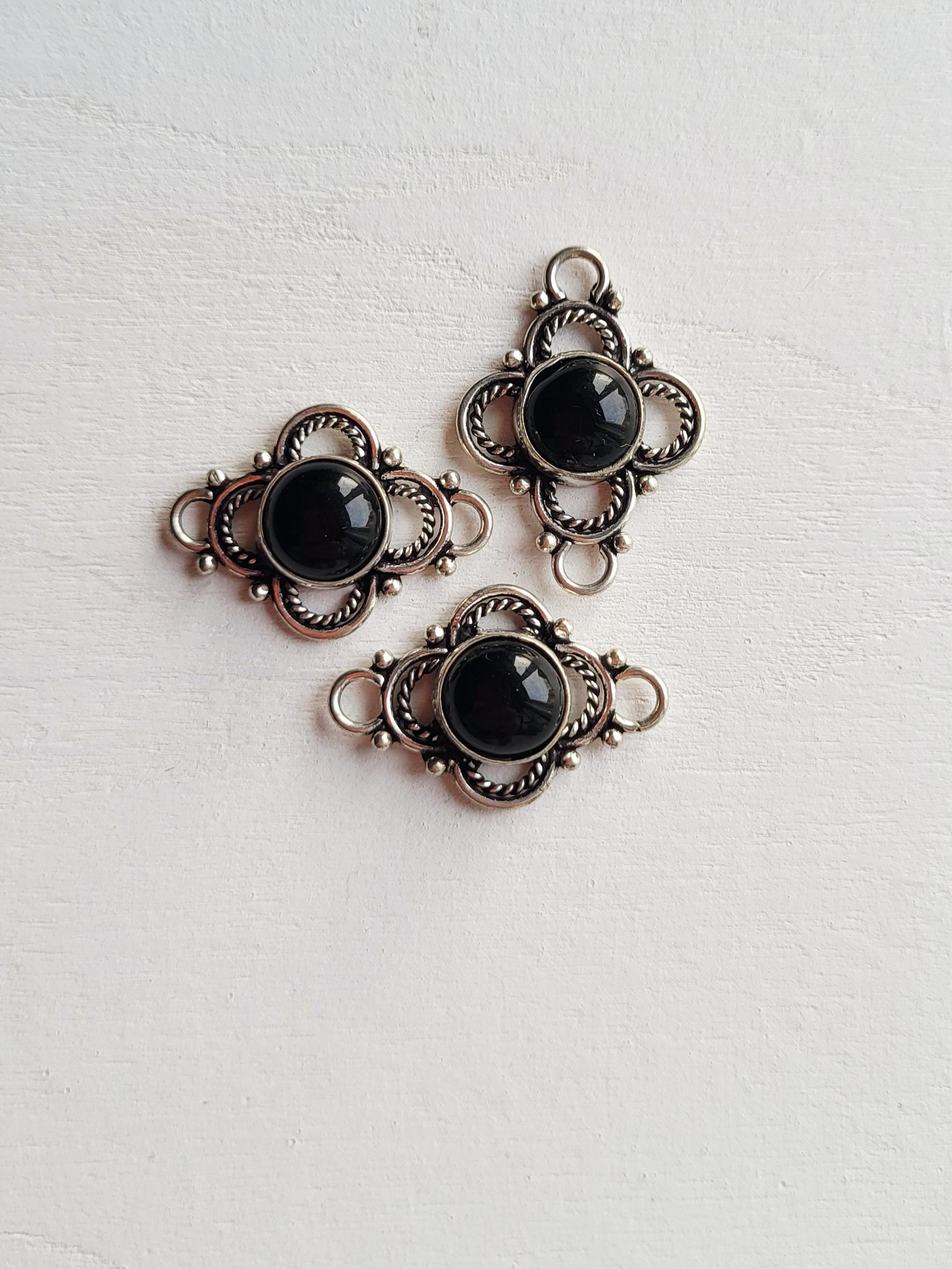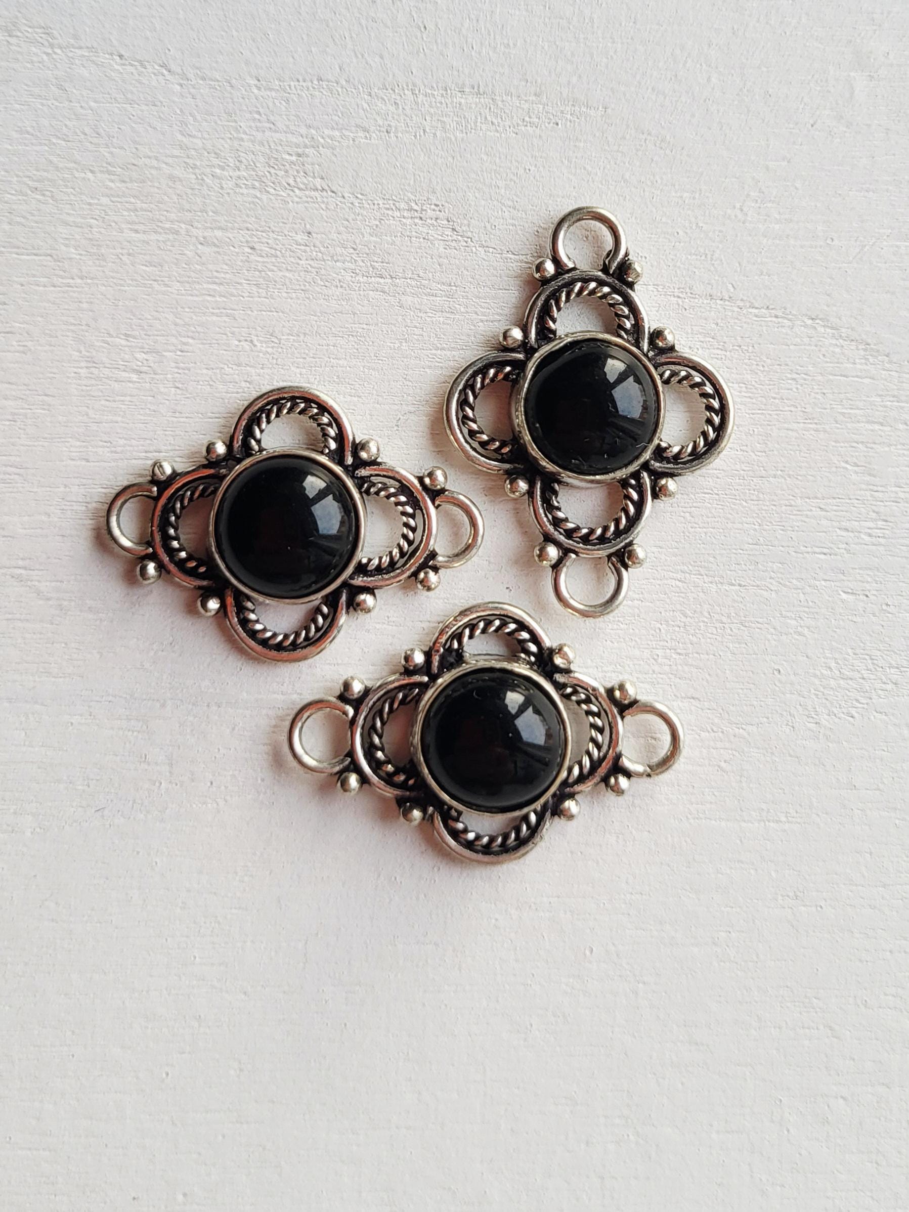 Round black onyx stones in pretty 925 silver plated settings. Great connectors for all kinds of jewellery making
