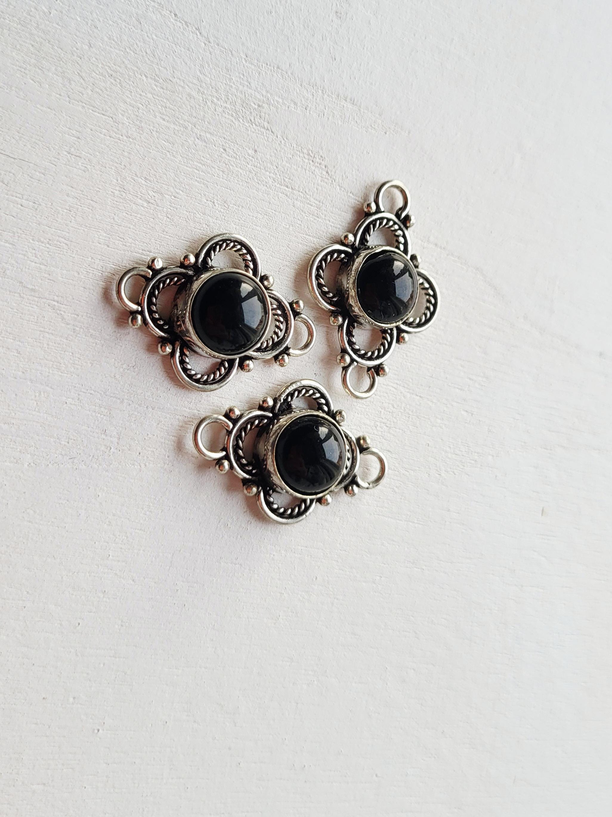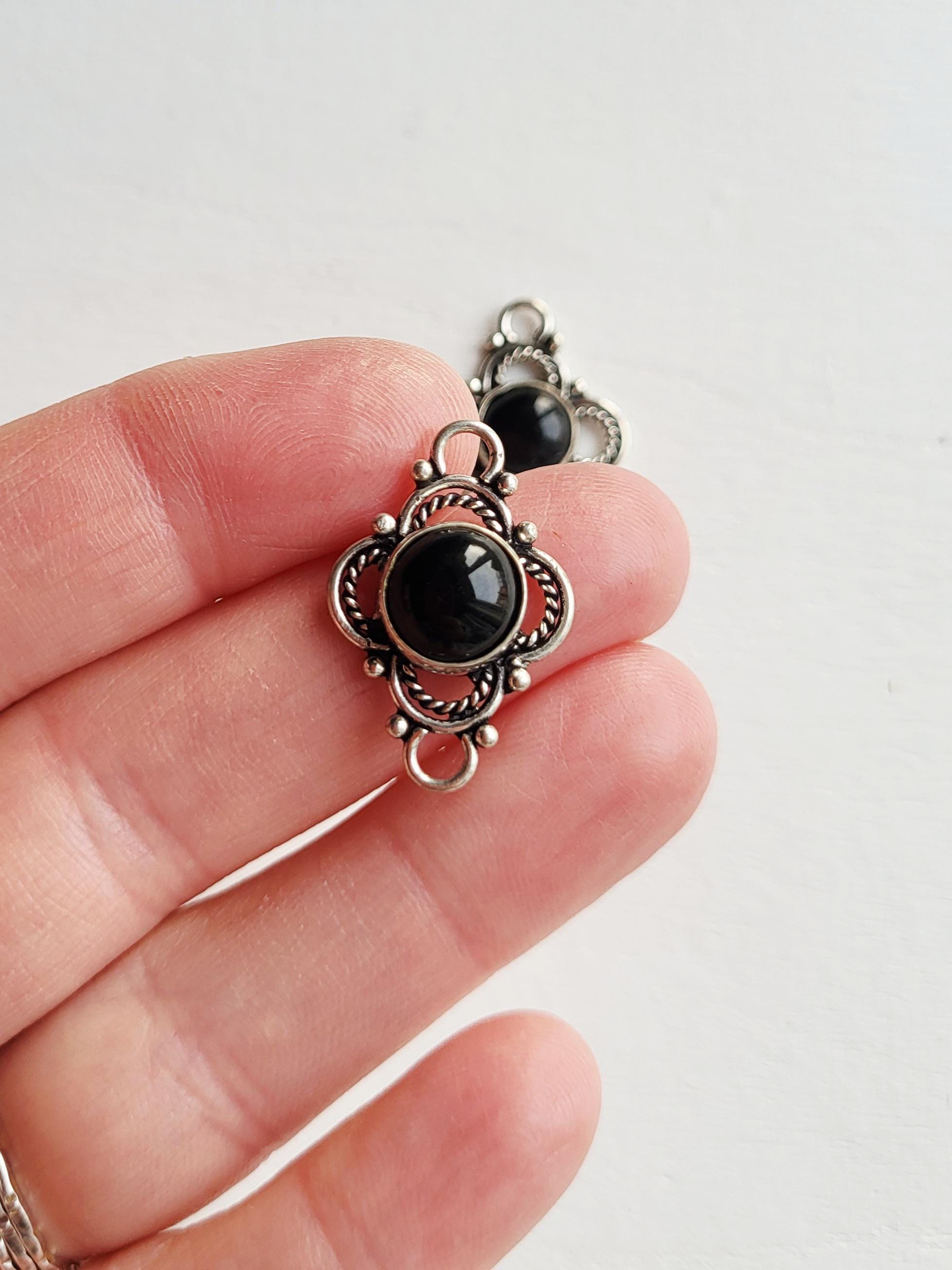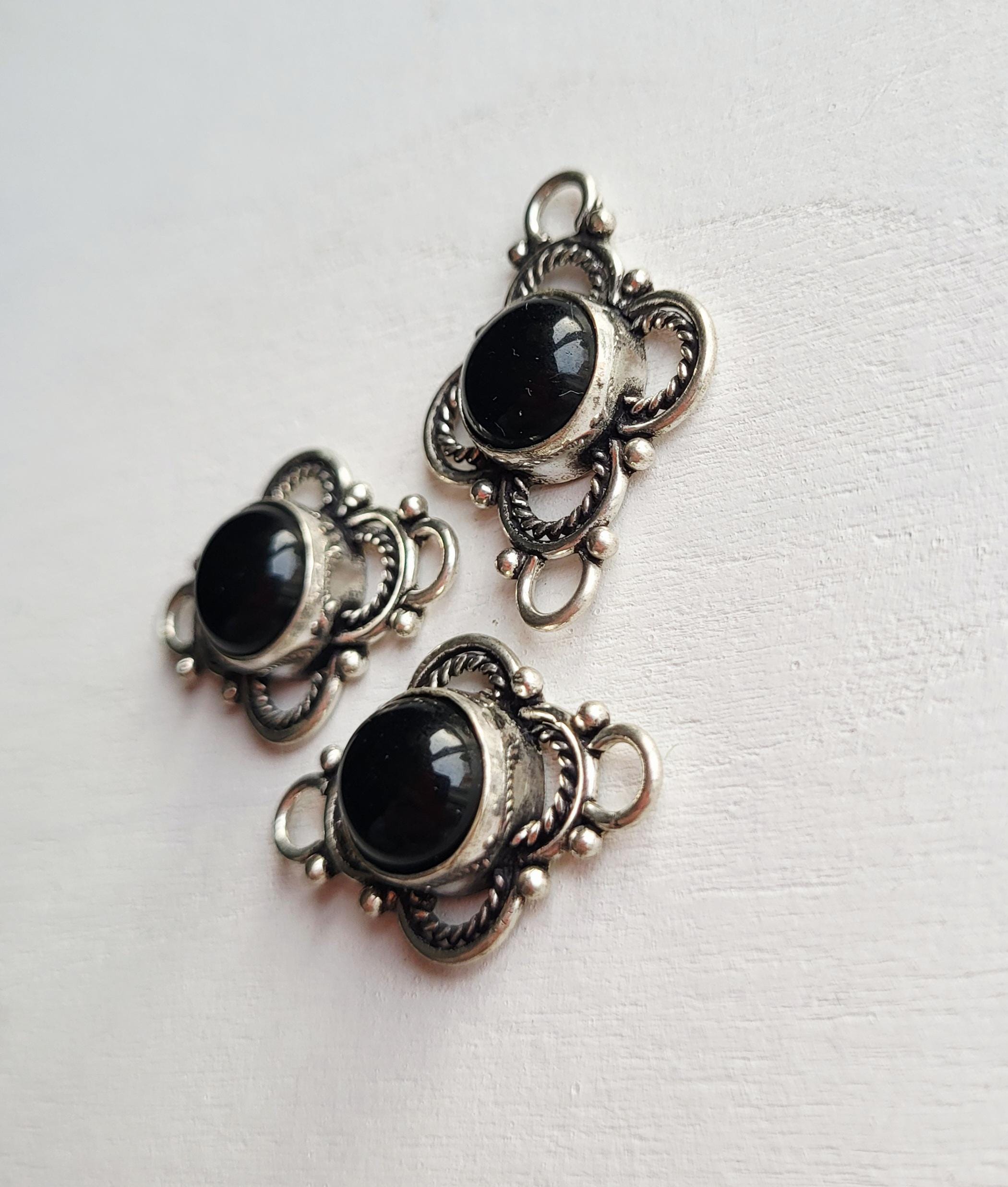 Round black onyx stones in pretty 925 silver plated settings. Great connectors for all kinds of jewellery making
