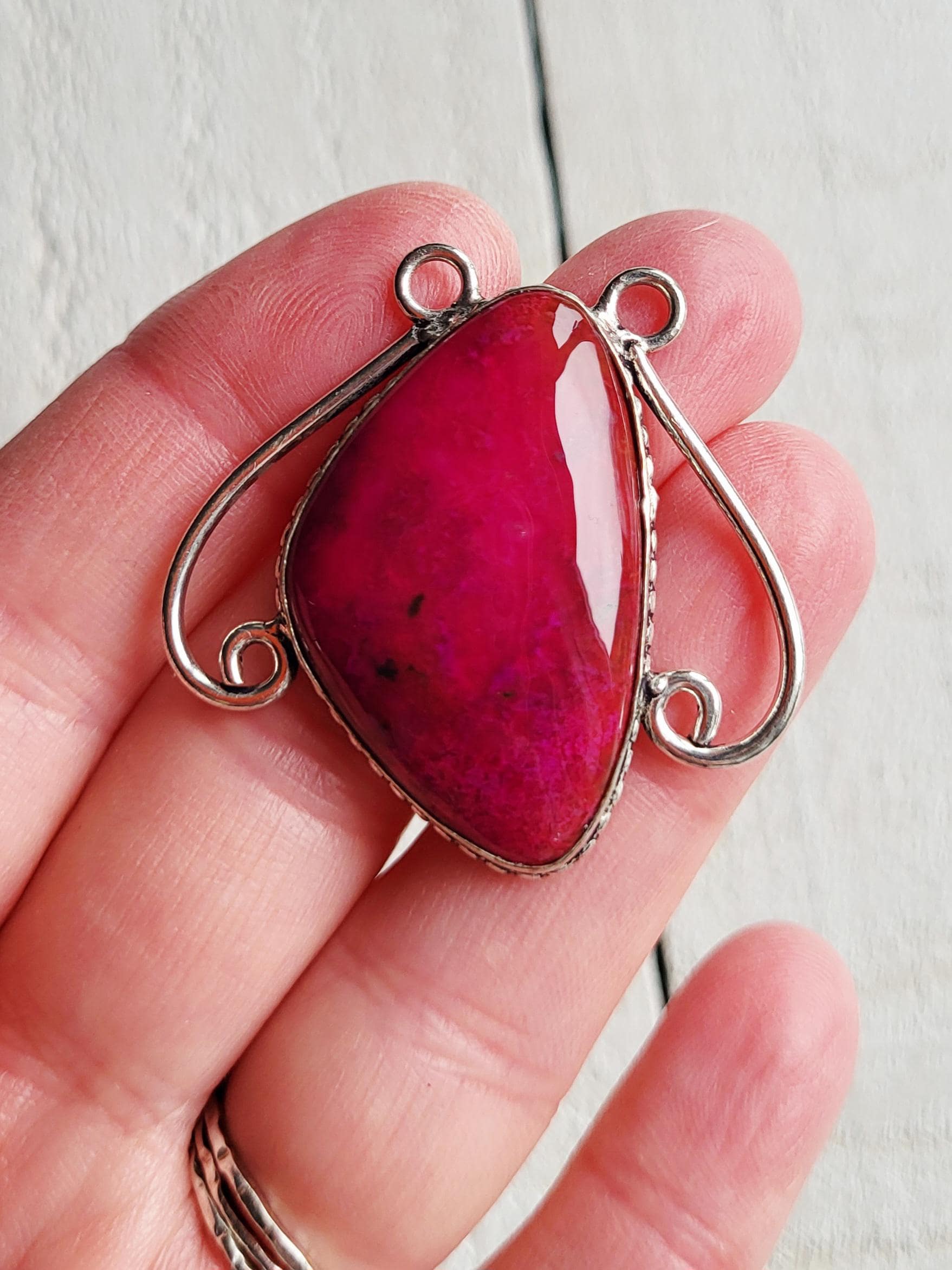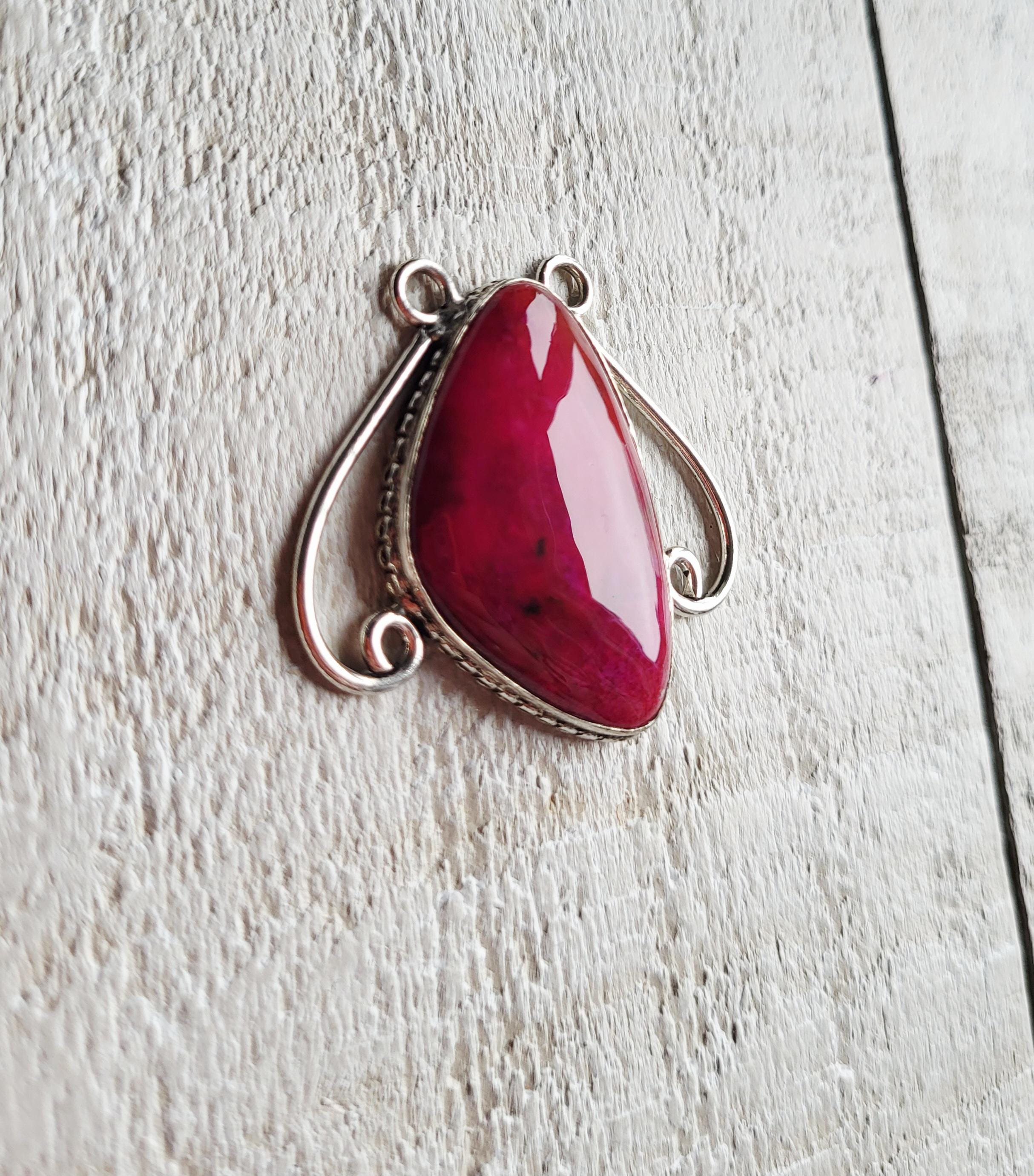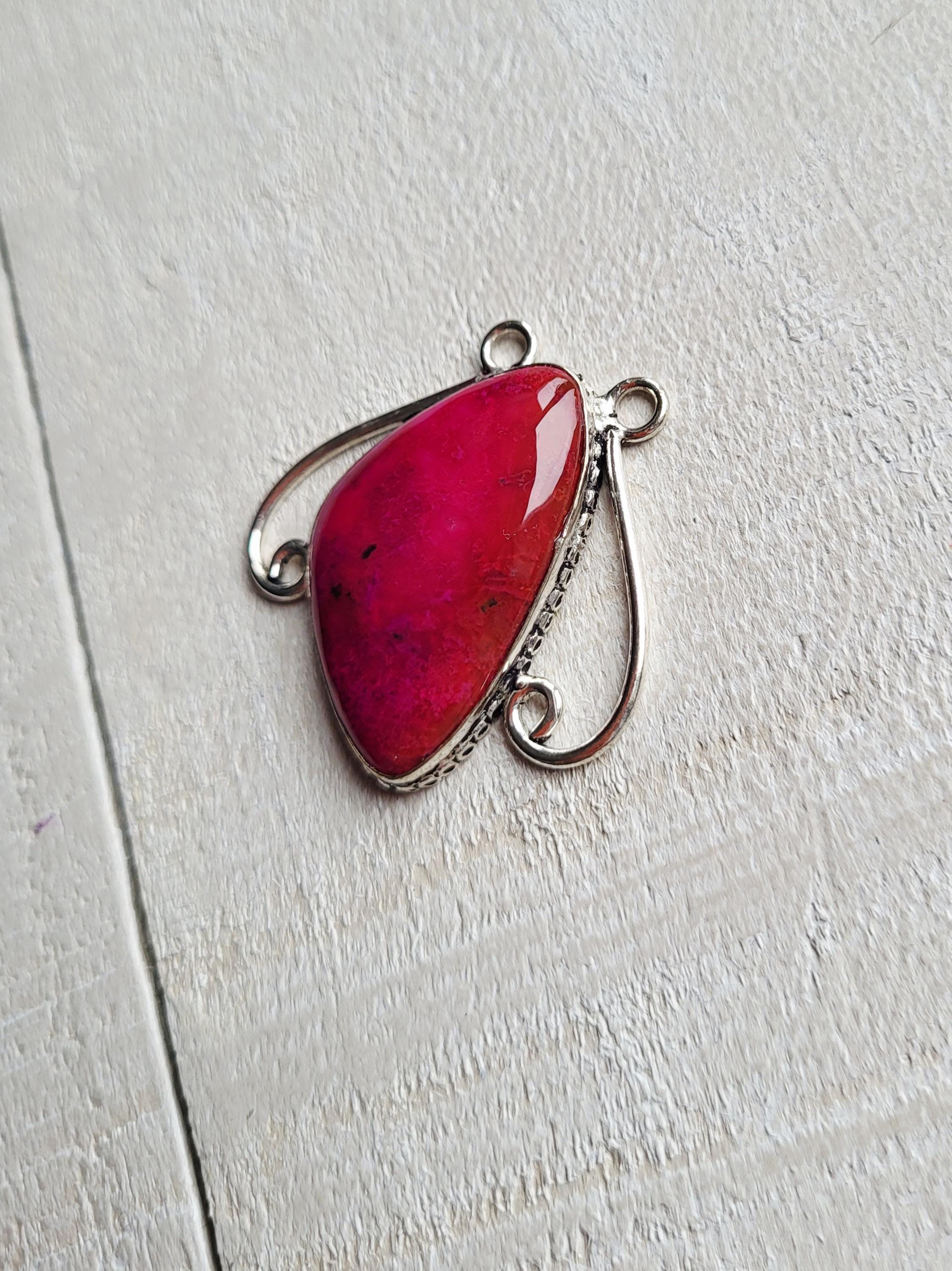 The correct name is purple jasper but this is more pink in colour. A smooth polished stone in a pretty setting with 2 holes to use as a connector or pendant.