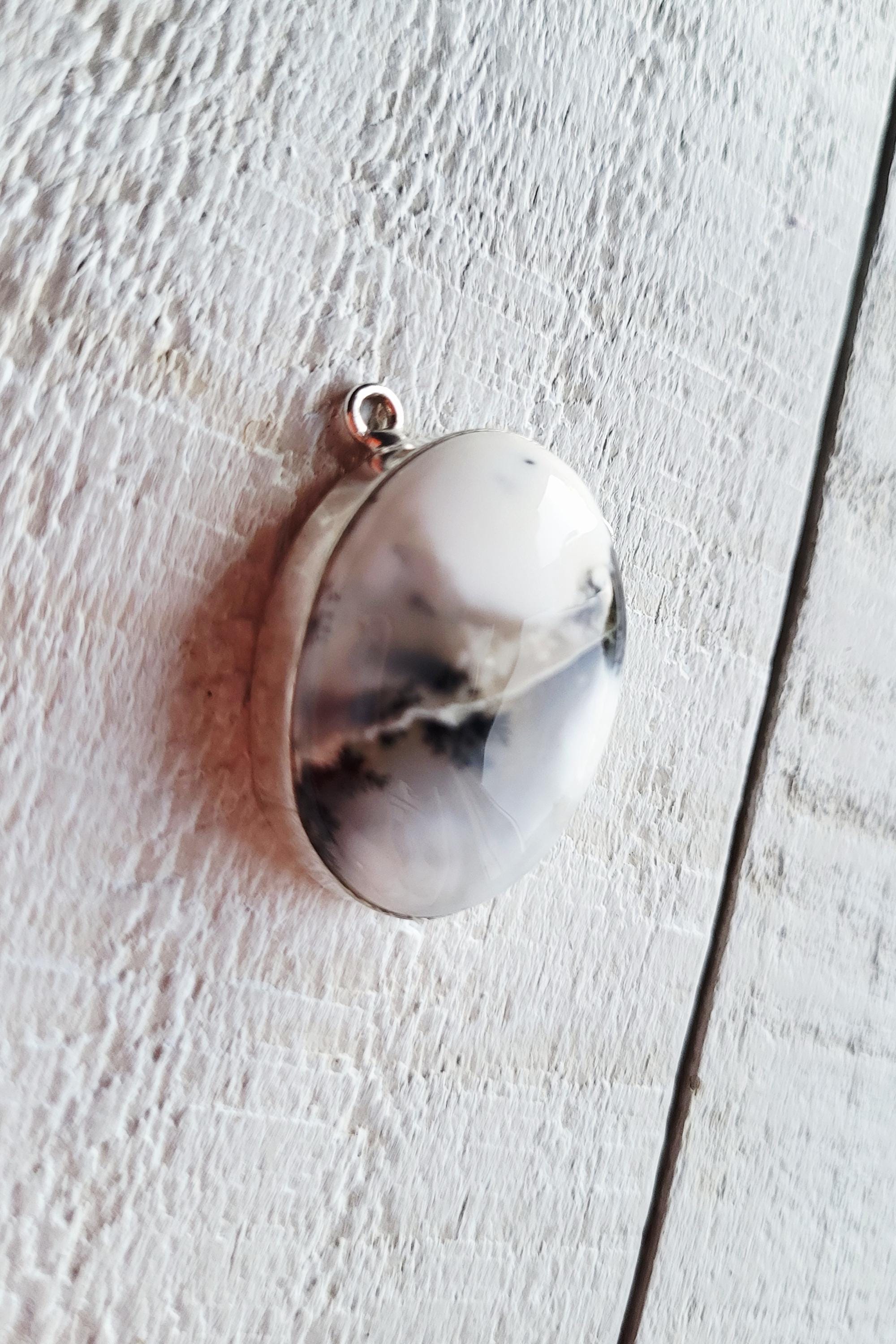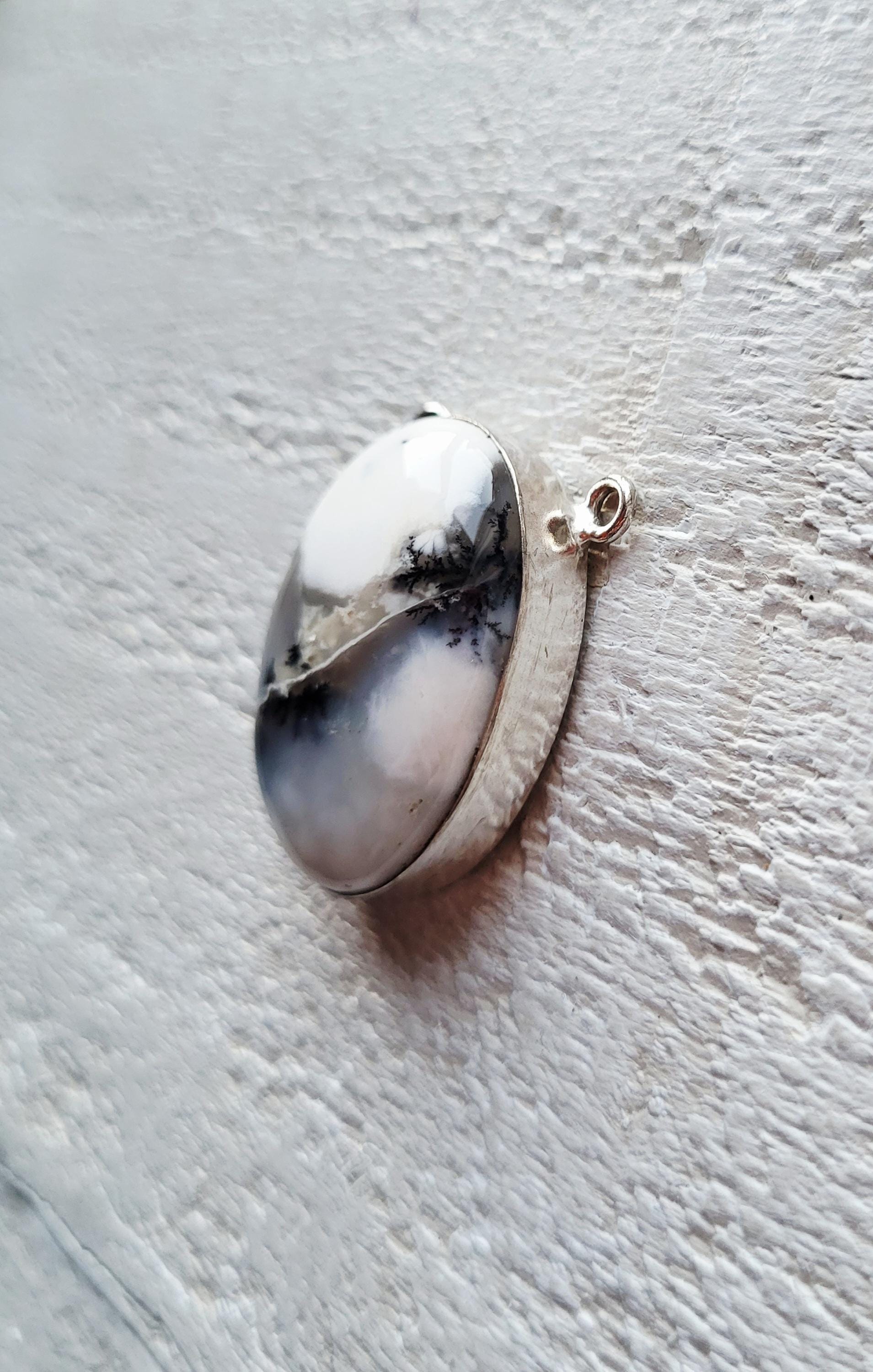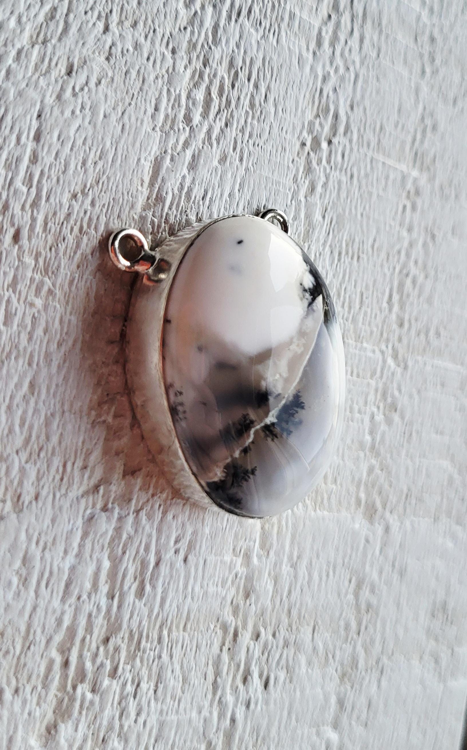A beautiful dendritic agate gemstone pendant. A smooth, polished stone set in a plain 925 silver plating setting with 2 holes. It looks almost like a wintery scene in white and shades of grey. I only have one piece.