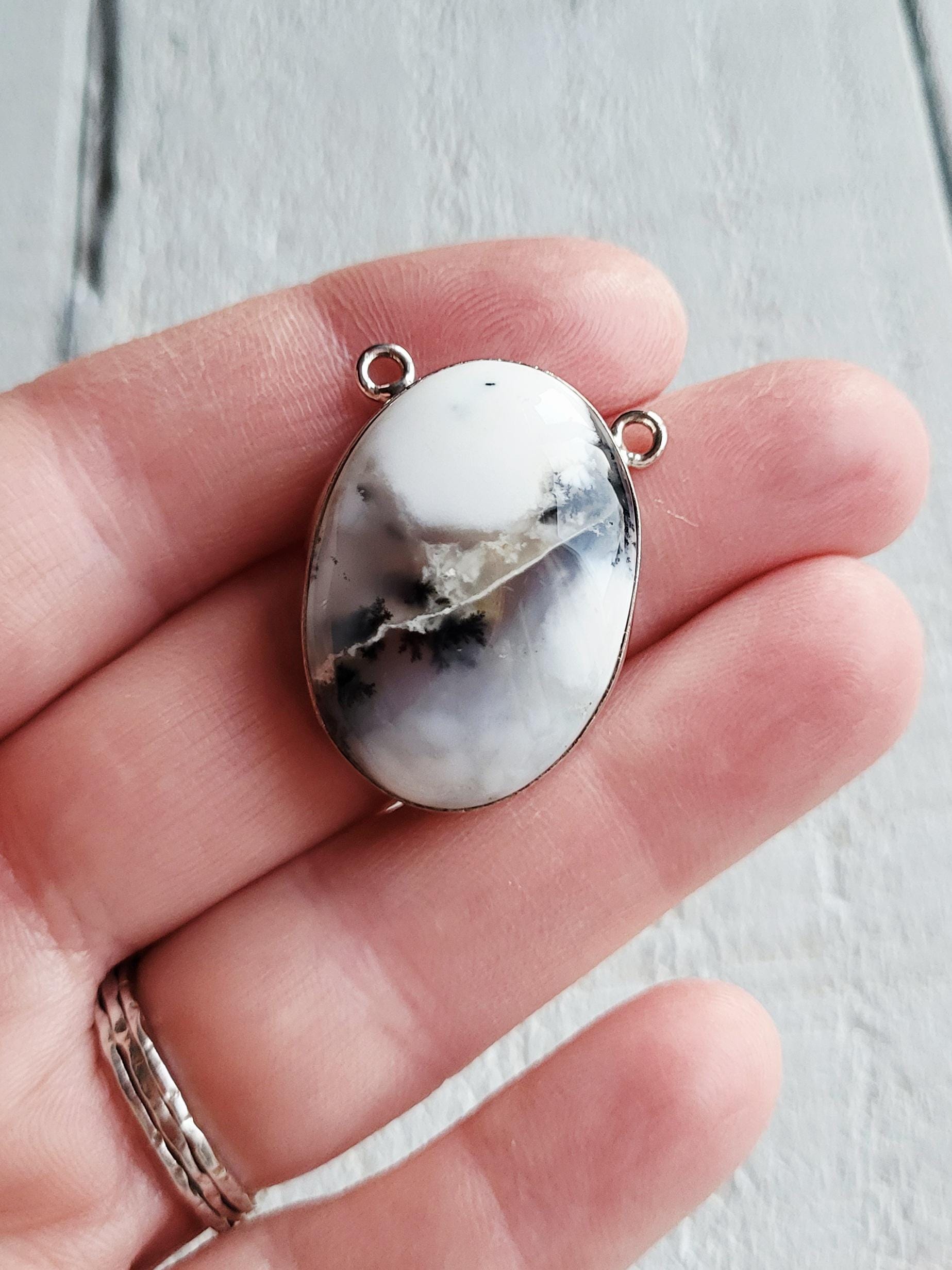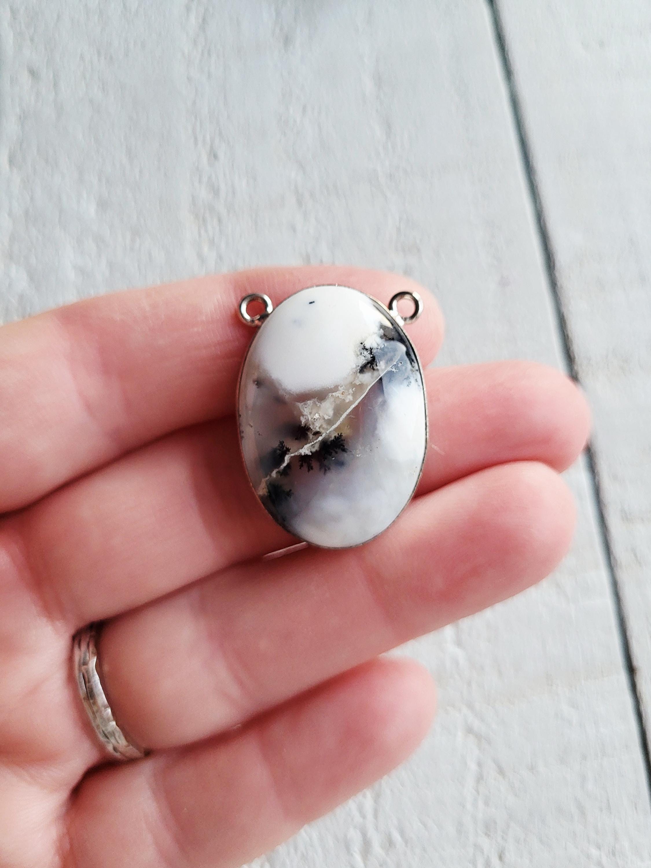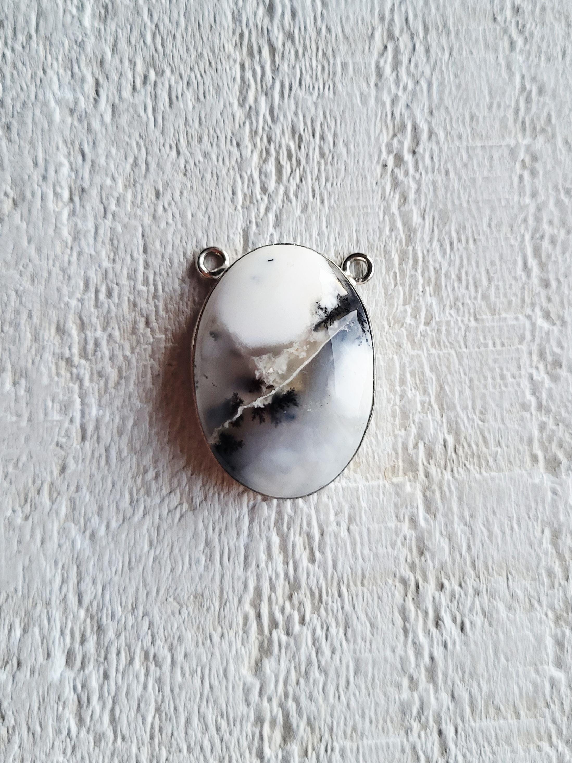 A beautiful dendritic agate gemstone pendant. A smooth, polished stone set in a plain 925 silver plating setting with 2 holes. It looks almost like a wintery scene in white and shades of grey. I only have one piece.