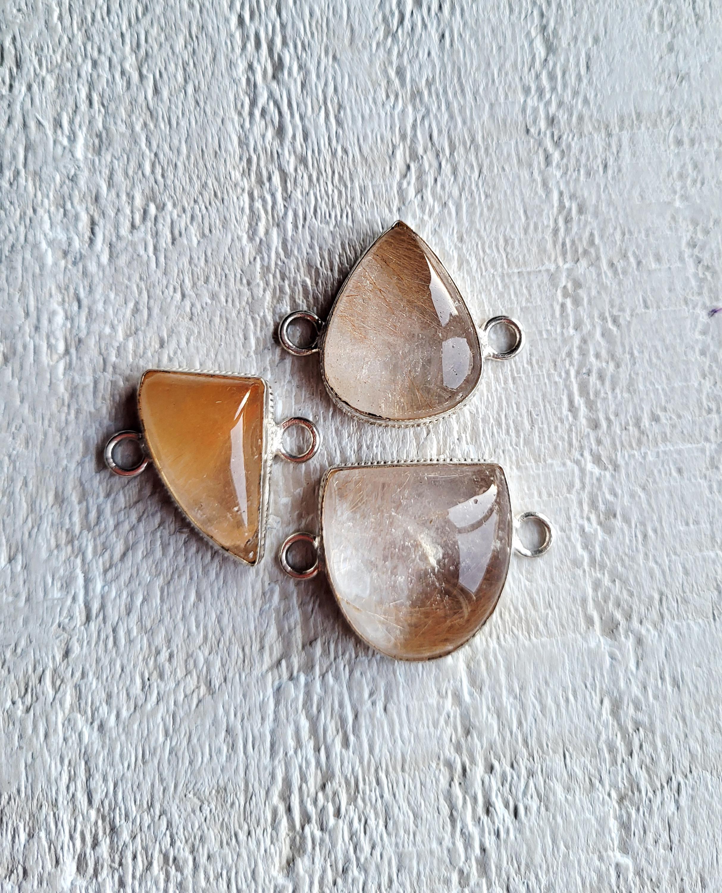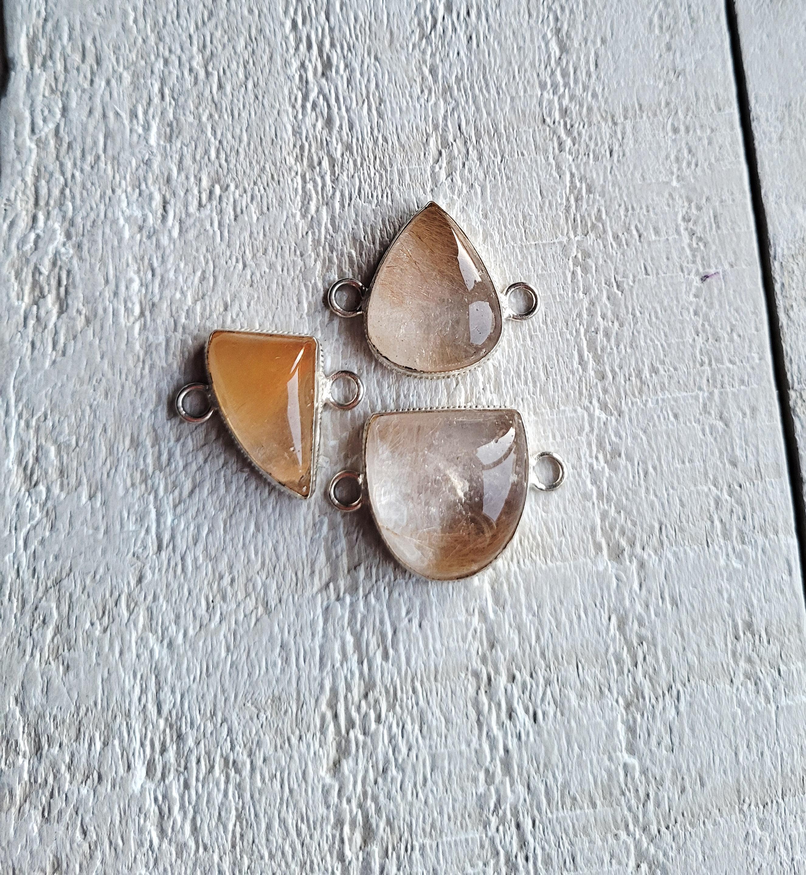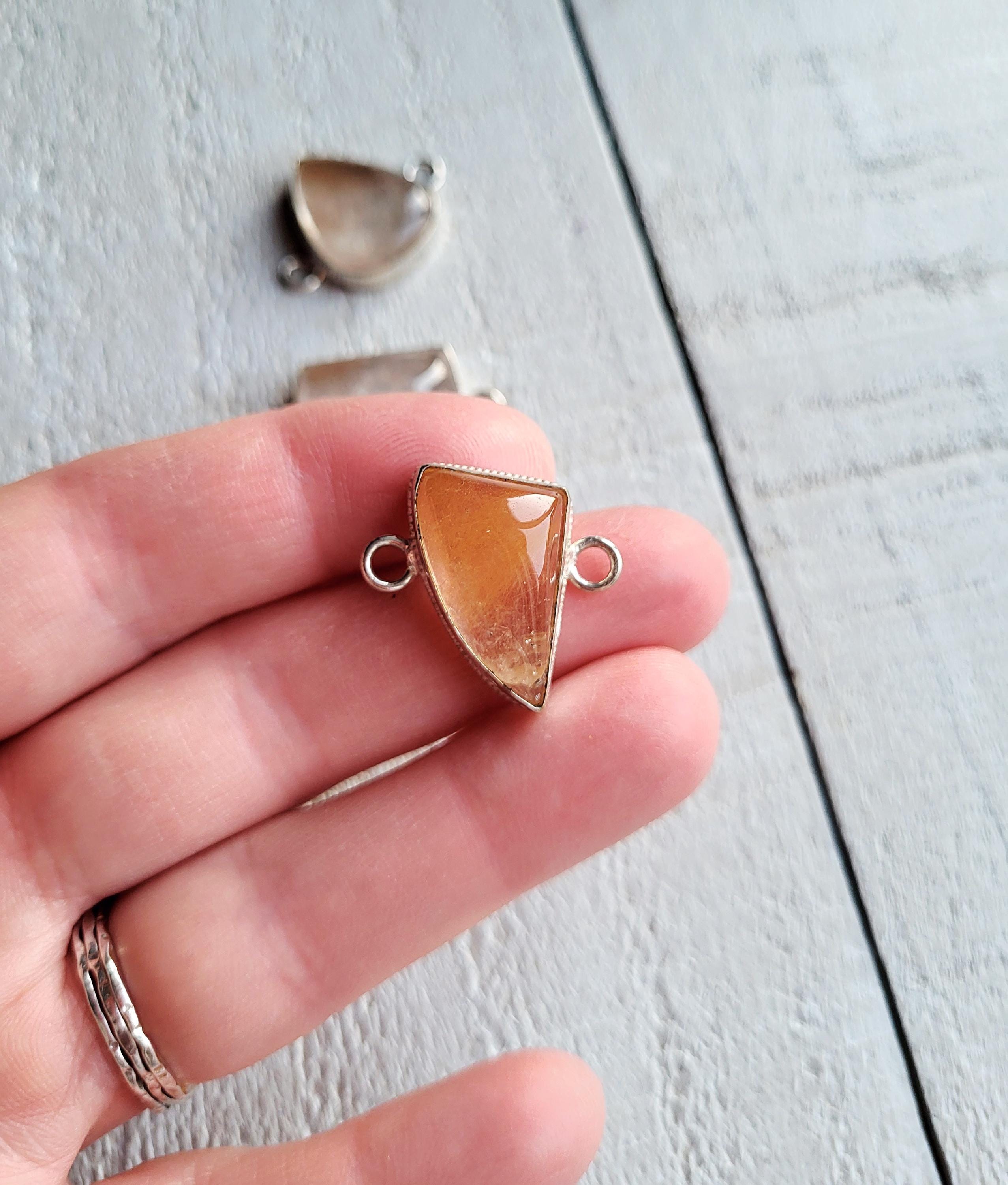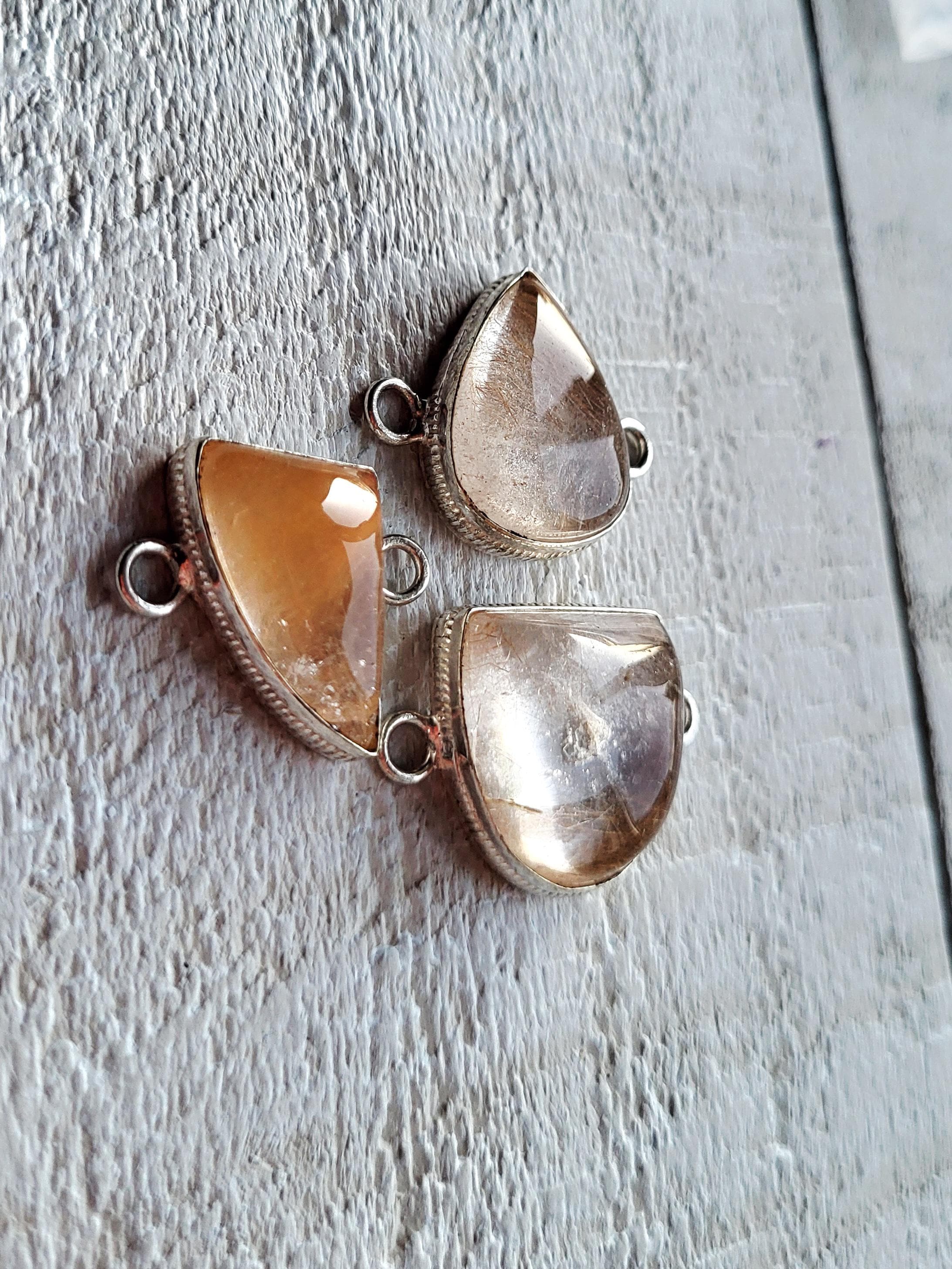 Citrine gemstone connectors with 2 holes. All different shapes in plain settings and 925 silver plated.