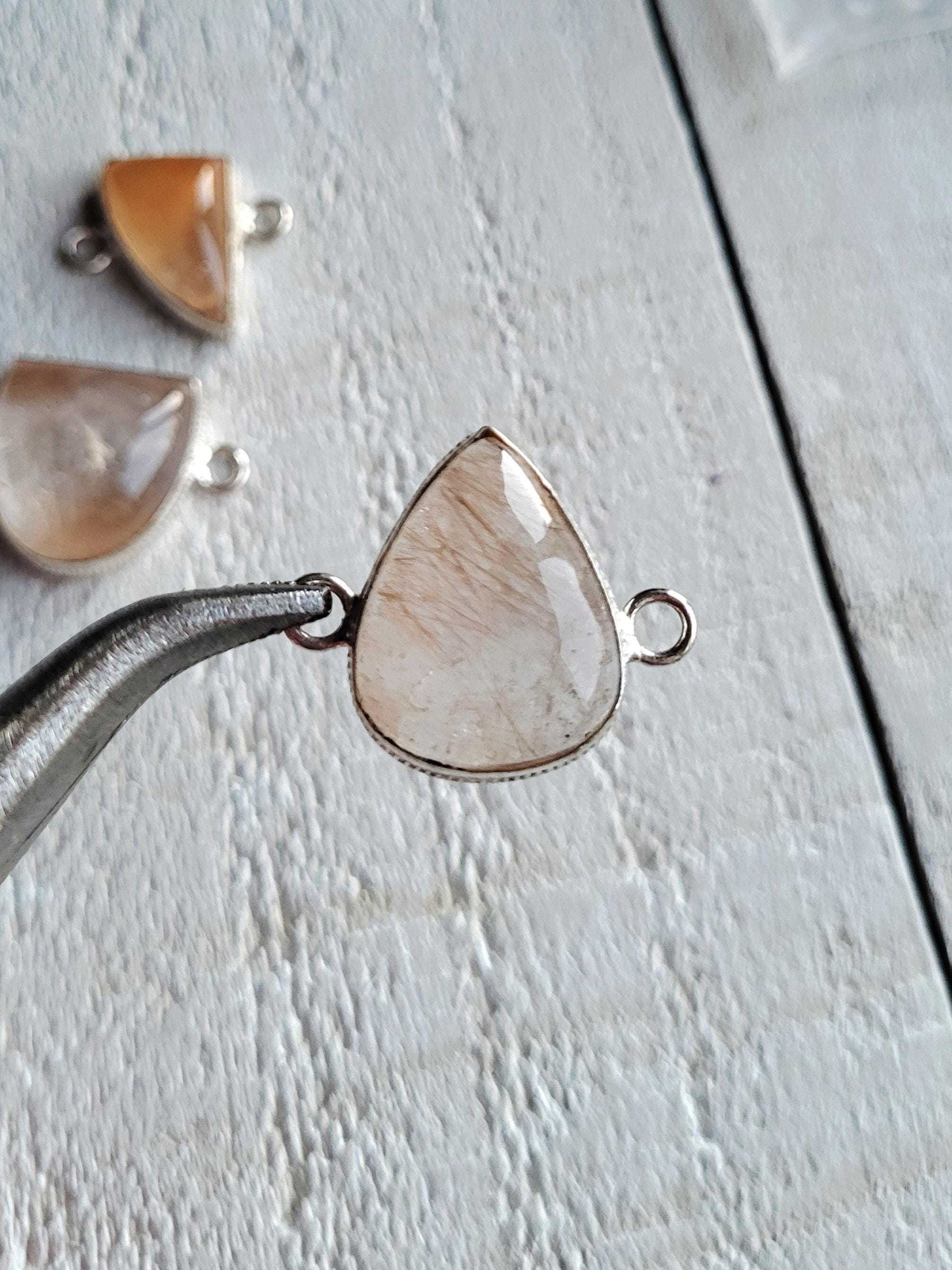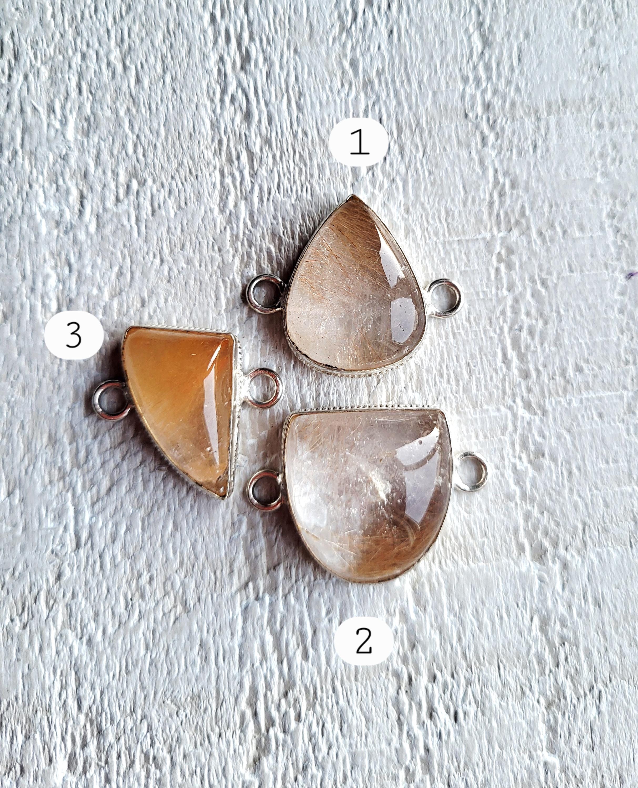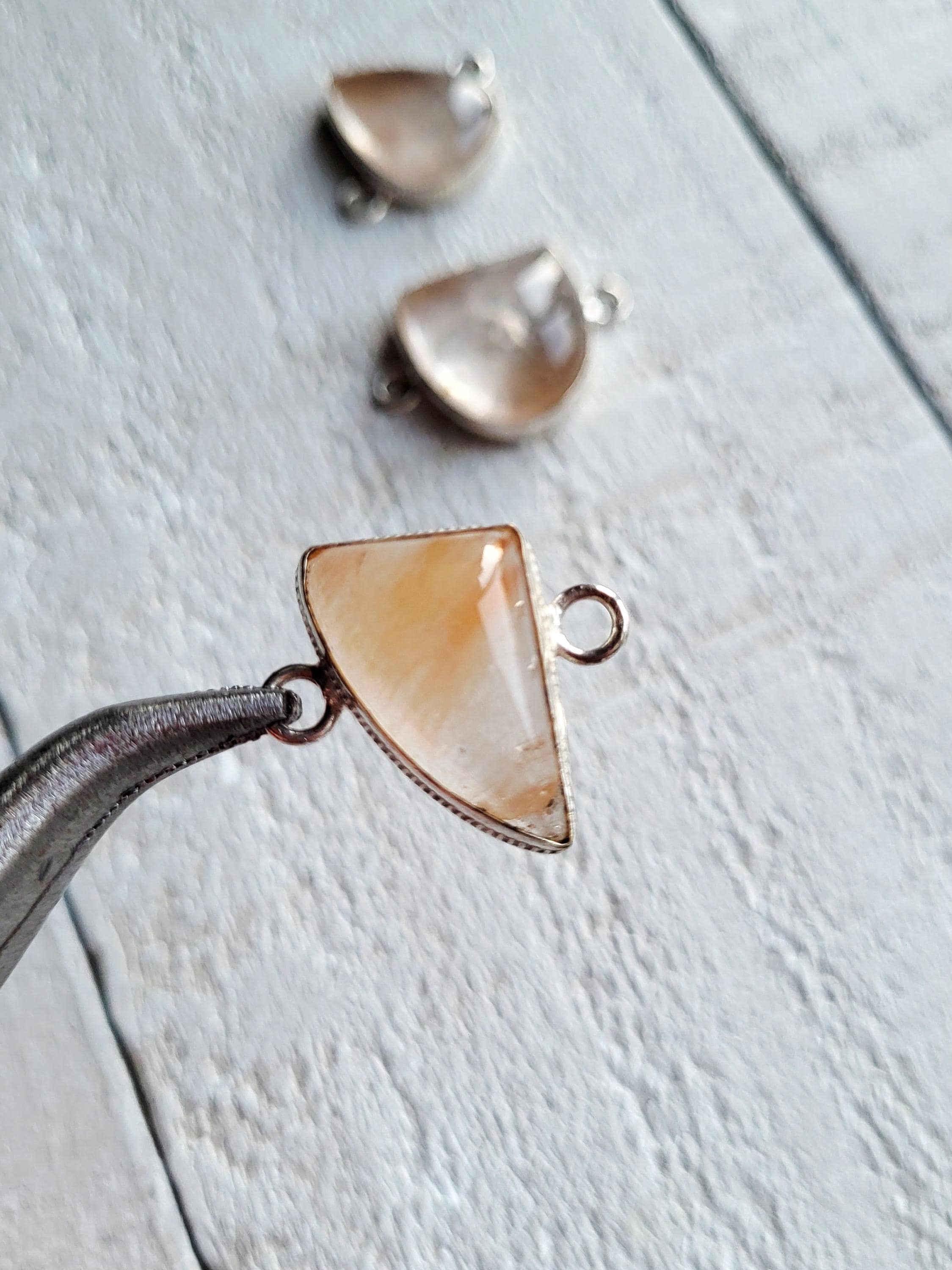 Citrine gemstone connectors with 2 holes. All different shapes in plain settings and 925 silver plated.