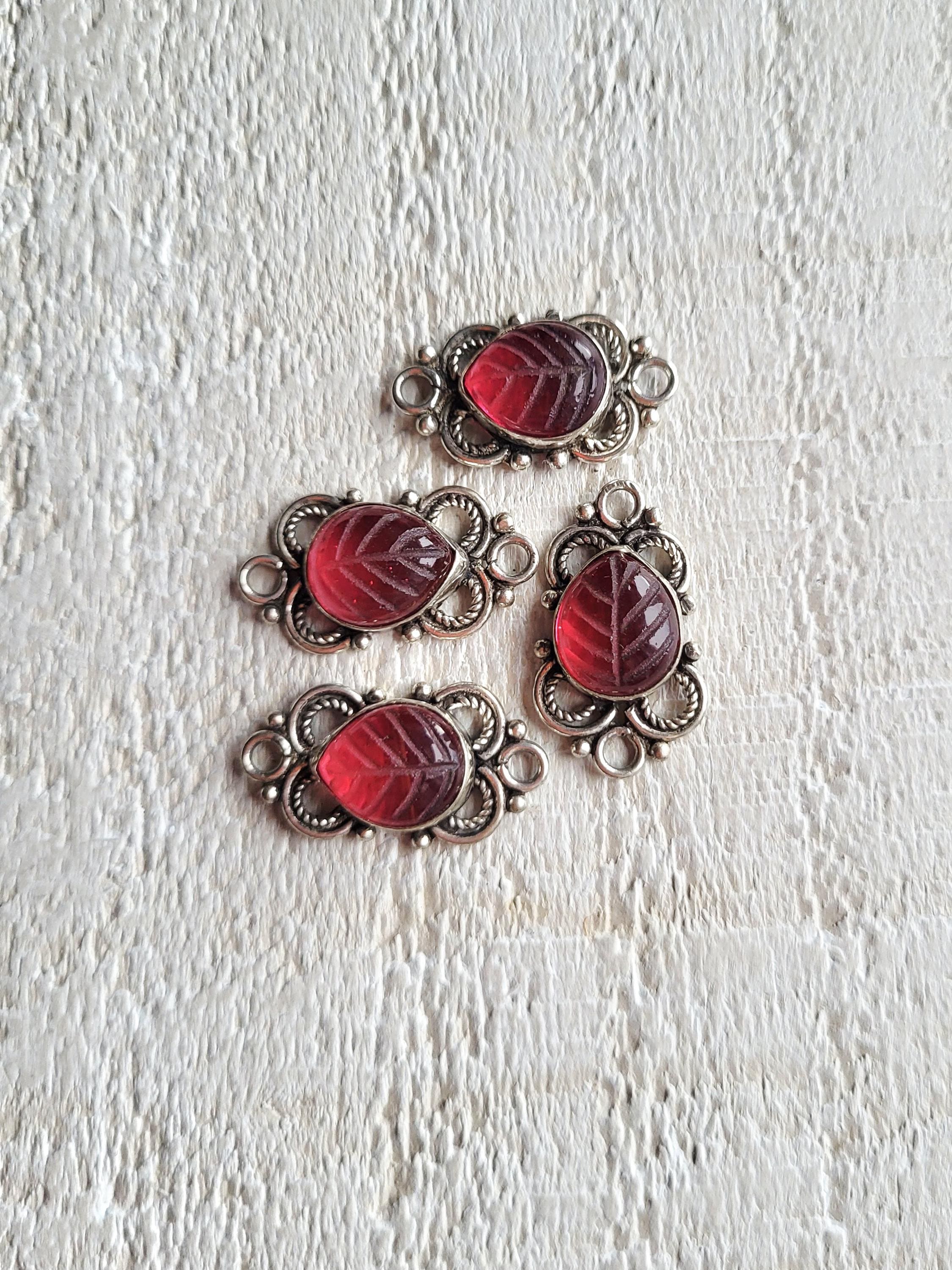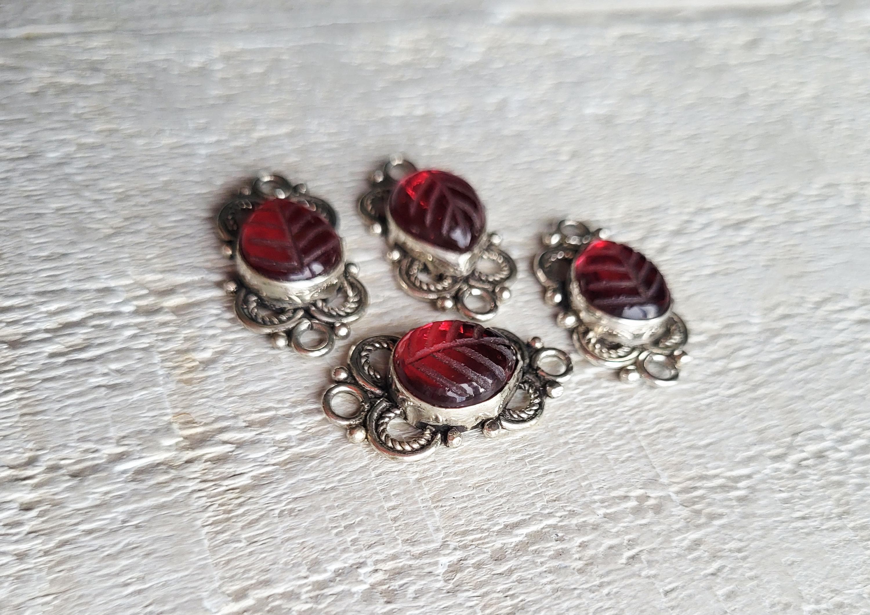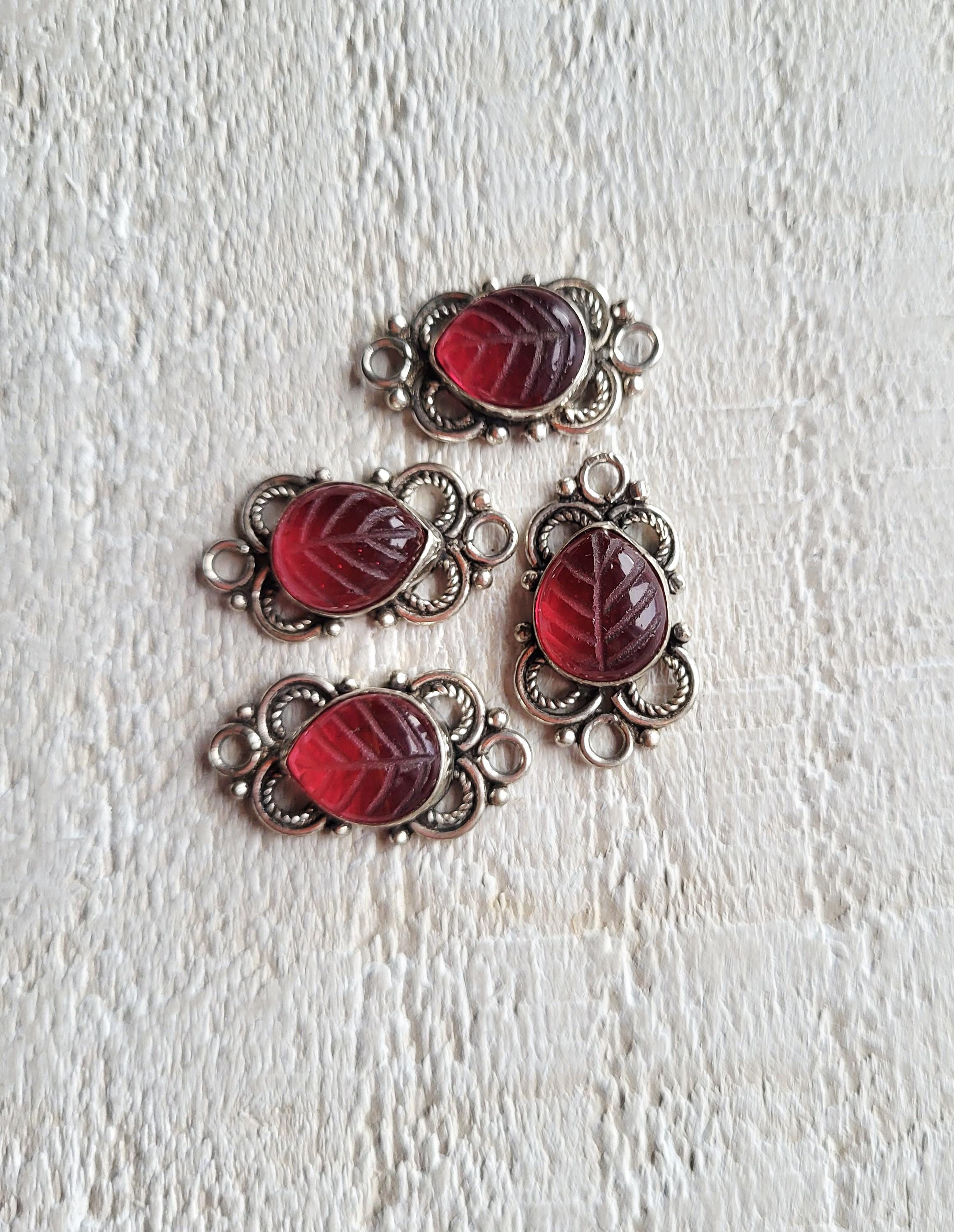 Red leaf design connectors with 2 holes. Oval shaped in a pretty 925 silver plated setting. Great for earrings and bracelets