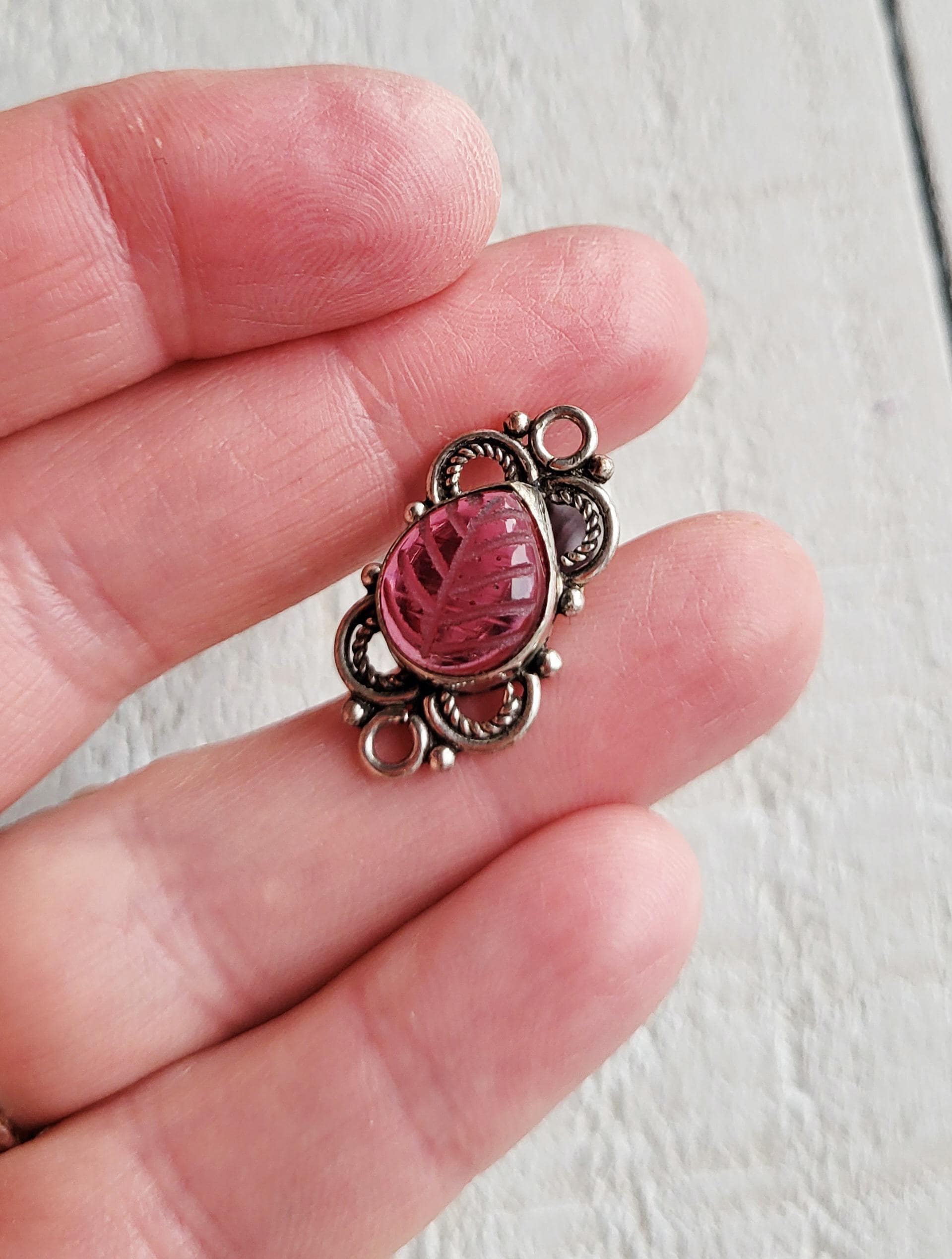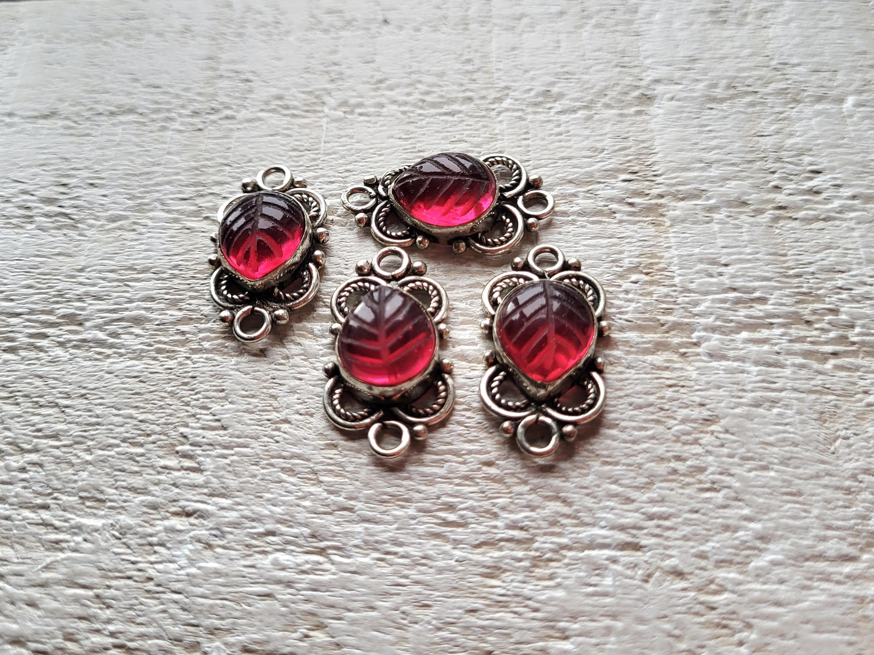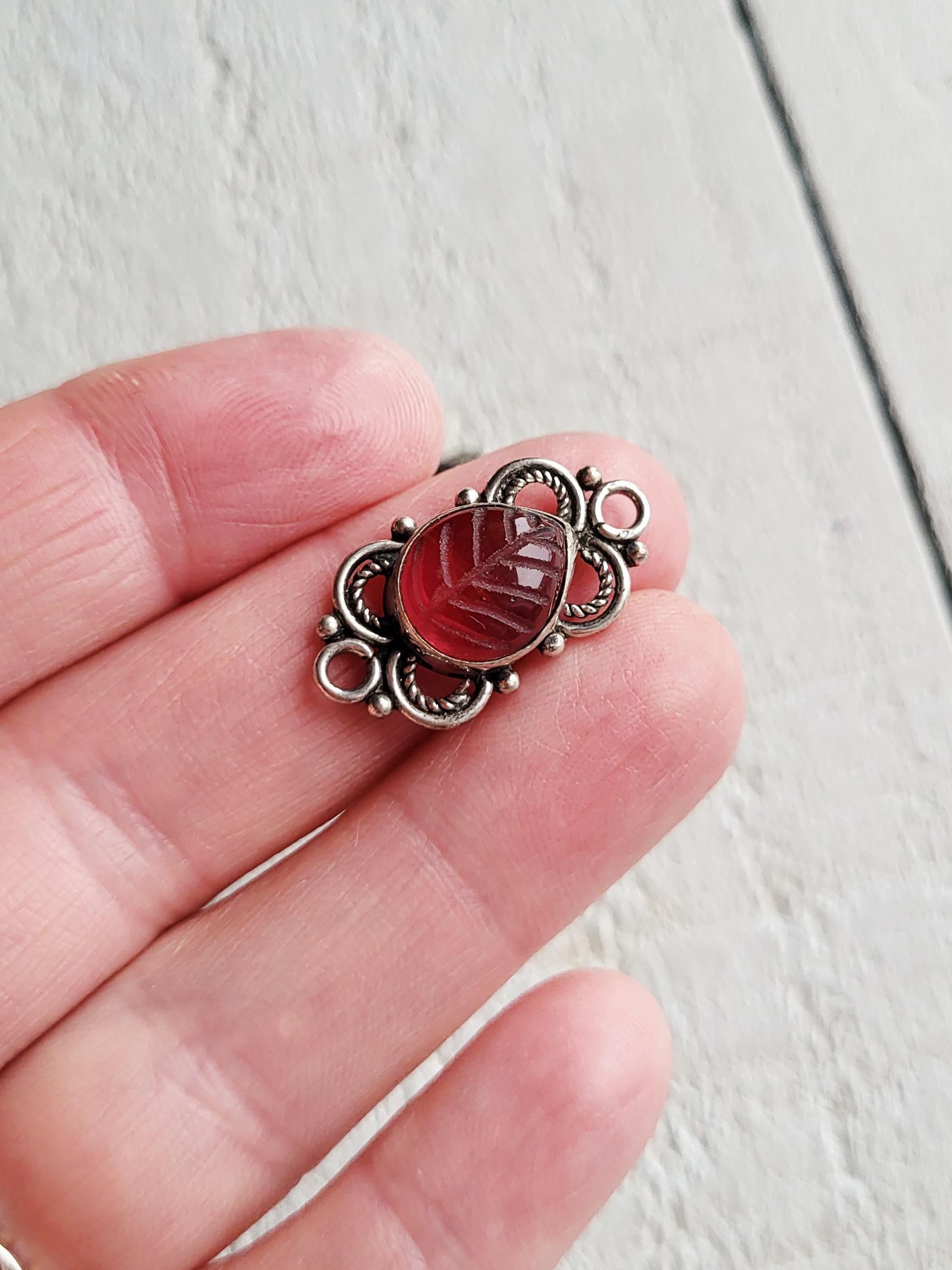 Red leaf design connectors with 2 holes. Oval shaped in a pretty 925 silver plated setting. Great for earrings and bracelets