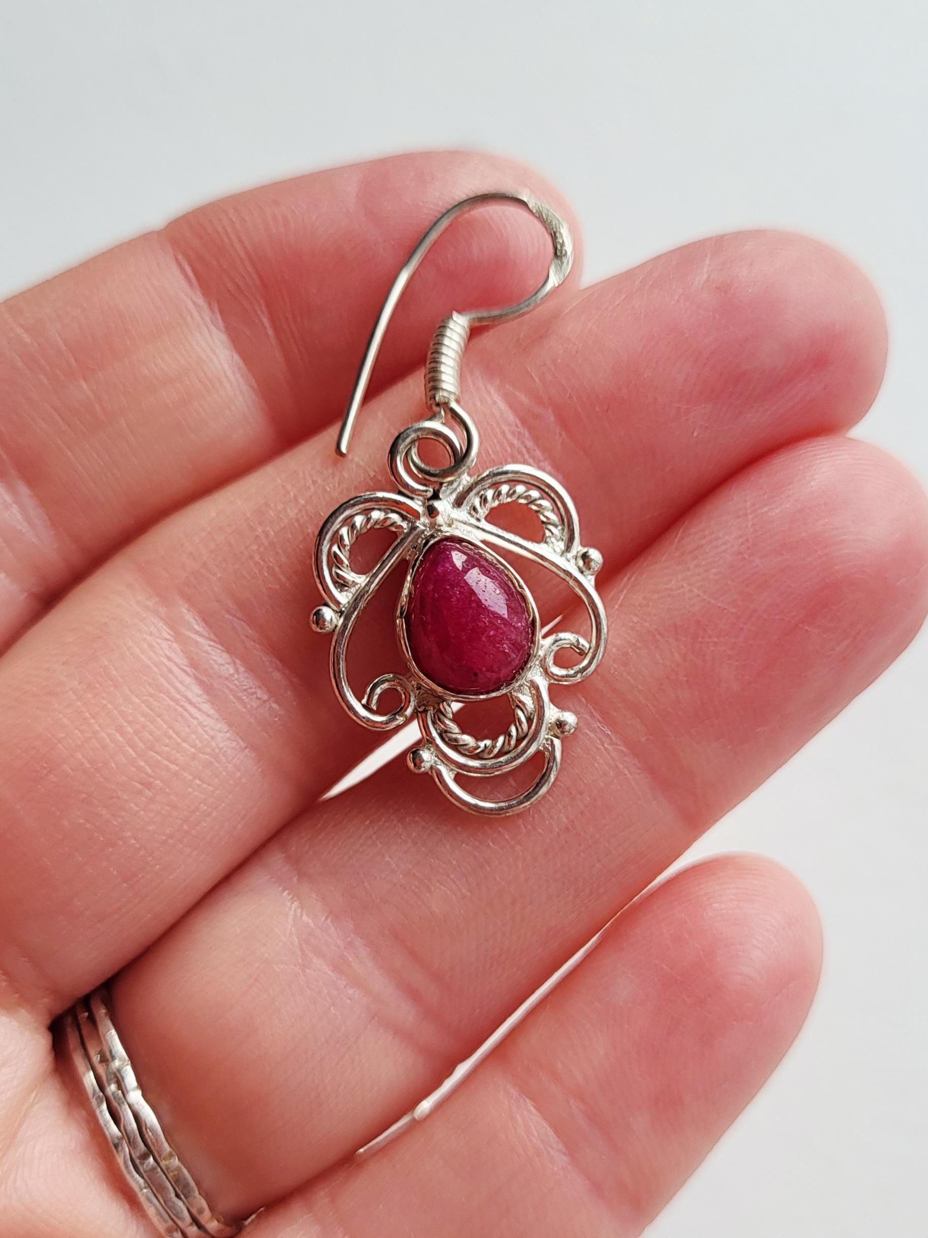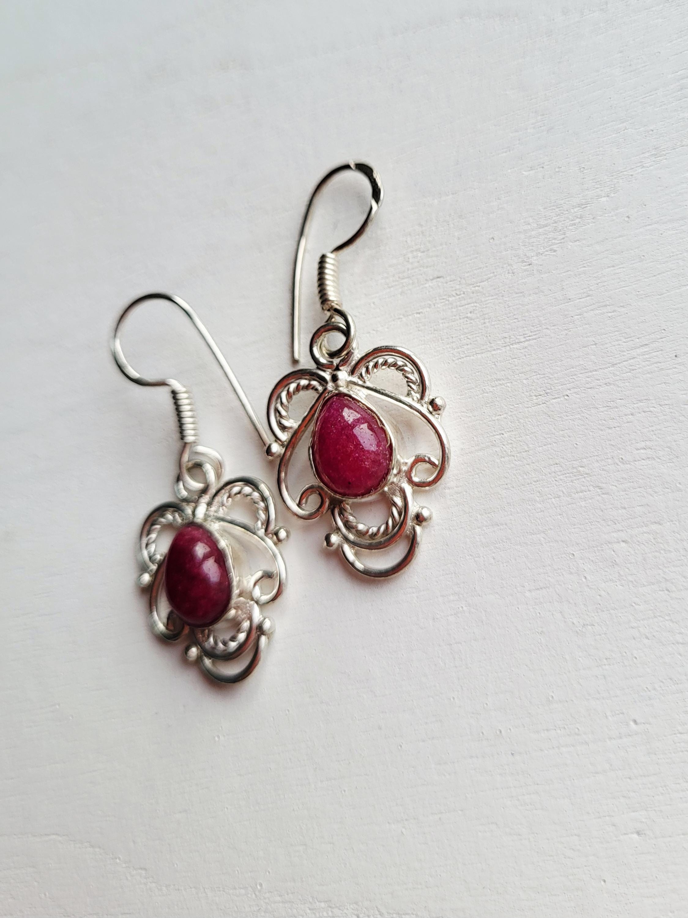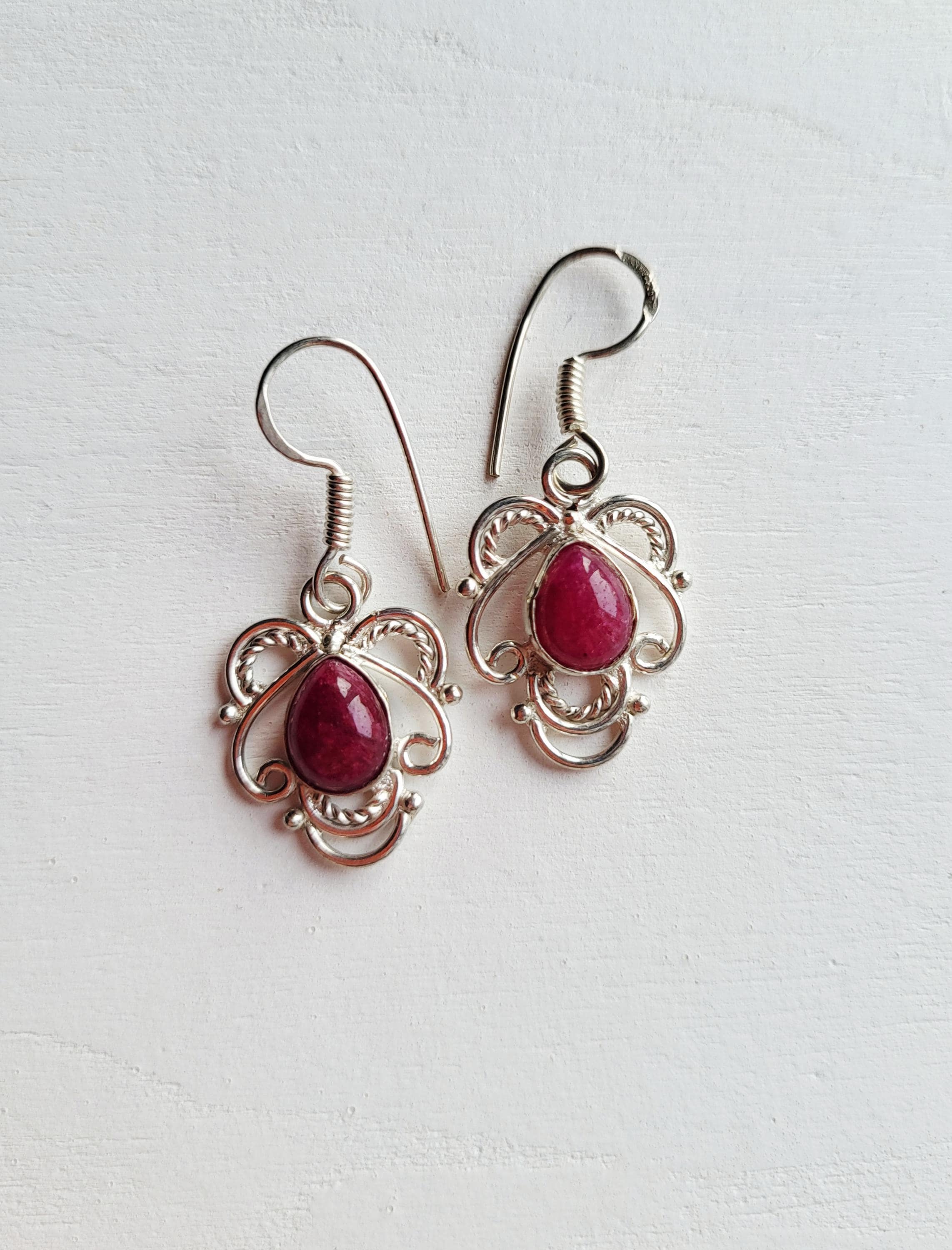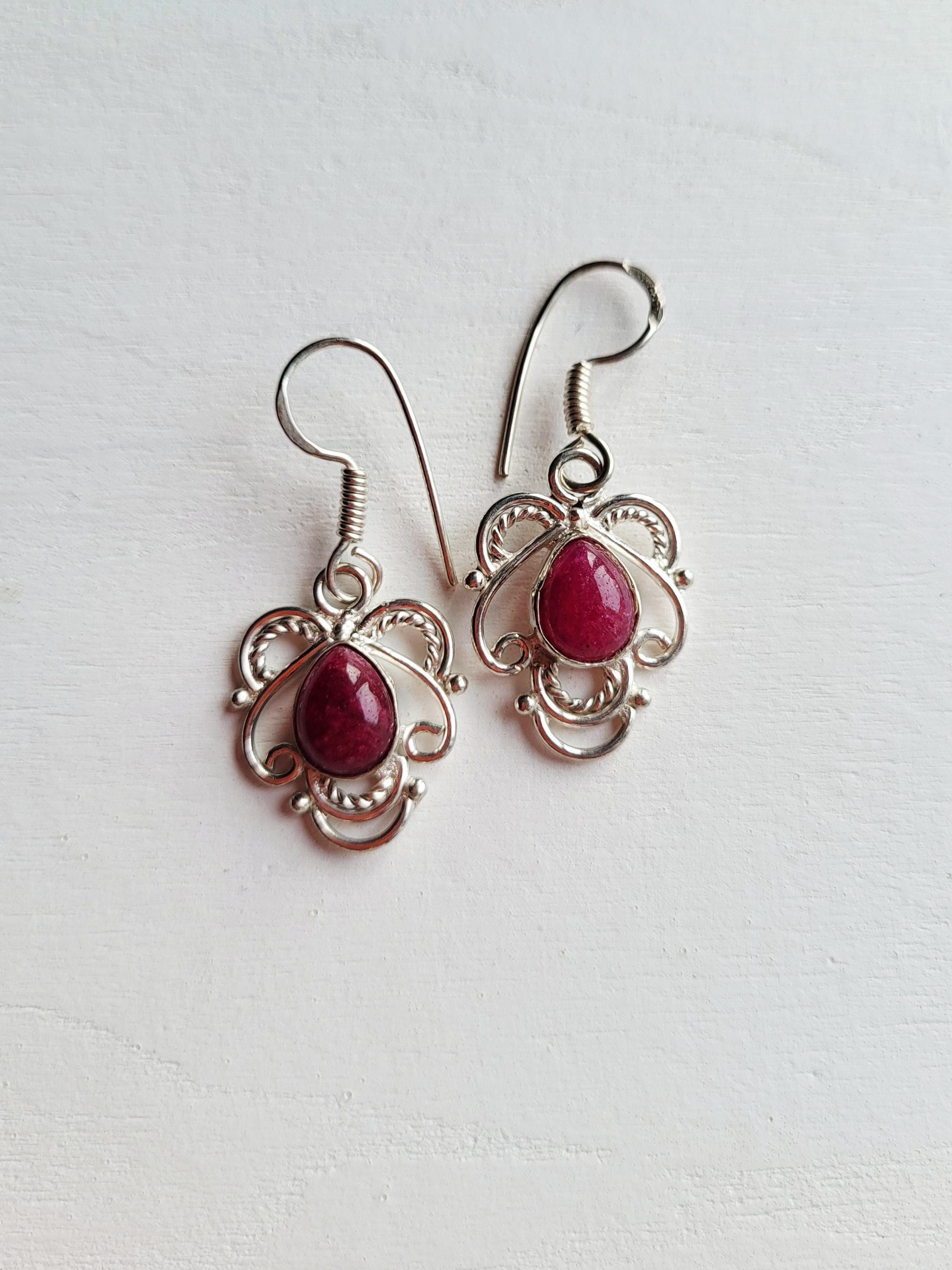 Pink jade (dyed) gemstone earrings, teardrop shaped stones in a decorative 925 silver plated setting.