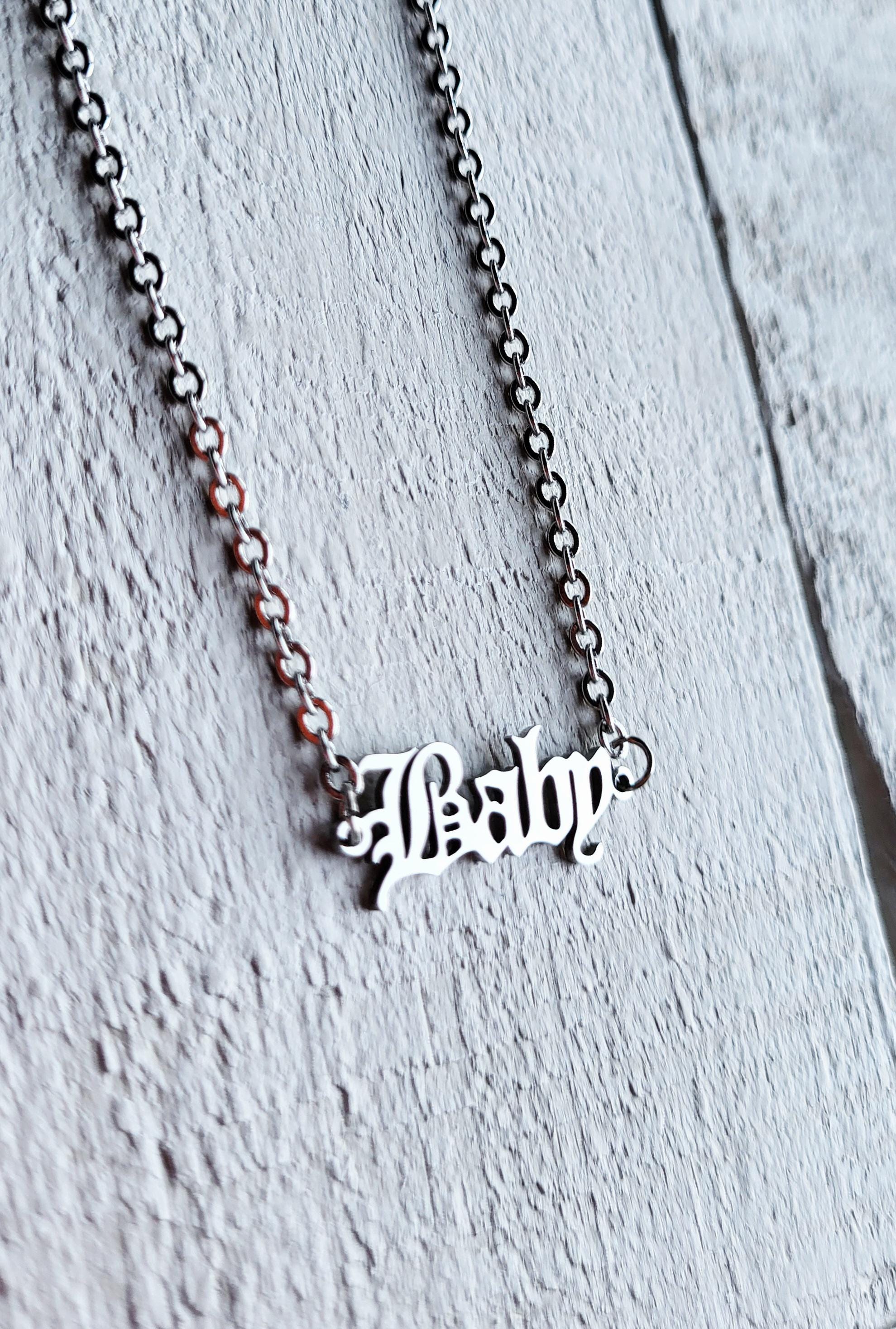 "Baby" pendant necklace, on steel cable chain...All made from stainless steel so no chance of tarnishing.