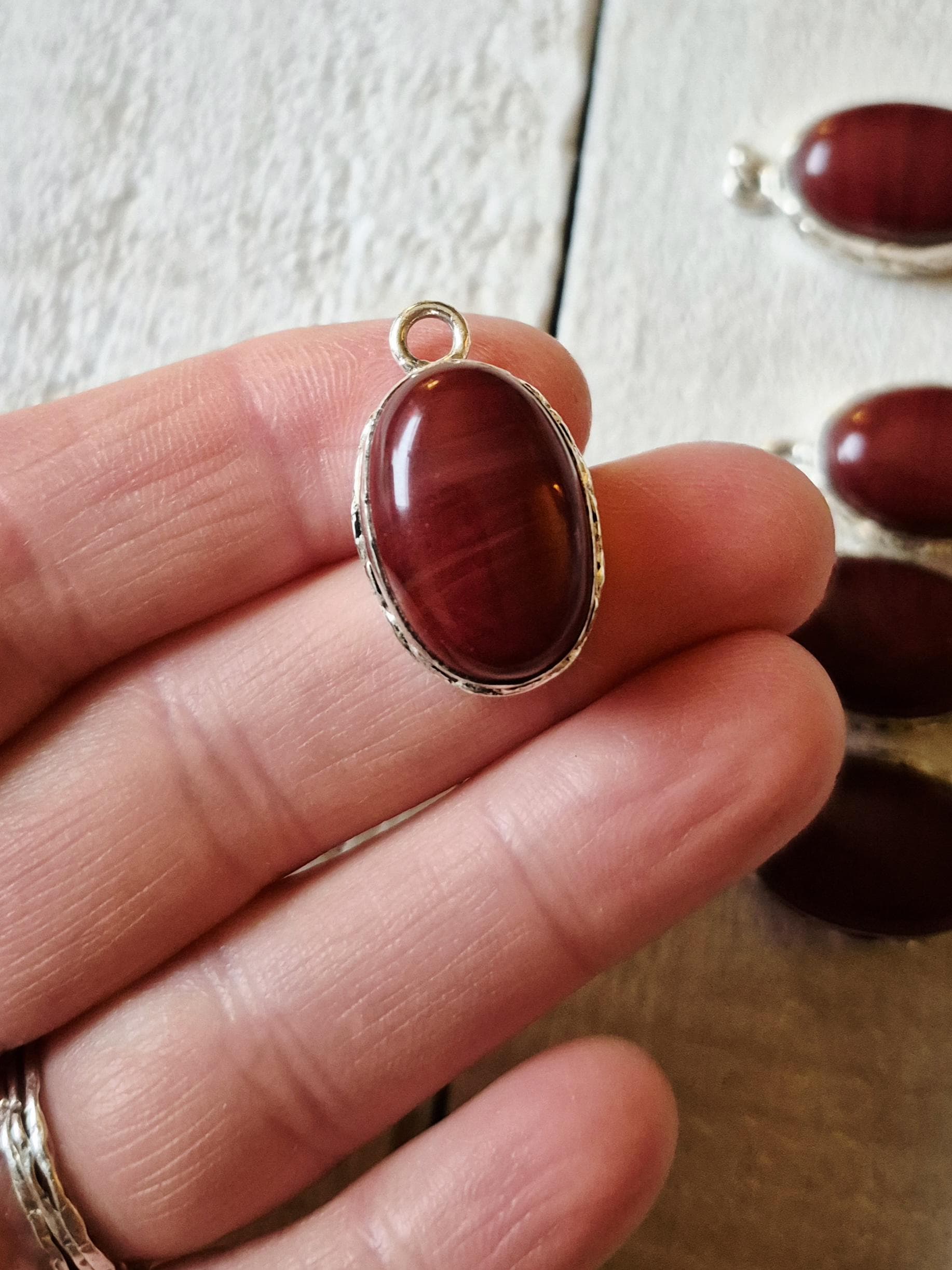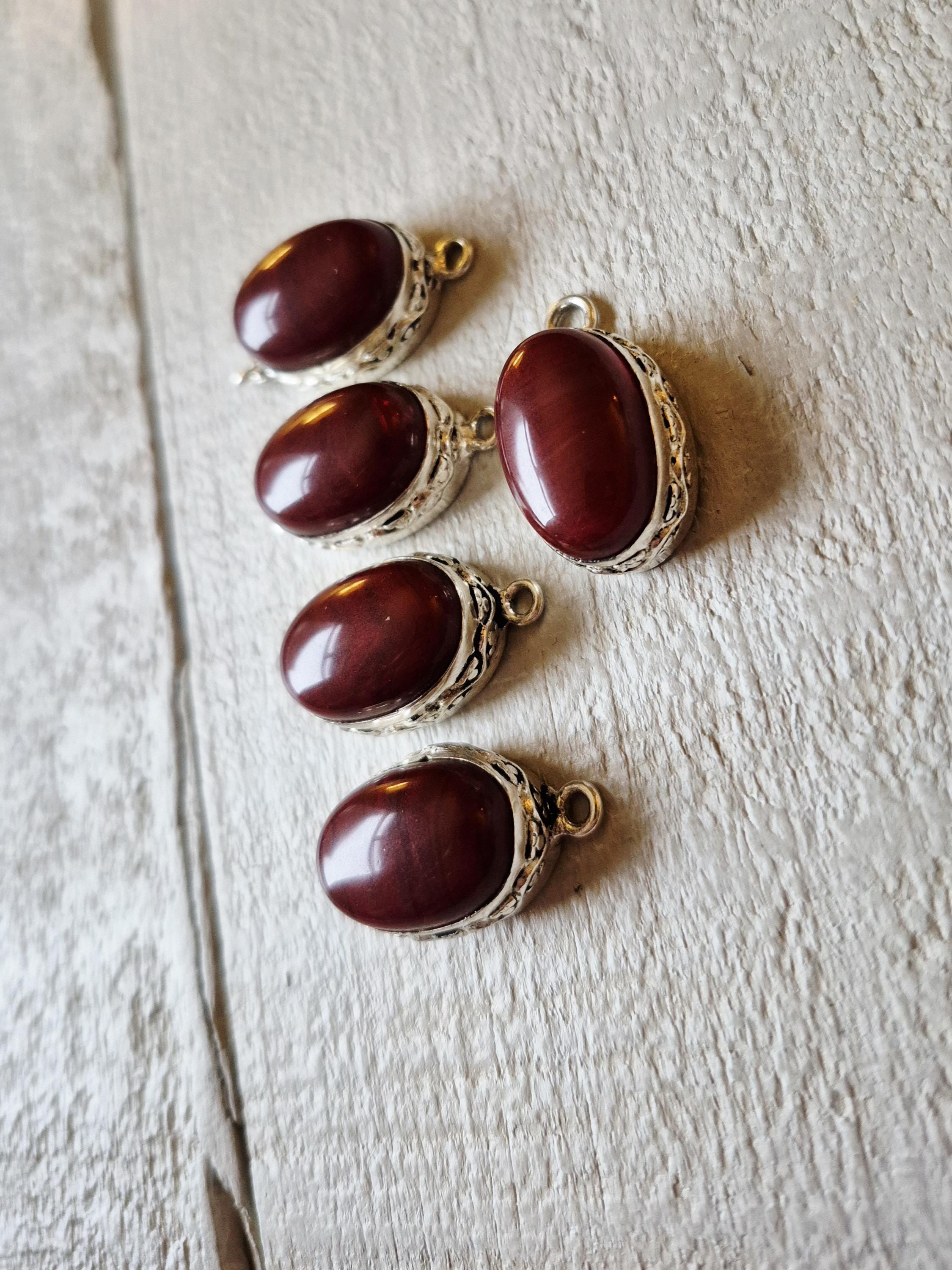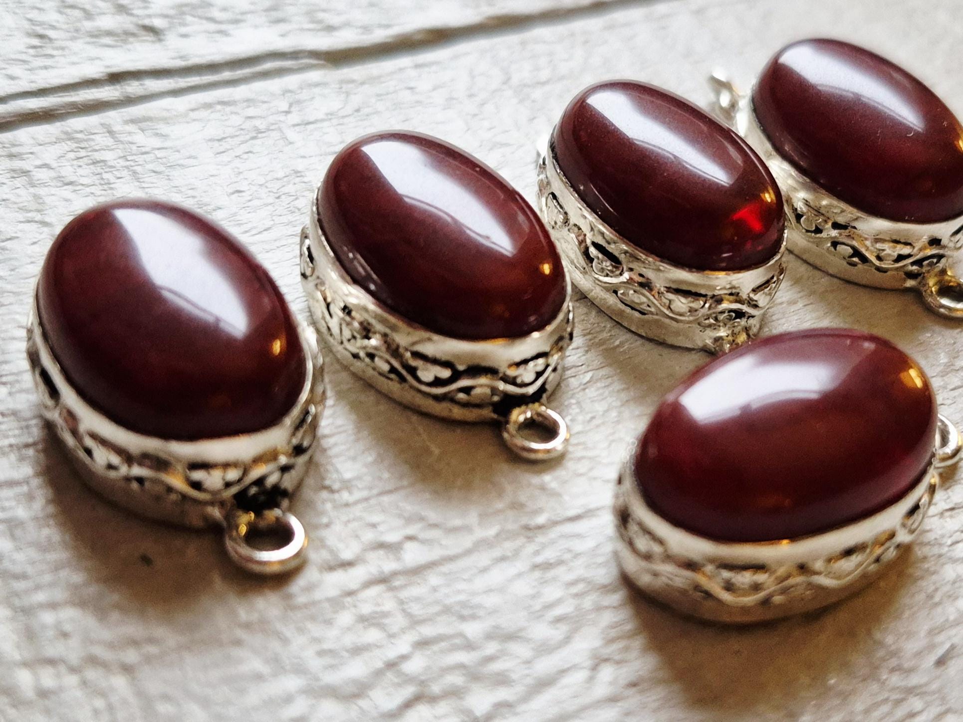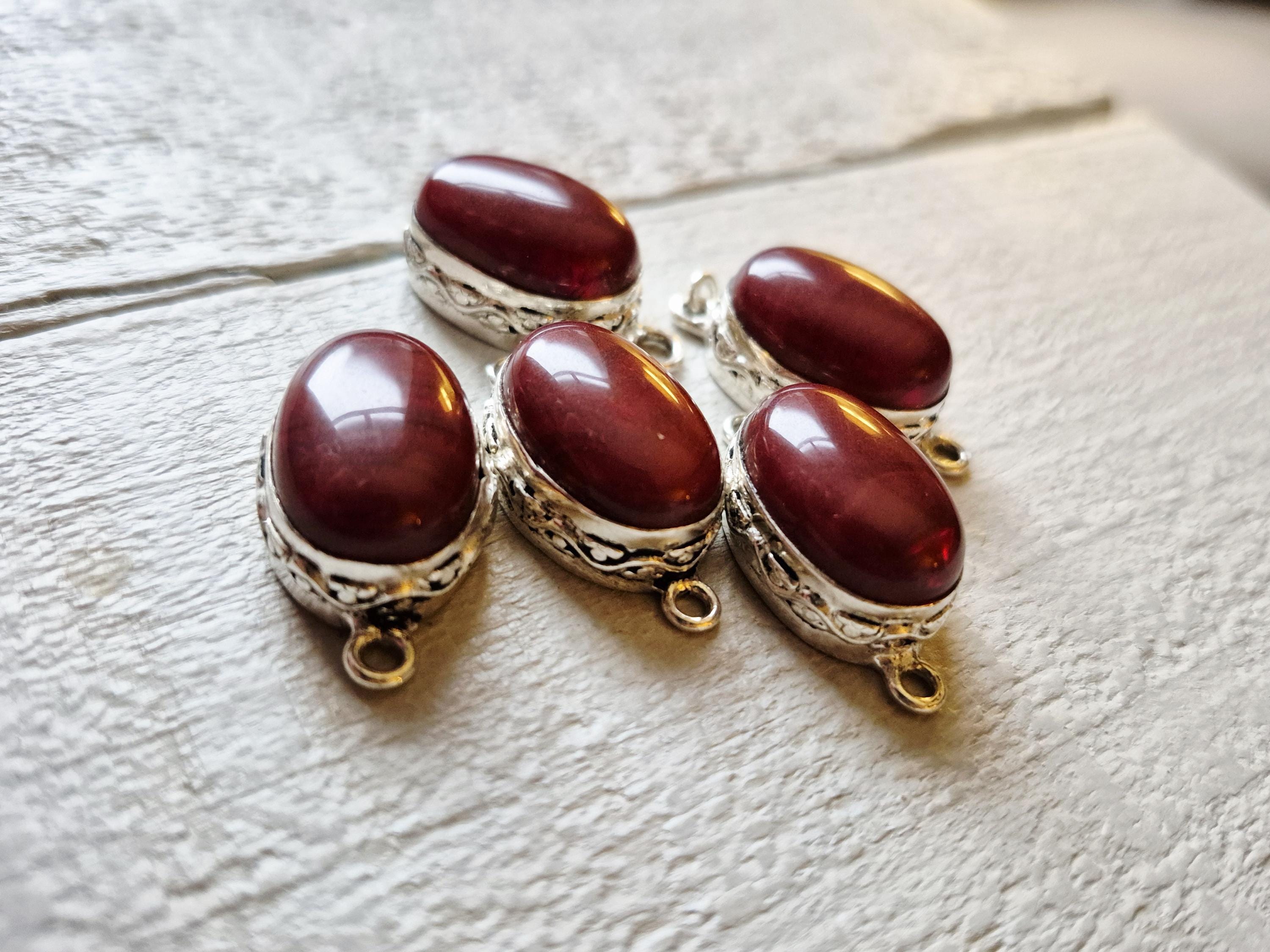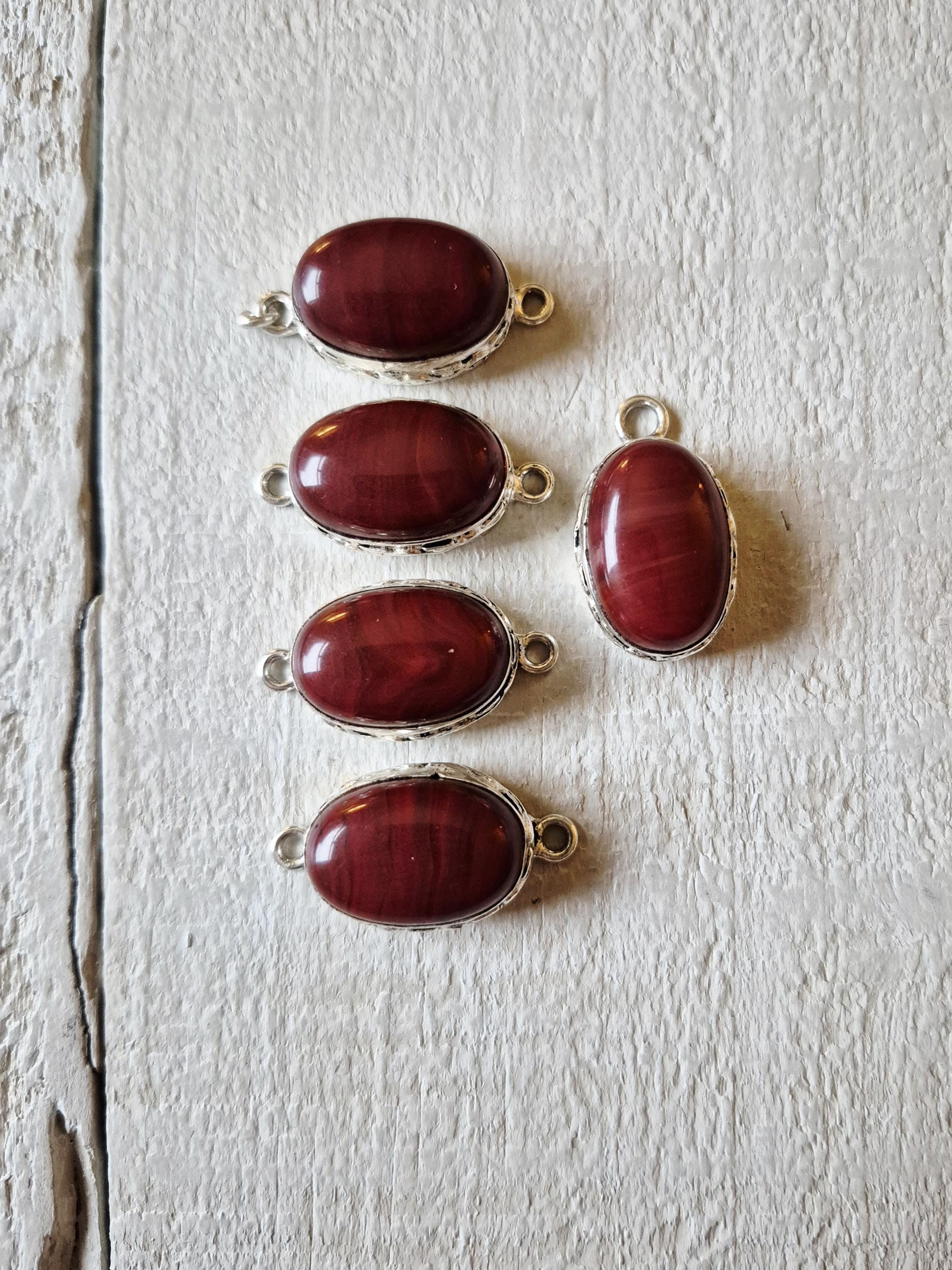 Deep red onyx ovals set in decorative settings. I have 4 connectors and 1 matching pendant