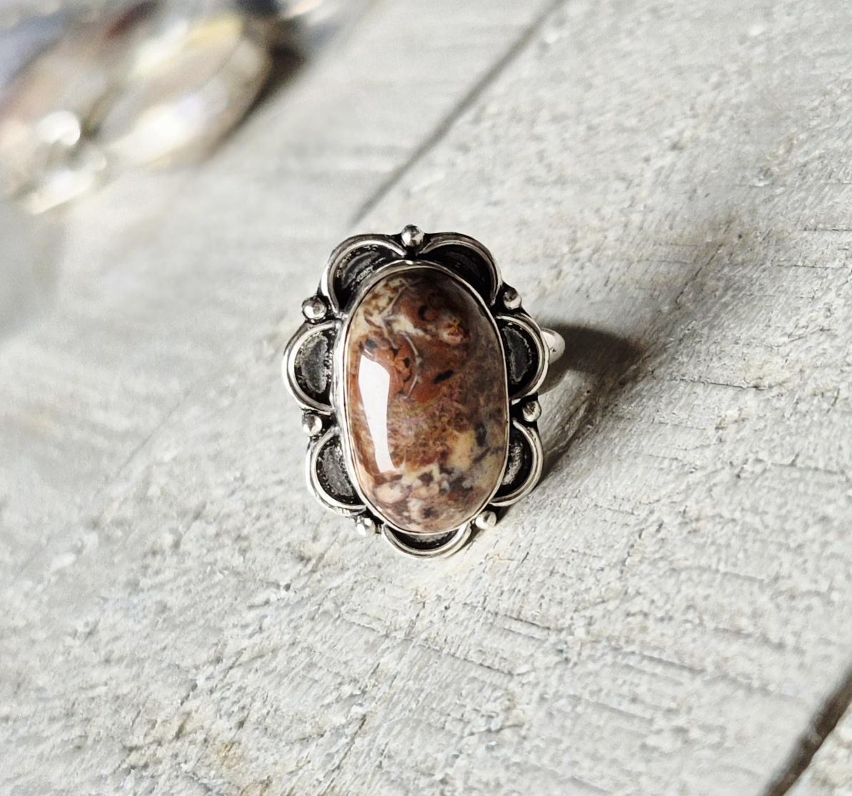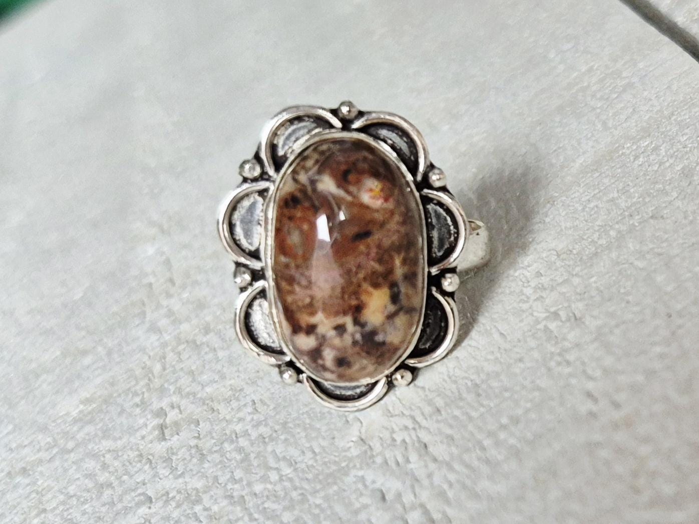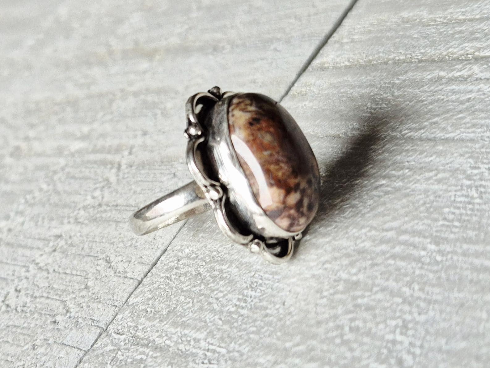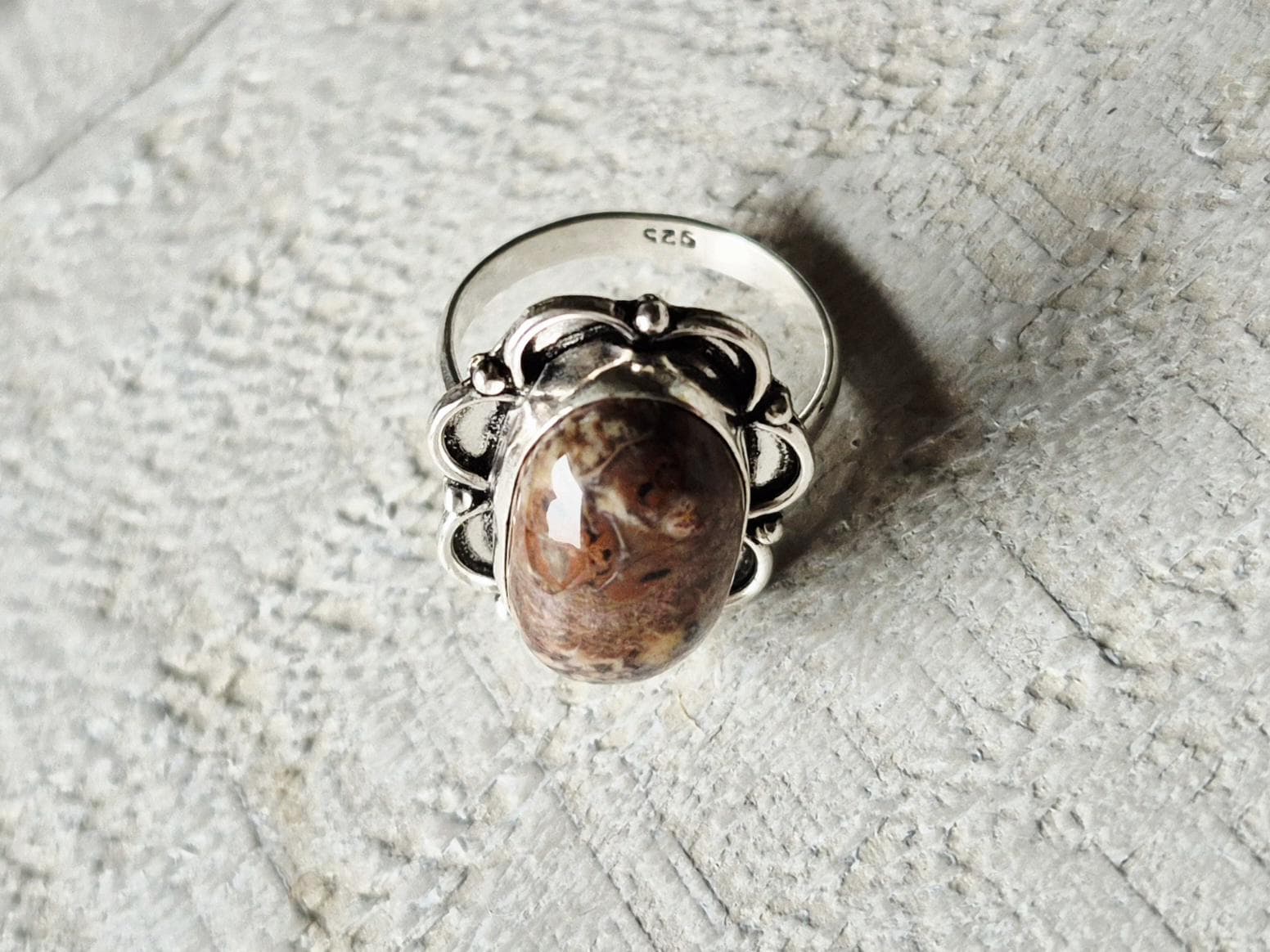 An oval brown cappuccino jasper stone...925 silver plated setting.