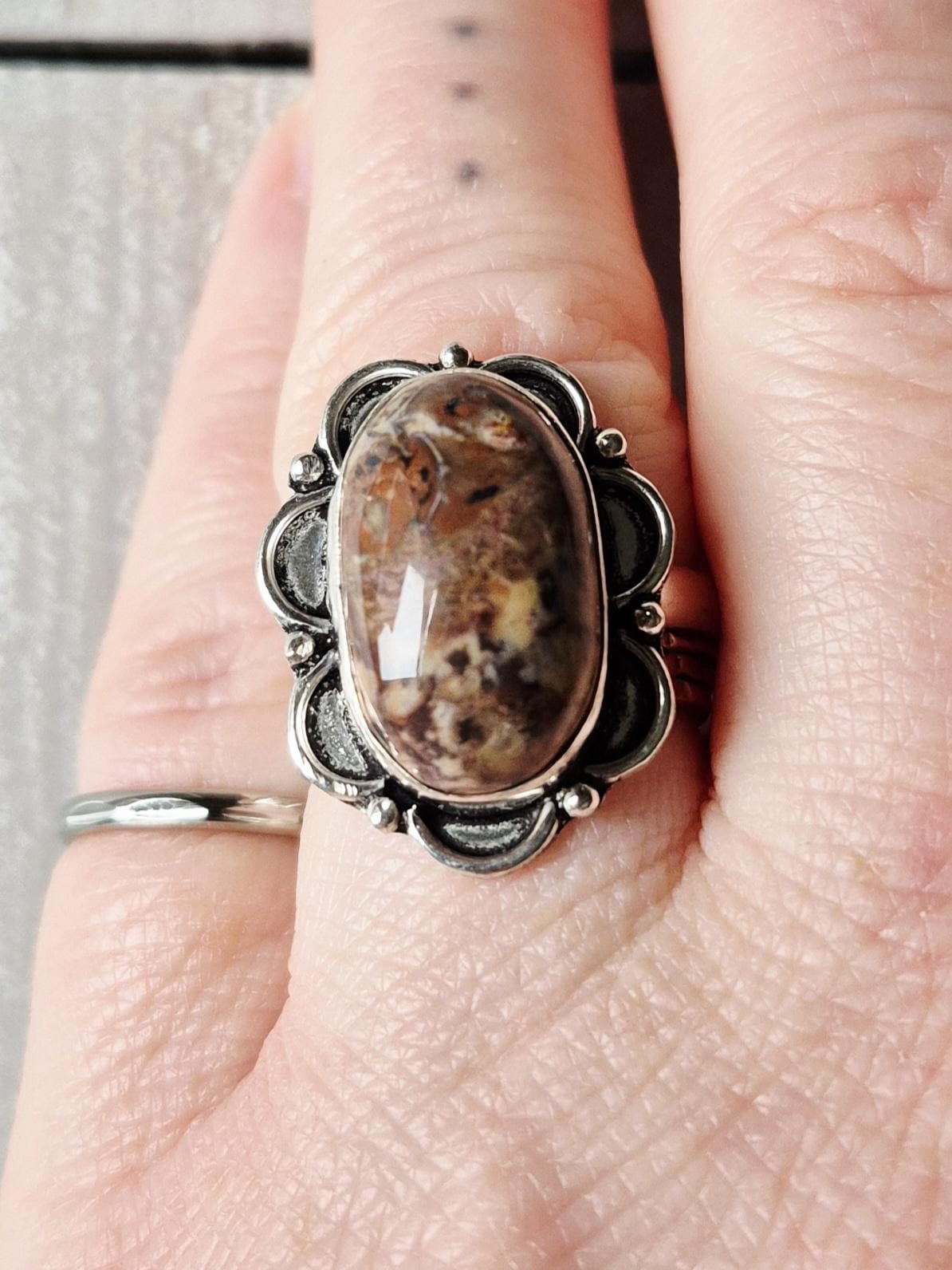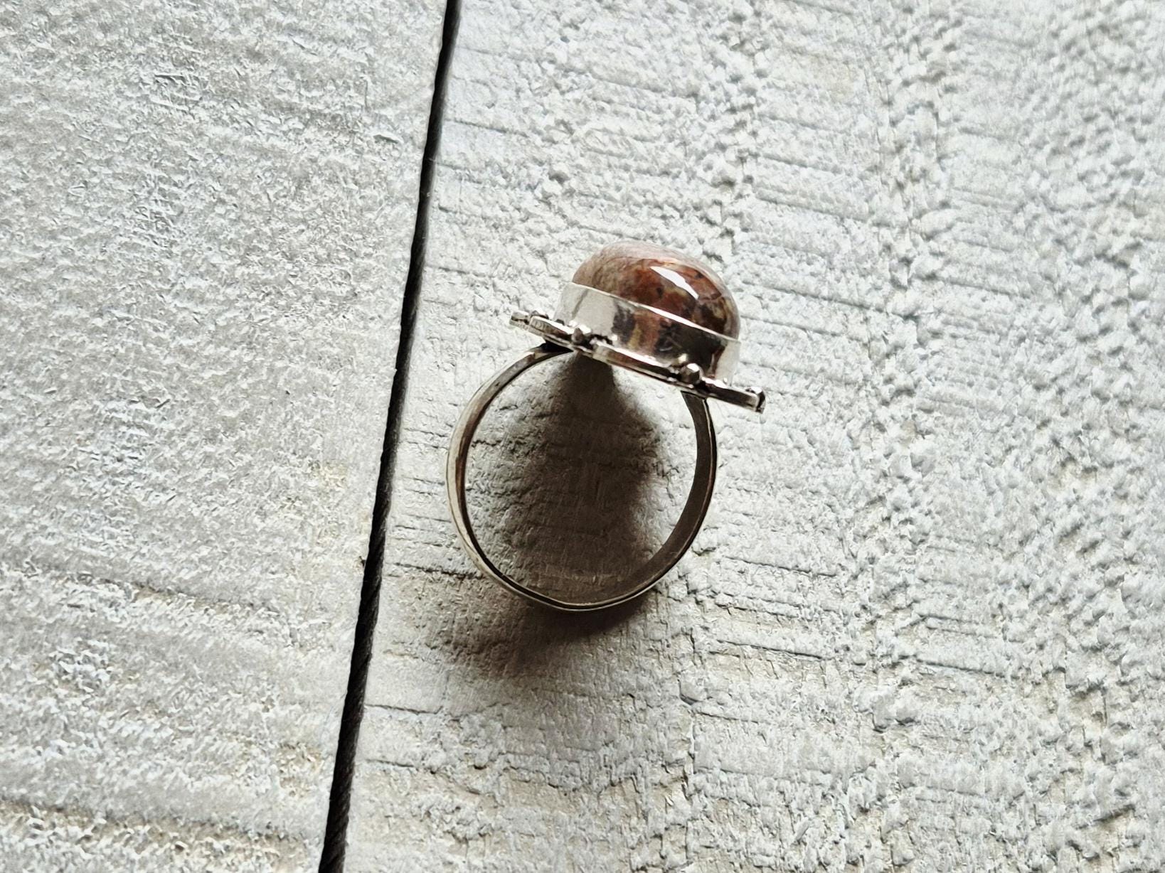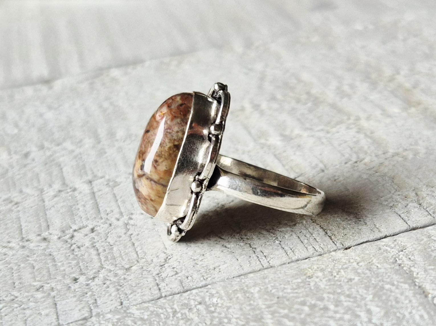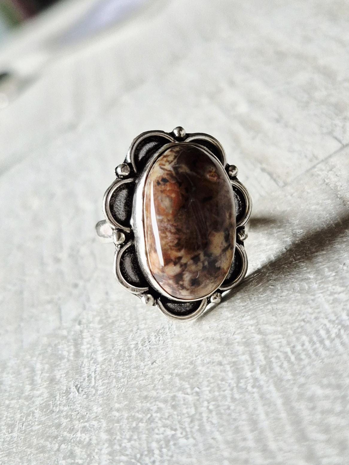 An oval brown cappuccino jasper stone...925 silver plated setting.