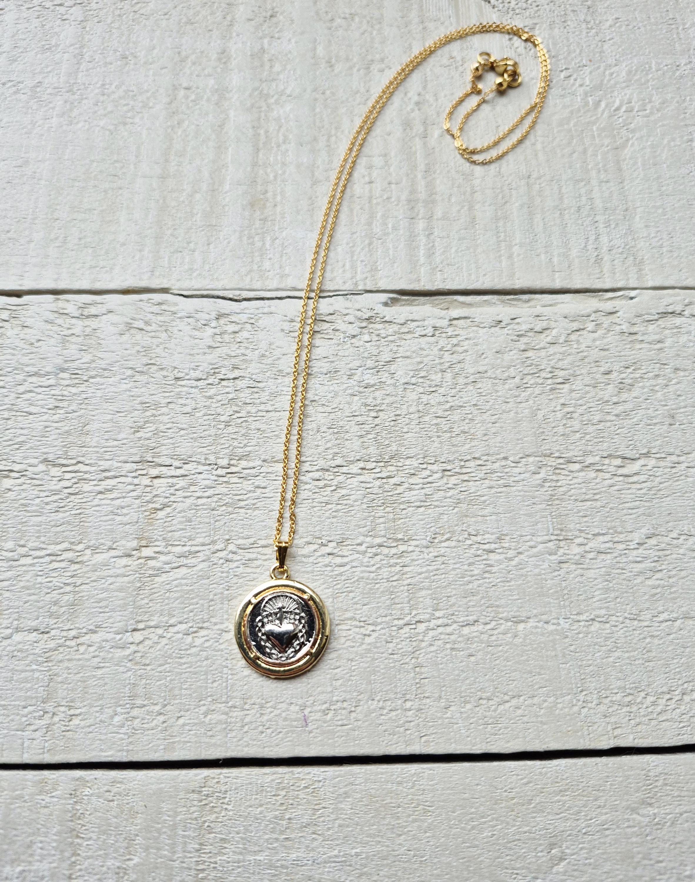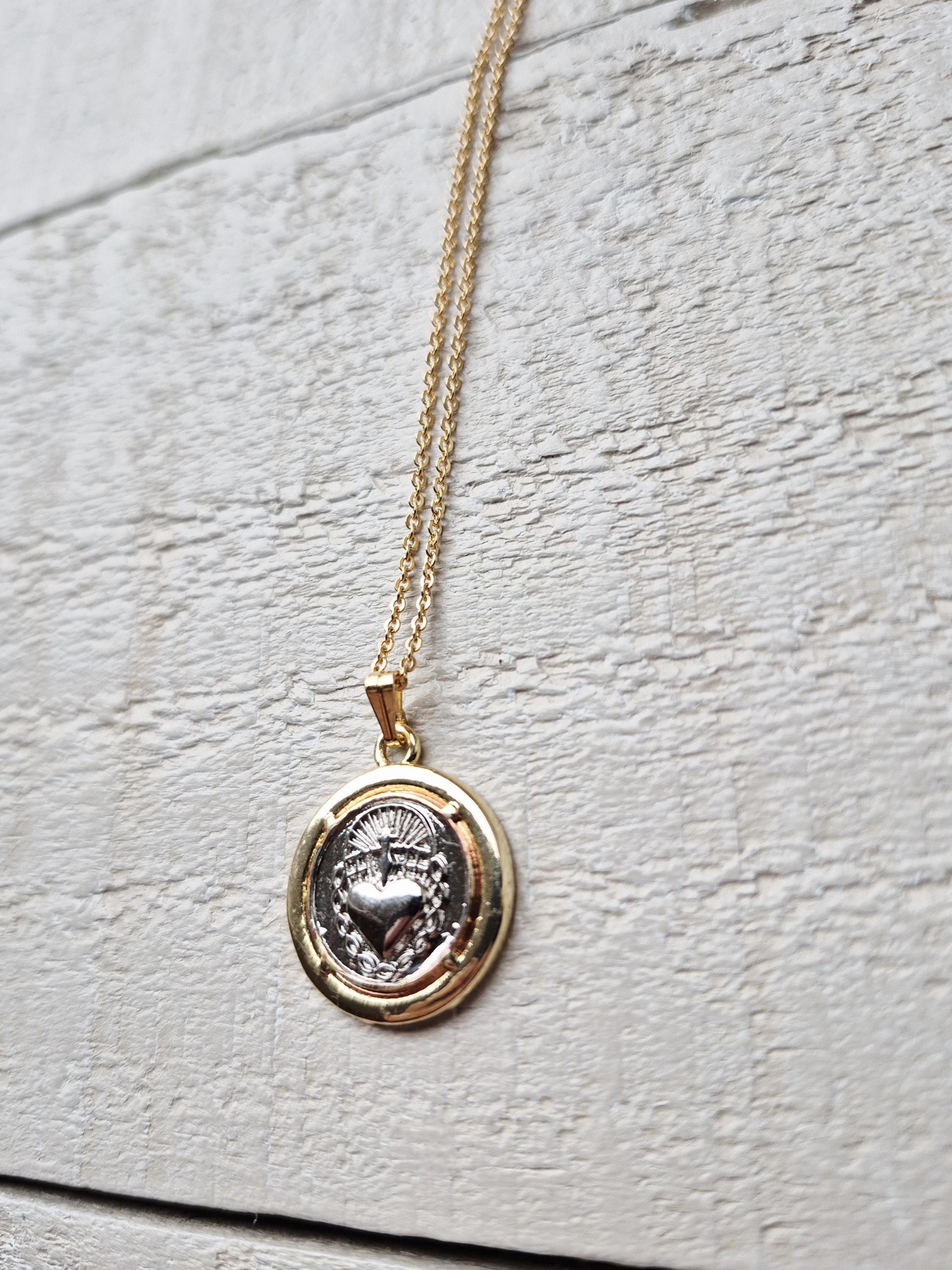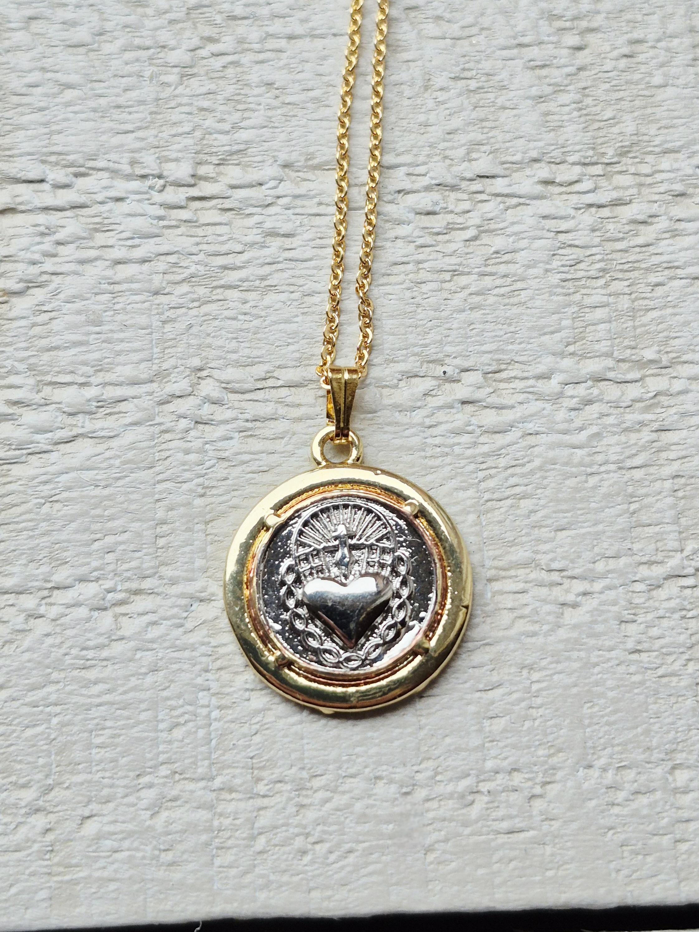 Pretty 2 tone gold and silver sacred heart pendant on a fine delicate chain. All 18k gold plated with lobster fastening