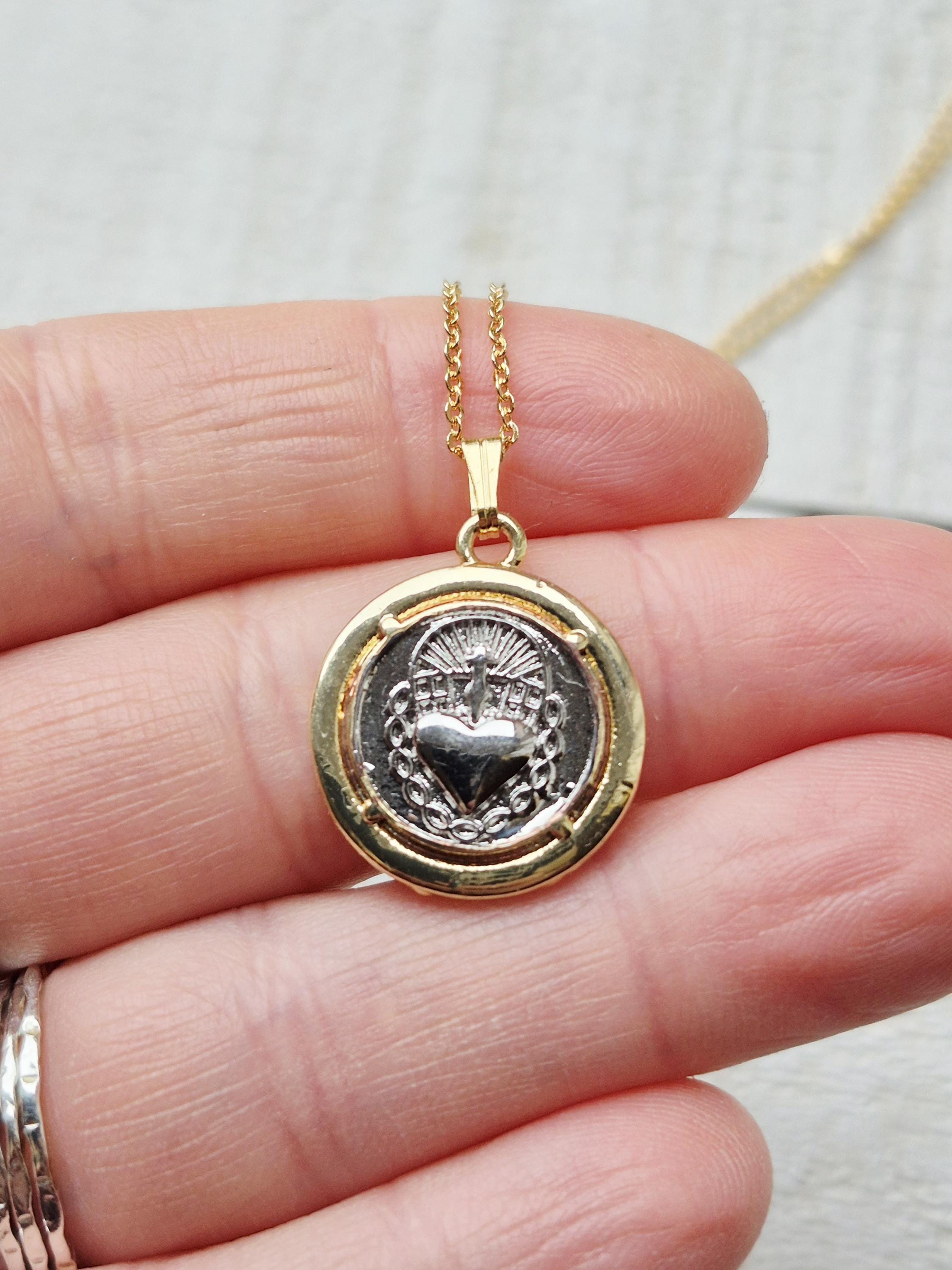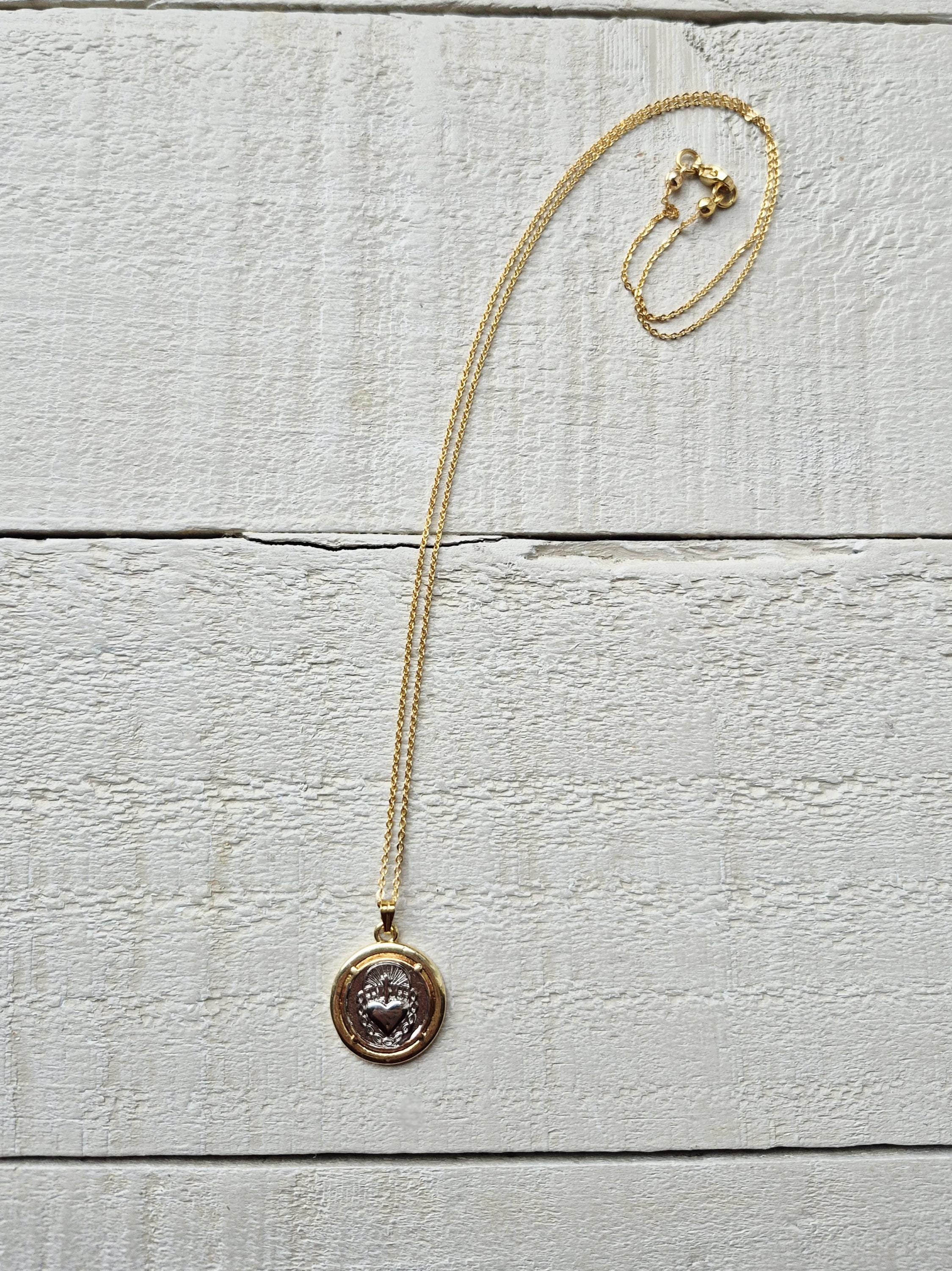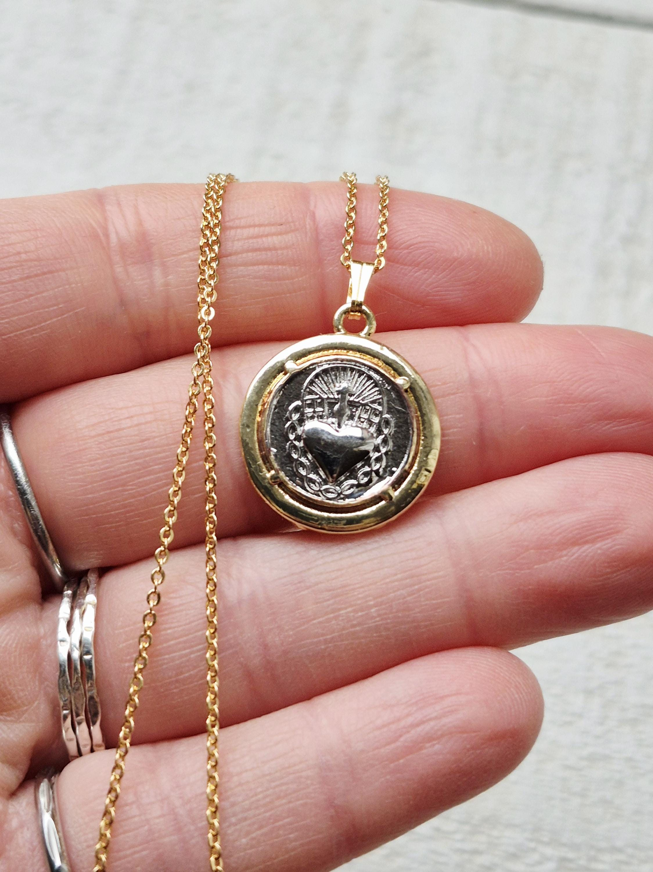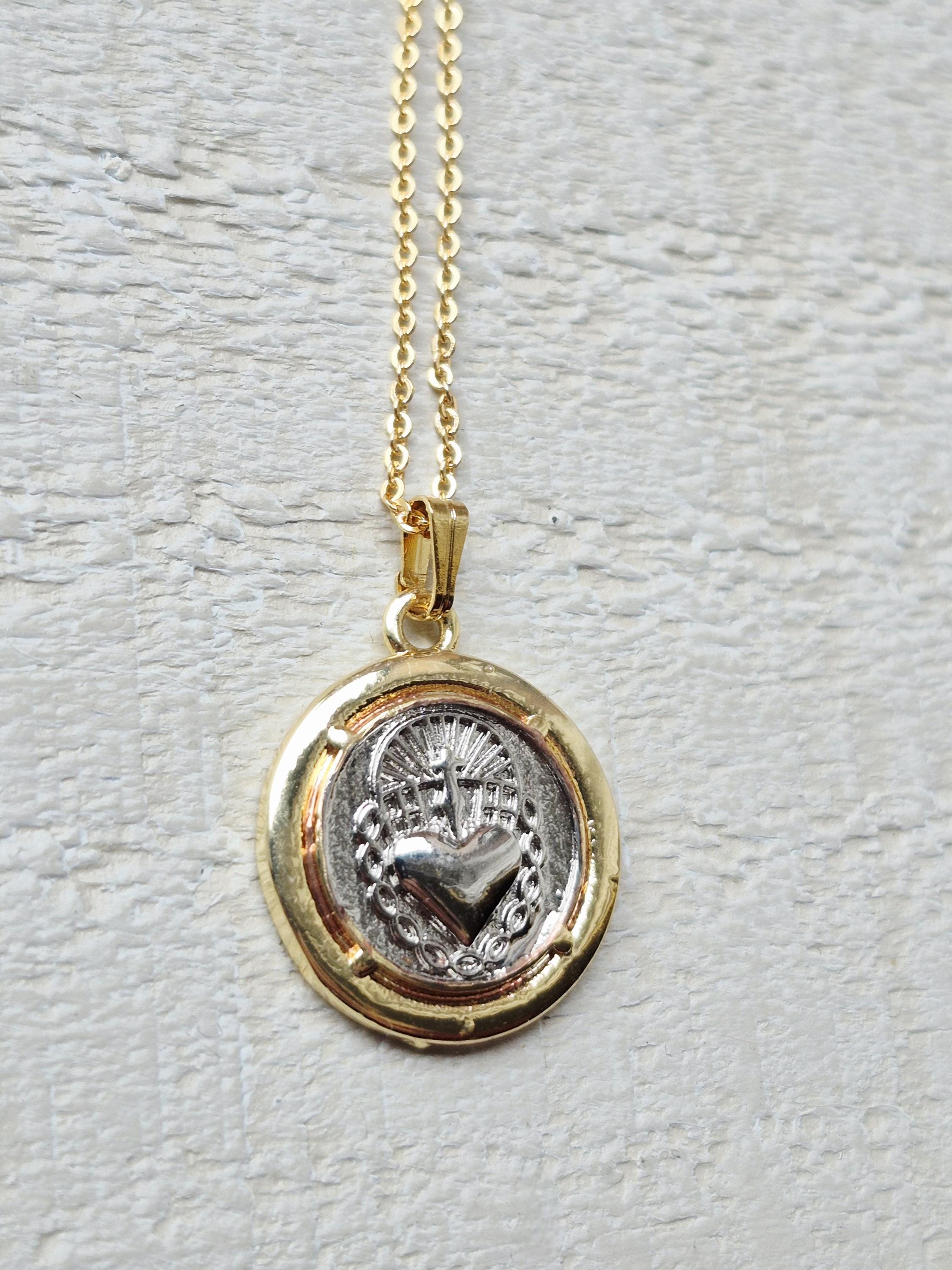Pretty 2 tone gold and silver sacred heart pendant on a fine delicate chain. All 18k gold plated with lobster fastening