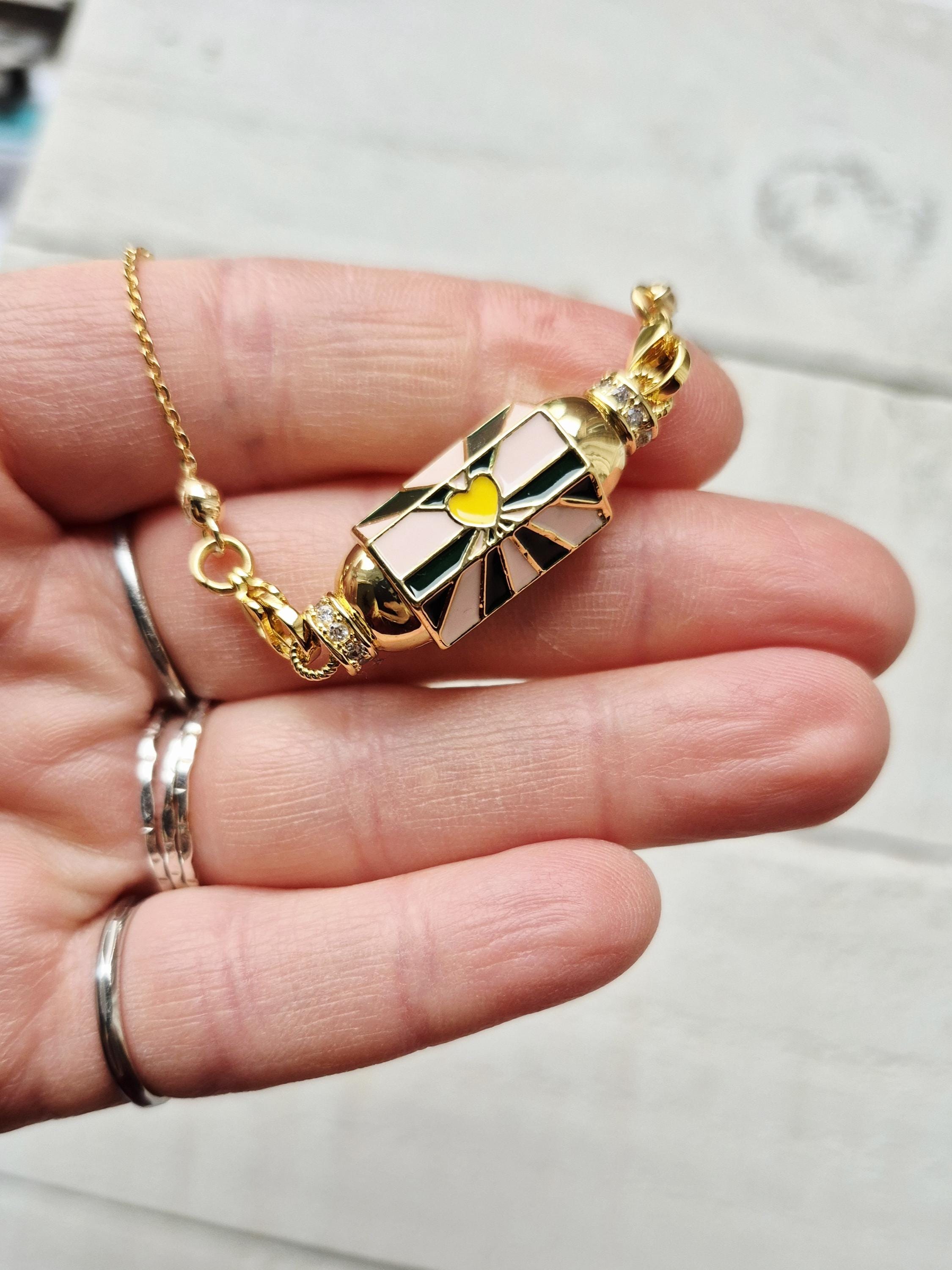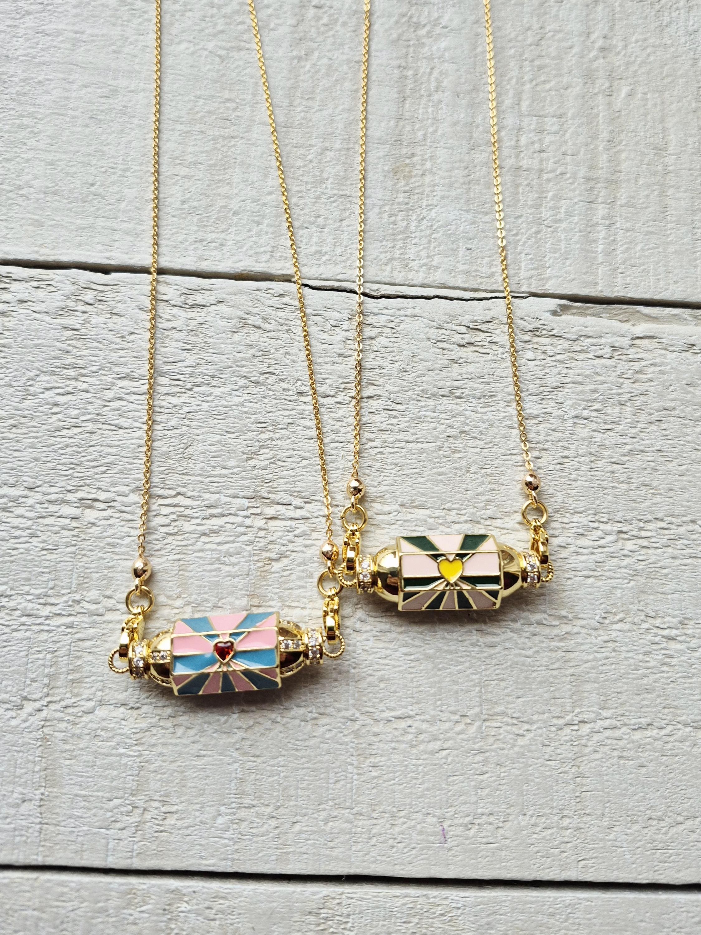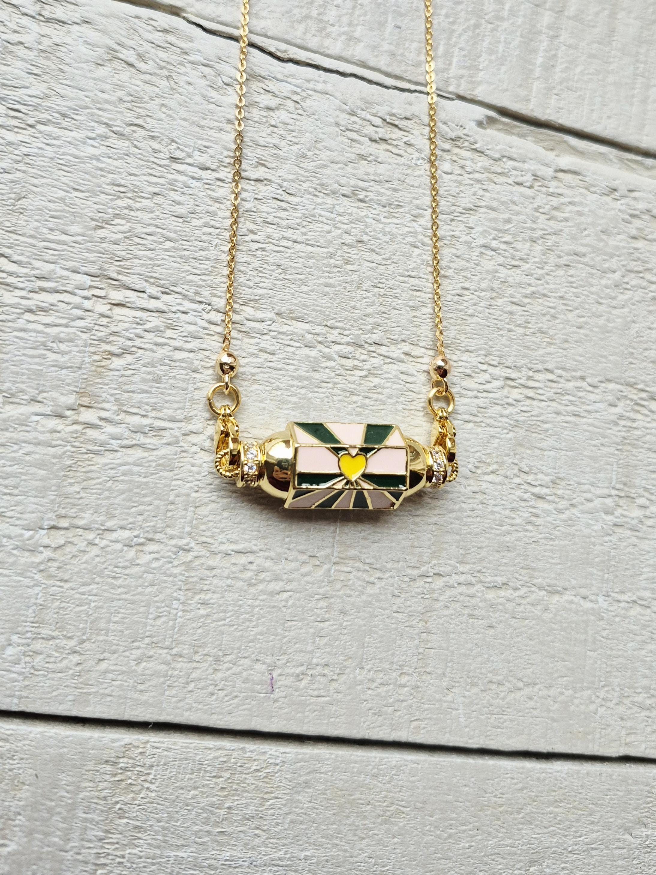Gorgeous barrel shaped enamel pendant with cz and heart detail on a fine chain.