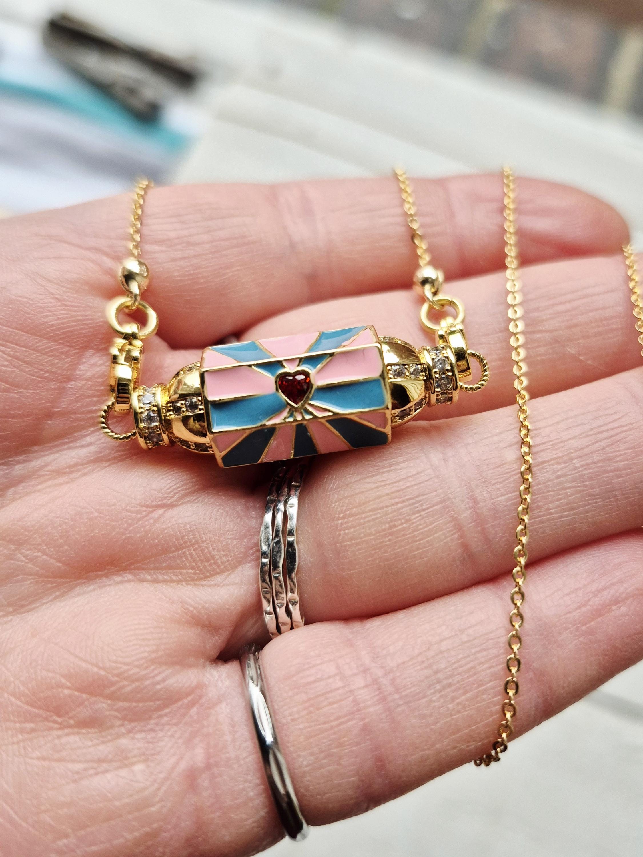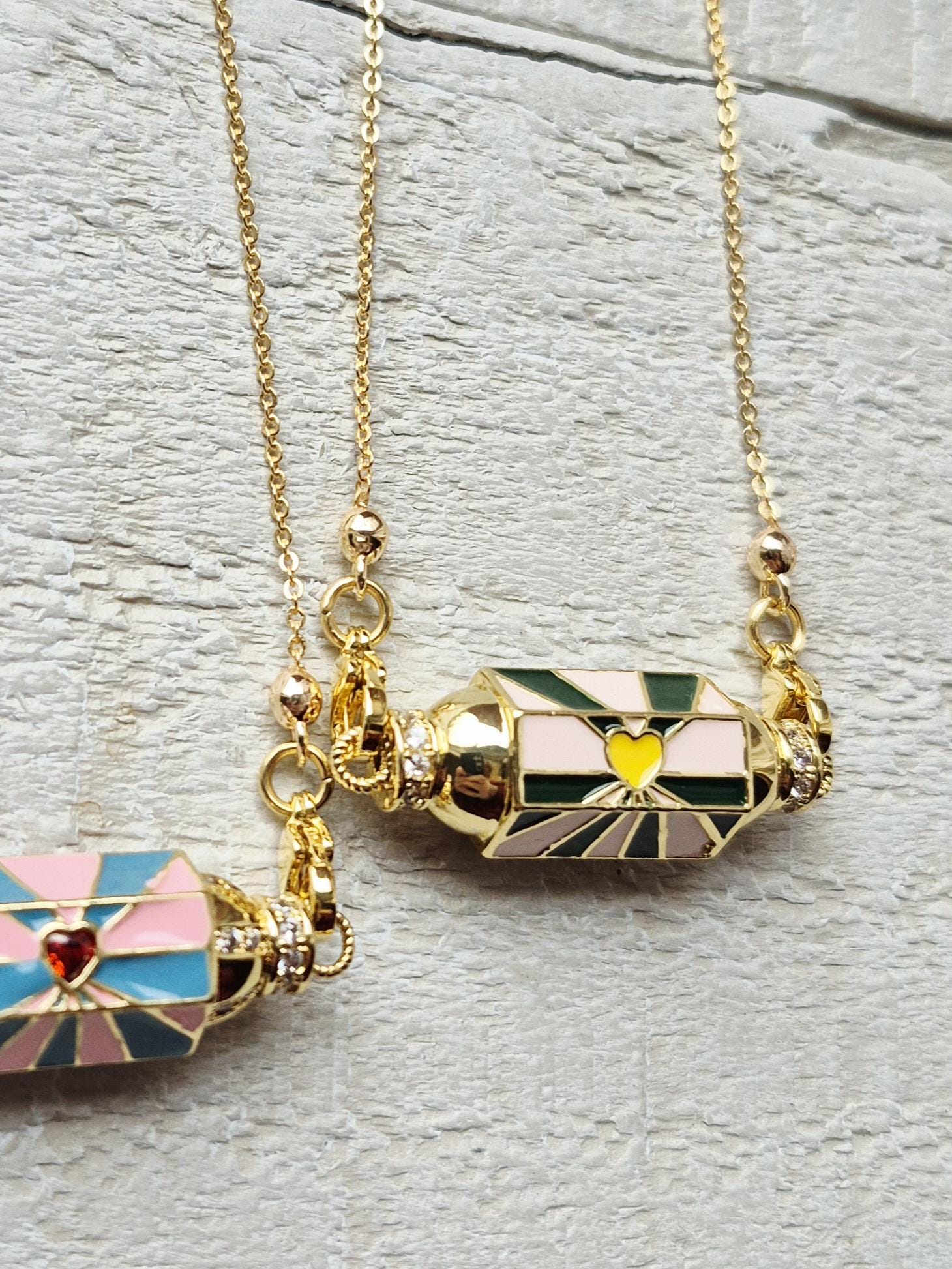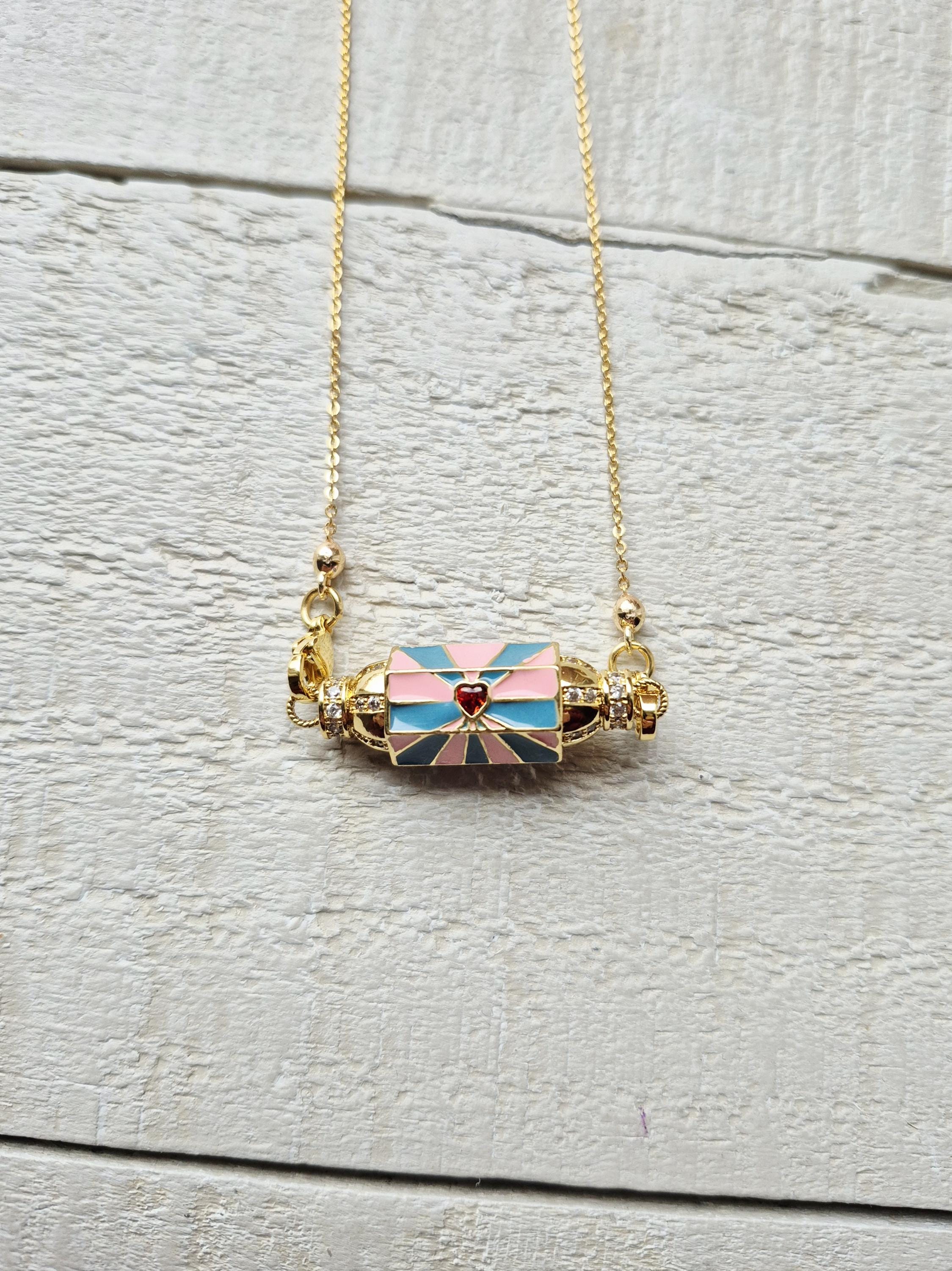 Gorgeous barrel shaped enamel pendant with cz and heart detail on a fine chain.