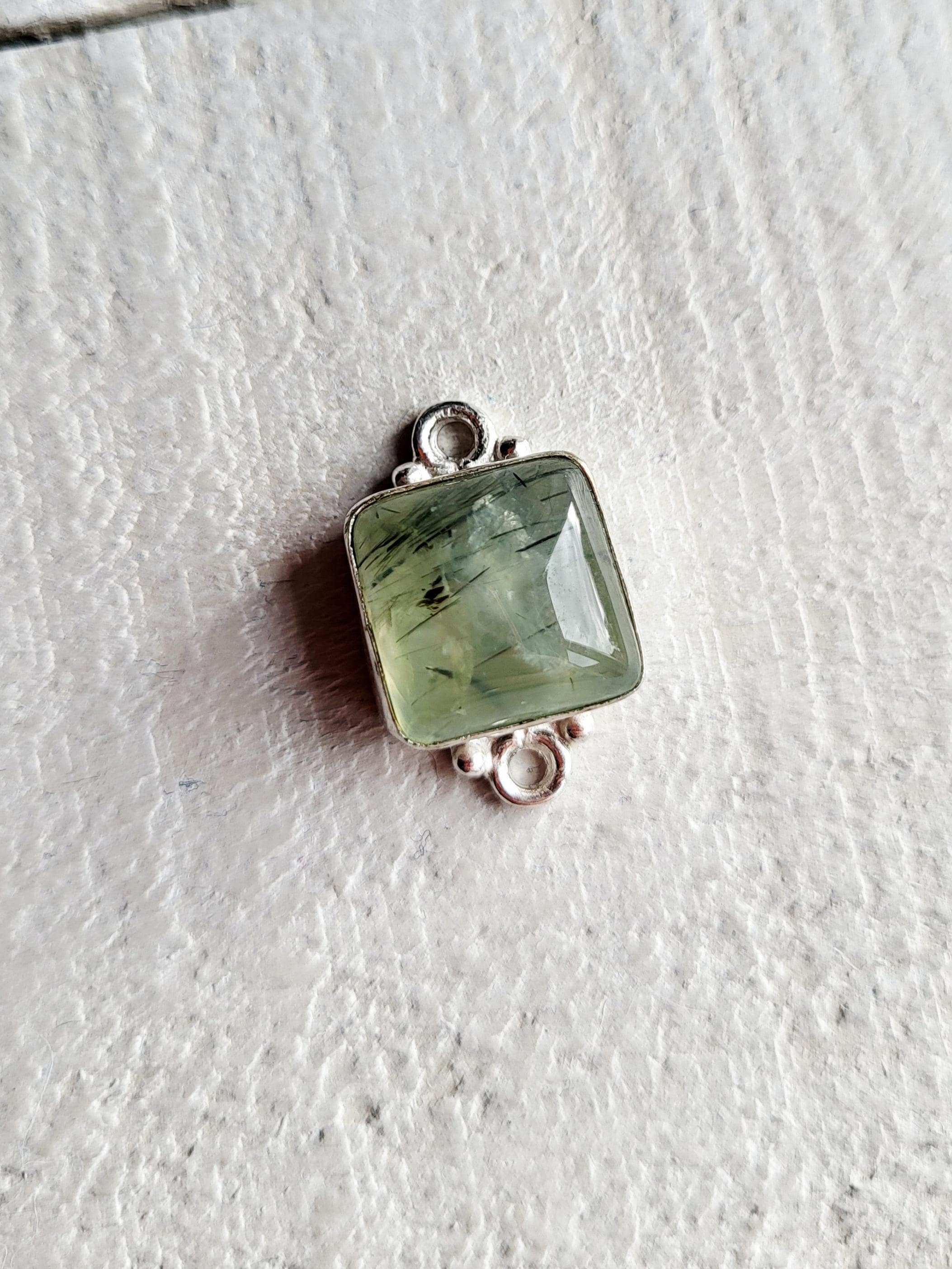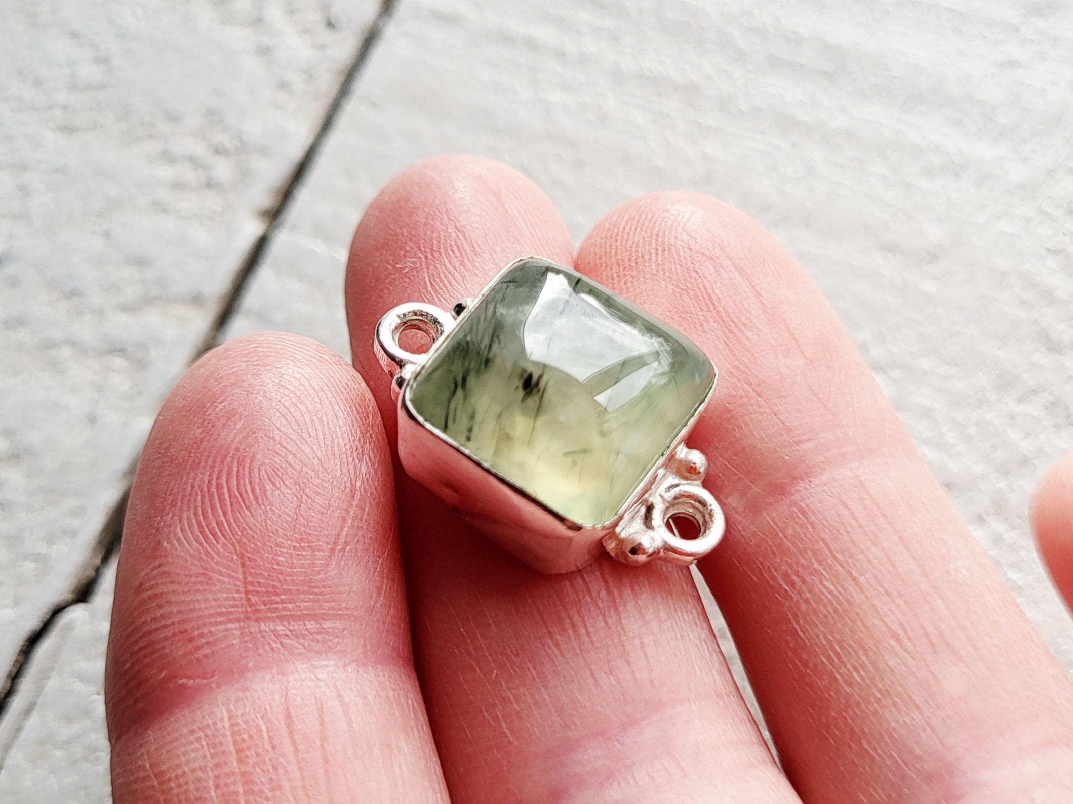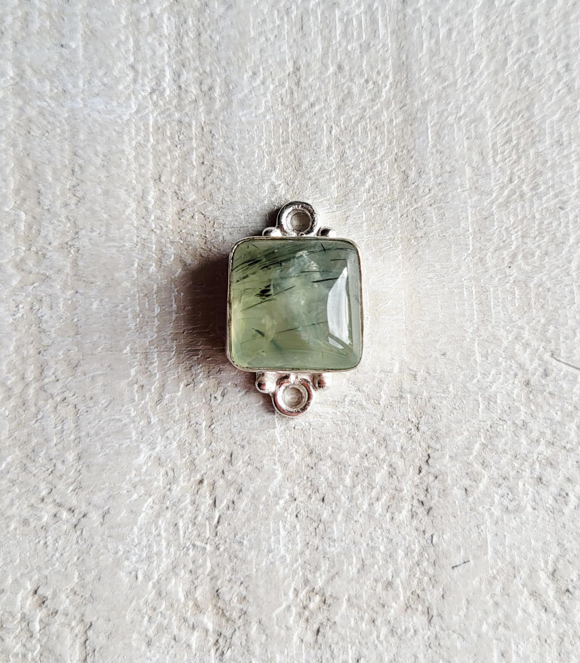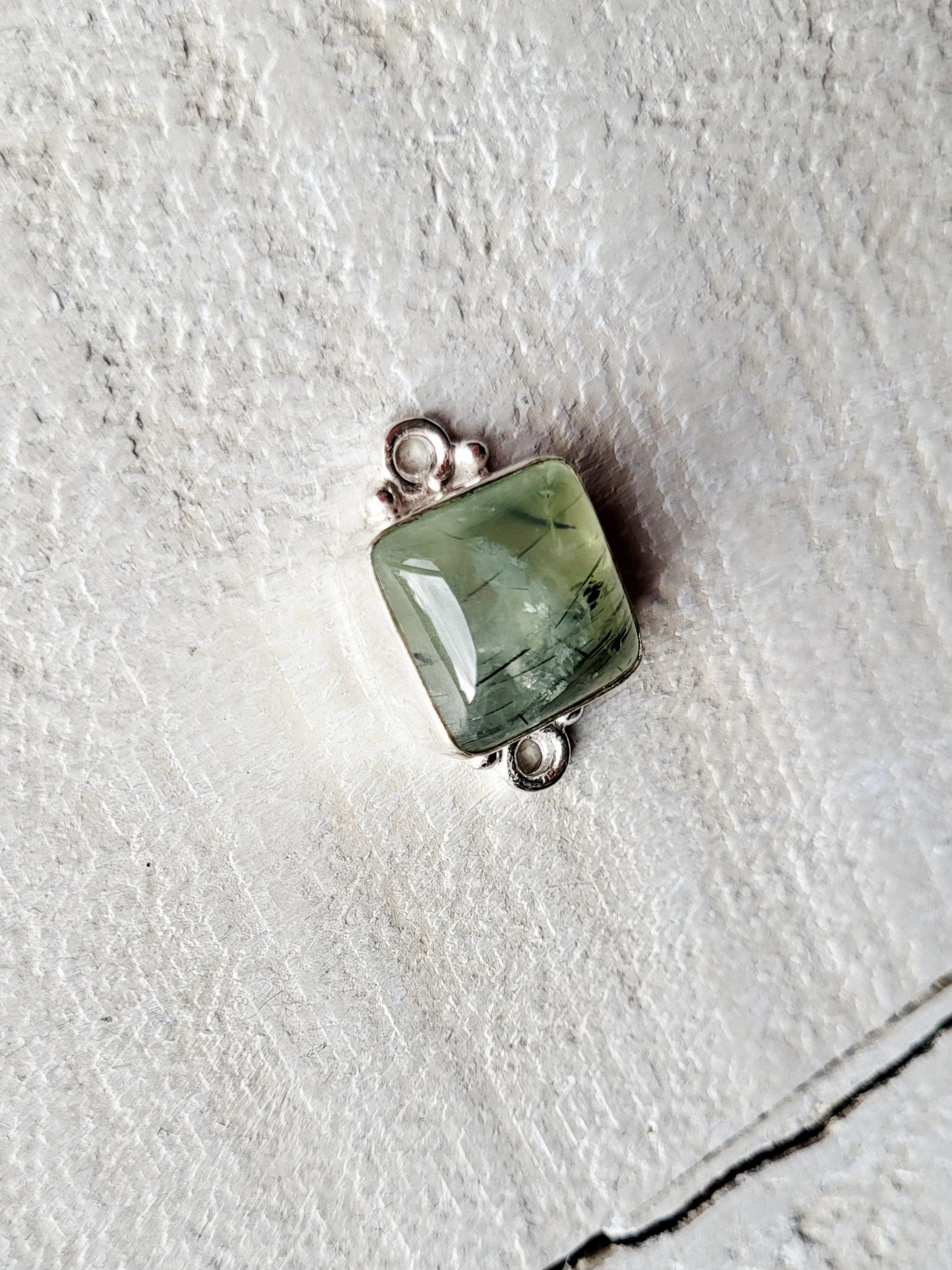 Prehnite gemstone square (ish) connector, smooth and polished in a 925 silver plated setting.