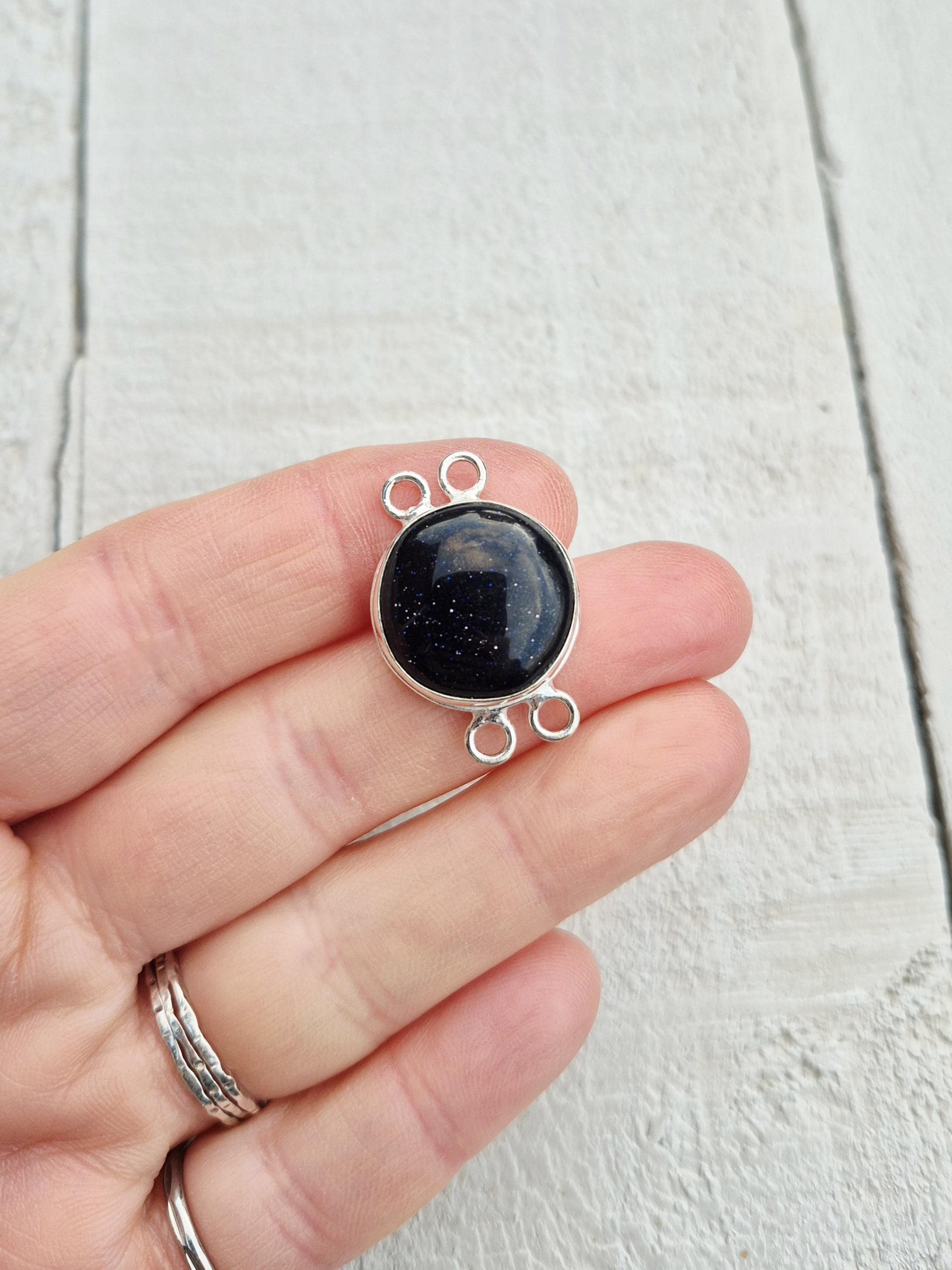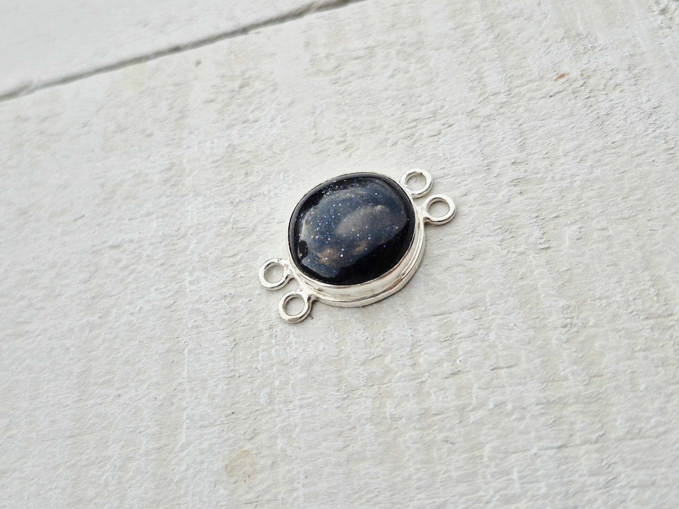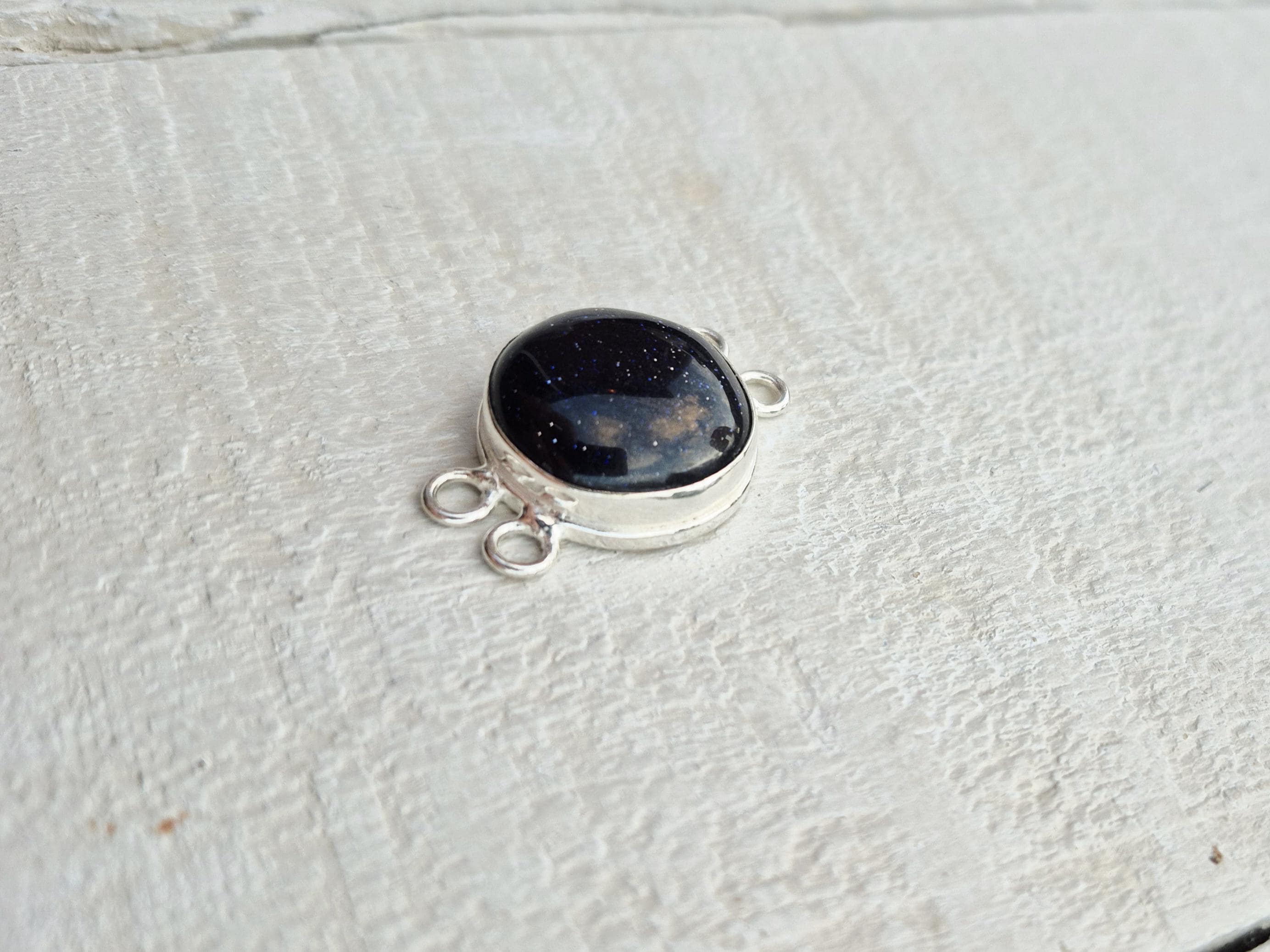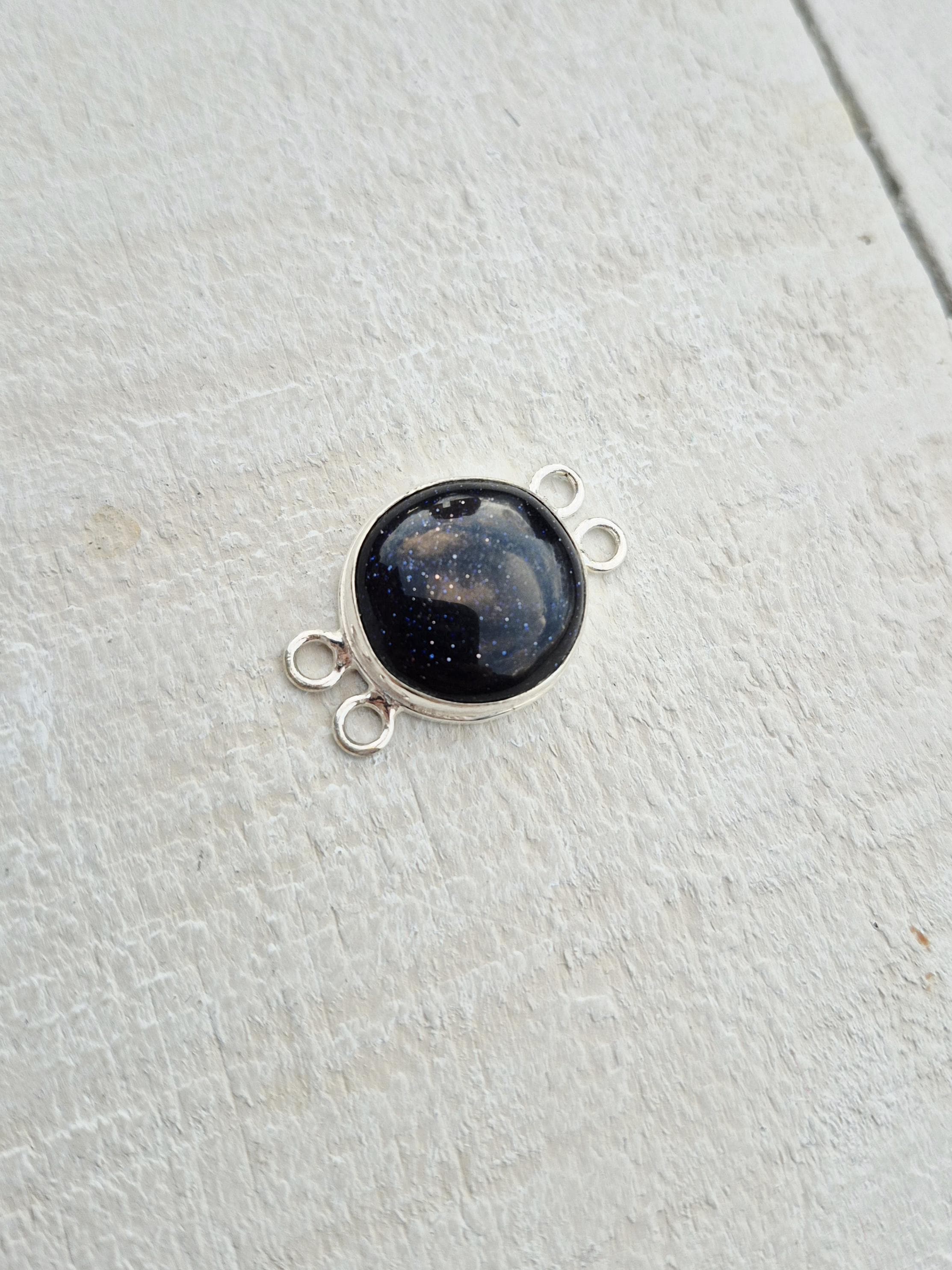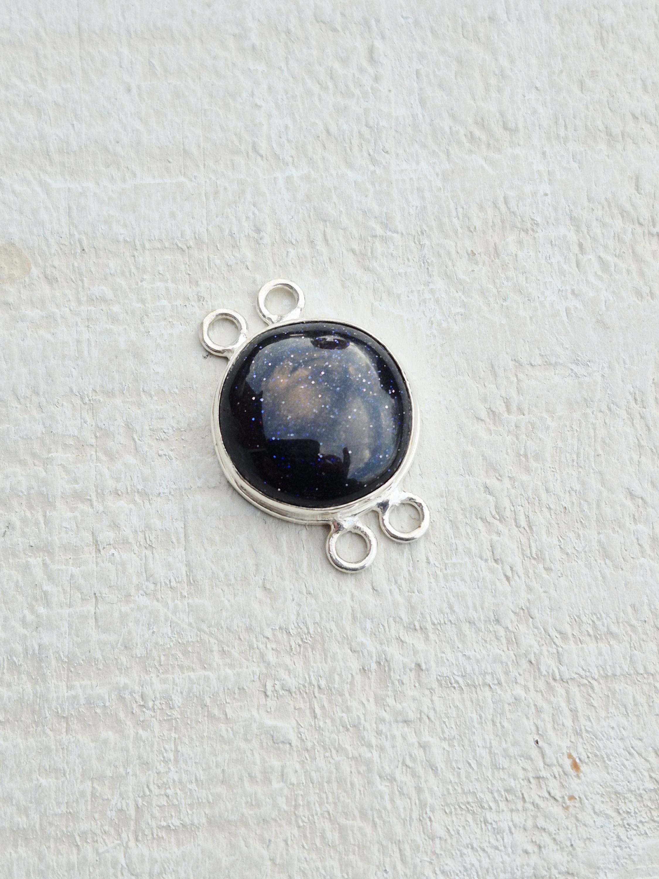 Blue goldstone is a synthetic gemstone. A round smooth polished 'stone' in 925 silver plated setting with 4 holes.