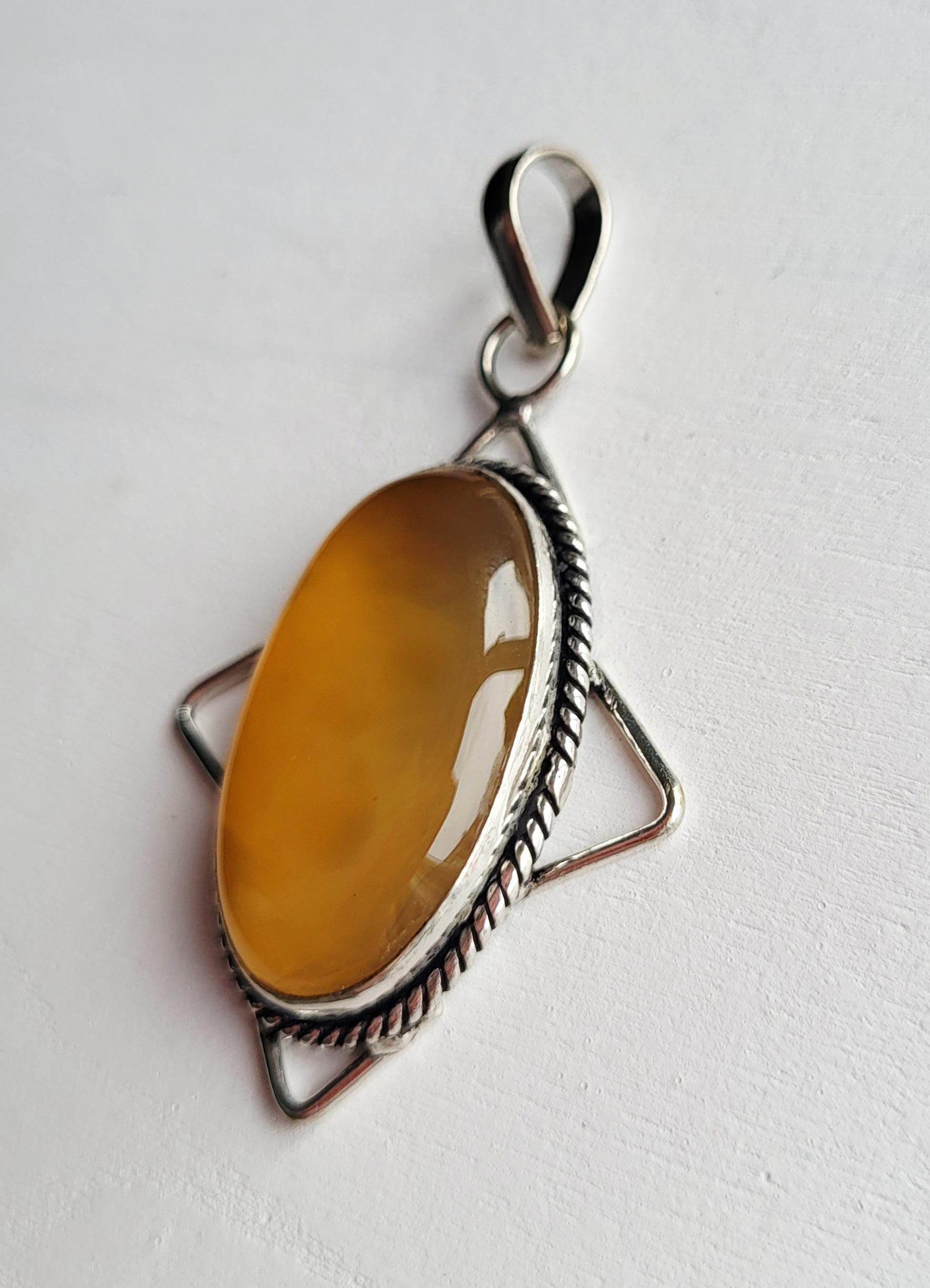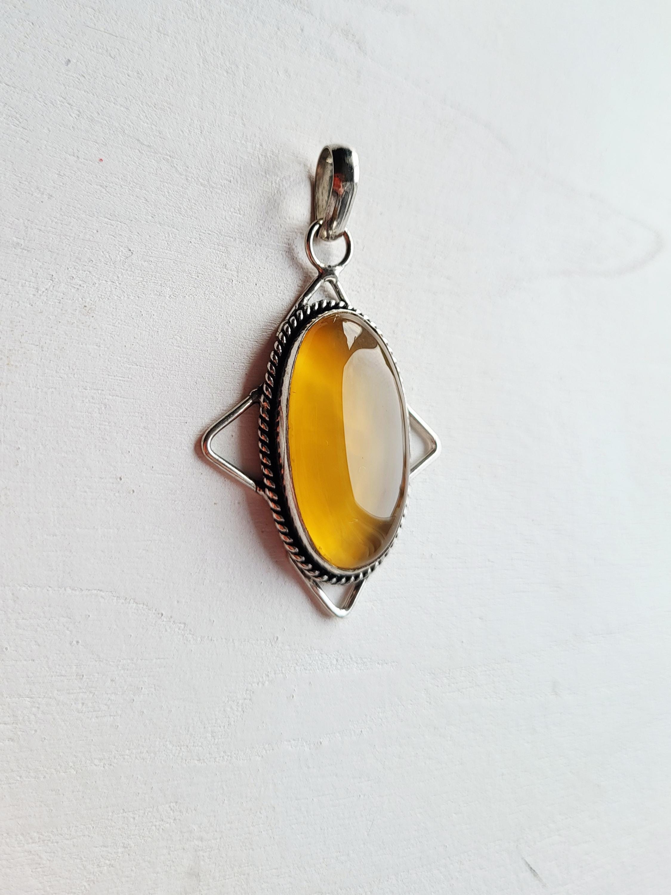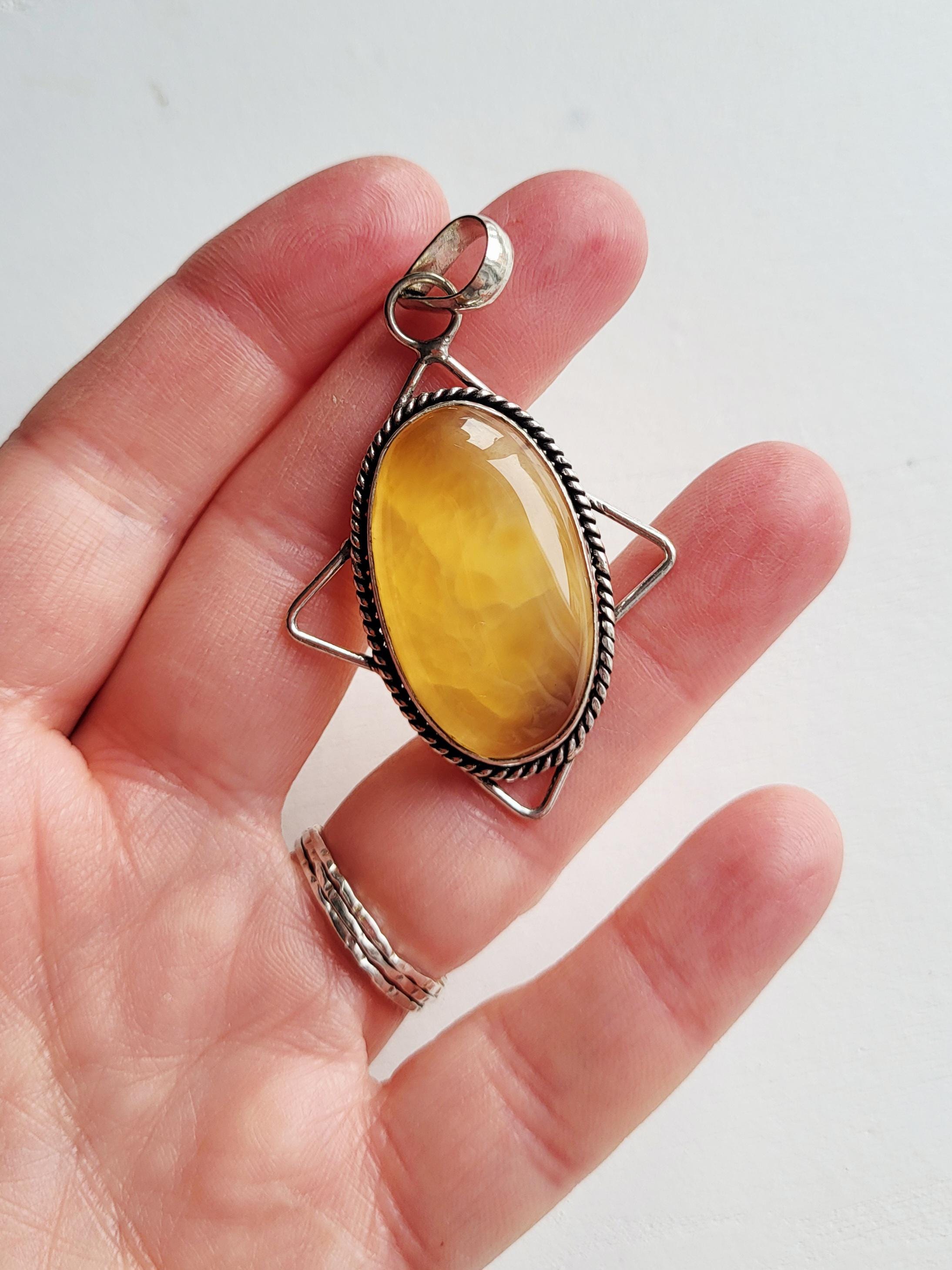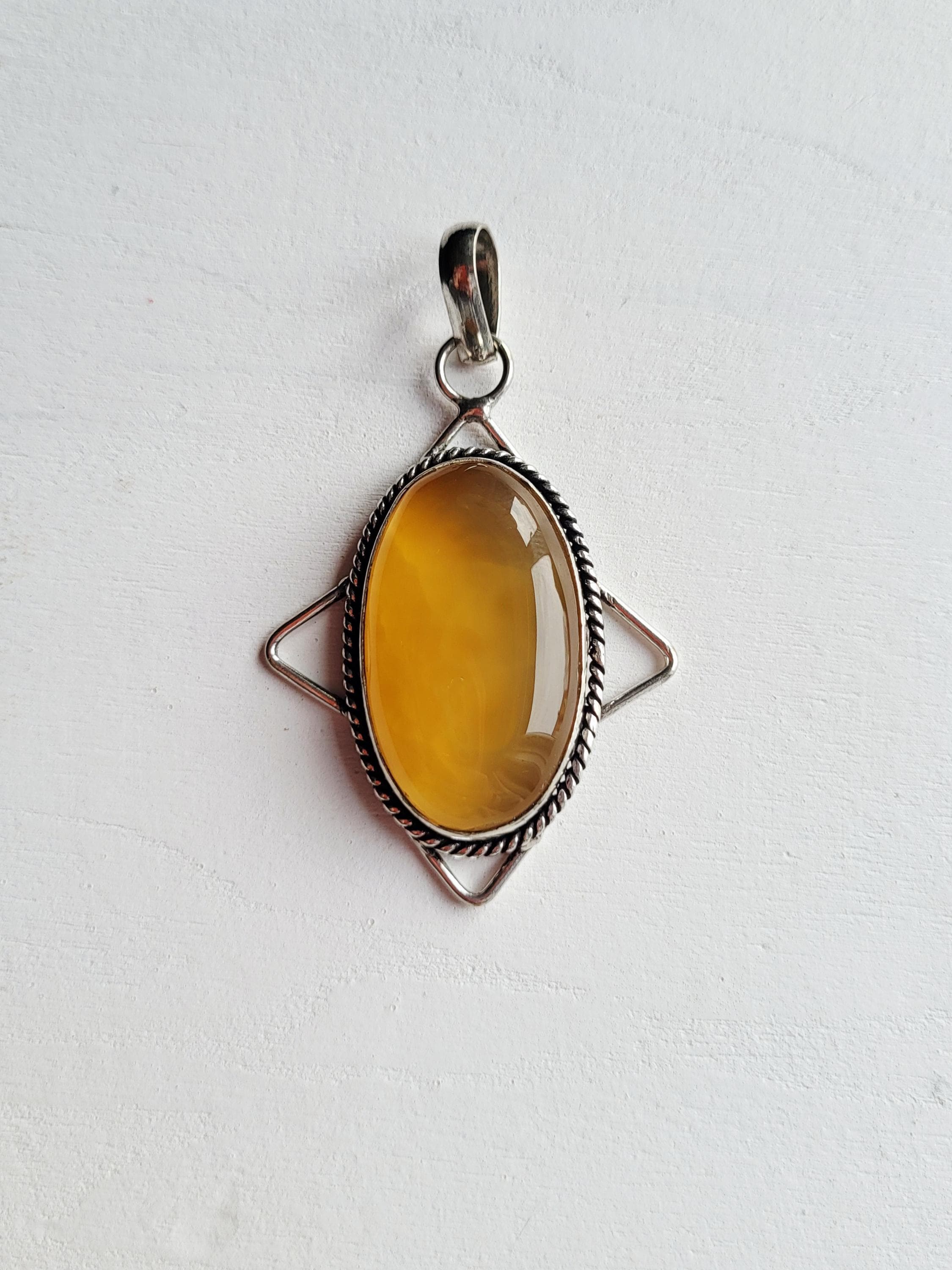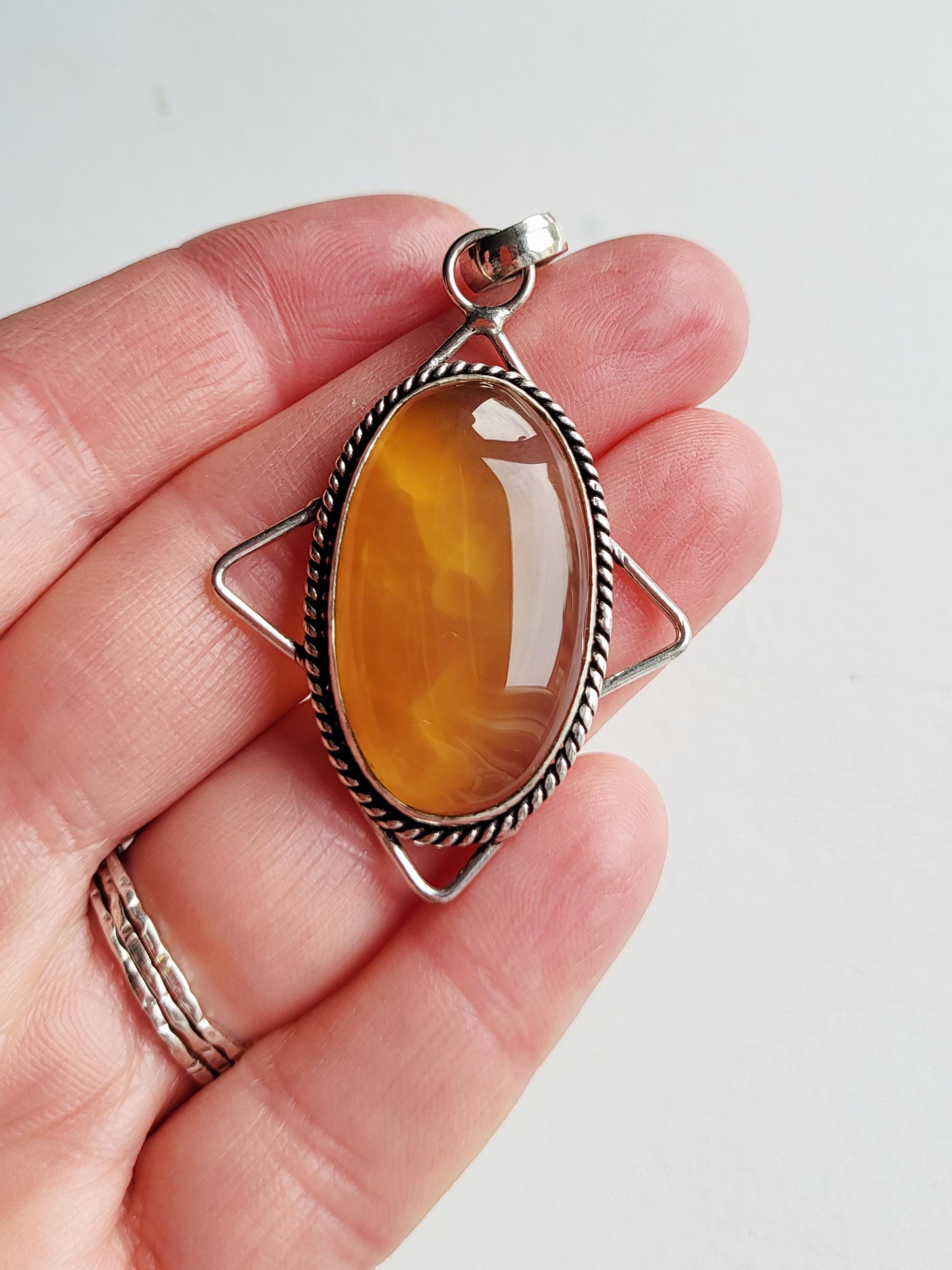 Lovely honey agate gemstone pendant. A smooth, polished stone set in a decorative setting.