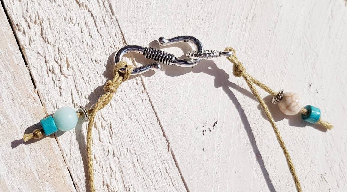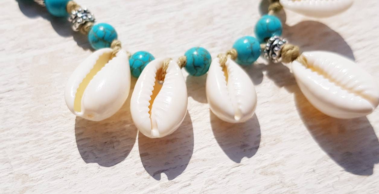 💙Beautiful Cowrie Shells and Turquoise Beads Necklace Choker...All hand knotted on waxed light brown cord so it's super strong and fastens at the back with an infinity hook.